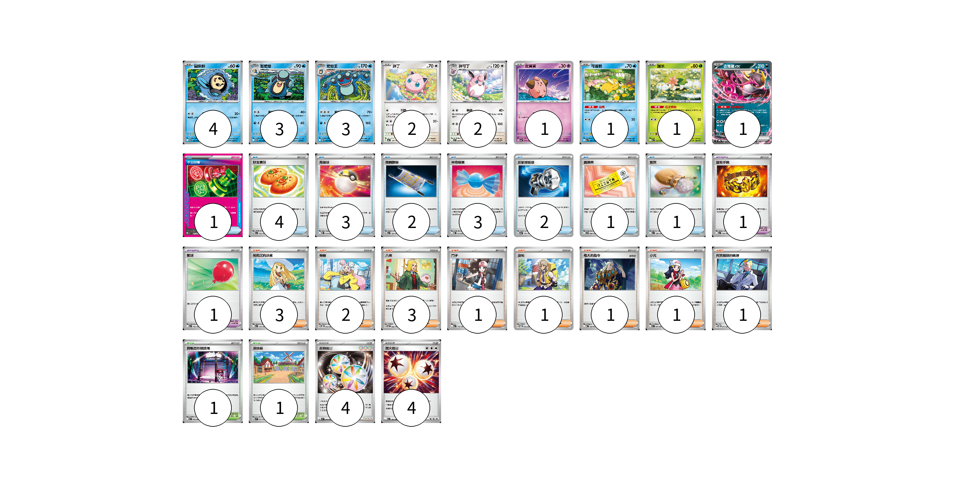 牌組構築方案 以此牌組為基礎新構築牌組 顯示卡面 顯示列表 寶可夢卡(18) 4 3 3 2 2 1 1 1 1 寶可夢道具(2) 1 1 物品卡(17) 1 4 3 2 3 2 1 1 支援者卡(13) 3 2 3 1 1 1 1 1 競技場卡(2) 1 1 能量卡(8) 4 4 寶可夢卡(18) 卡牌名稱 張數 卡牌名稱 張數 圓蝌蚪 SV11B 022/086 04 藍蟾蜍 SV11B 023/086 03 蟾蜍王 SV11B 024/086 03 胖丁 SV4a 140/190 02 胖可丁 M2 065/080 02 皮寶寶 SV4a 077/190 01 可達鴨 M2a 032/193 01 謝米 M2a 012/193 01 吉雉雞ex SVOD 004/020 01 寶可夢道具(2) 卡牌名稱 張數 卡牌名稱 張數 猛攻手鐲 M2a 166/193 01 氣球 M2a 165/193 01 物品卡(17) 卡牌名稱 張數 卡牌名稱 張數 不公印章 MBD 011/022 01 好友寶芬 M2a 153/193 04 高級球 MBD 014/022 03 夜間擔架 M2a 159/193 02 神奇糖果 MBG 013/022 03 反擊捕捉器 SV8a 139/187 02 調換票 SV9 090/100 01 聖灰 M2a 150/193 01 支援者卡(13) 卡牌名稱 張數 卡牌名稱 張數 莉莉艾的決意 M2a 175/193 03 奇樹 SVOD 016/020 02 八朔 SV6 098/101 03 鬥子 M2a 172/193 01 派帕 SVOD 018/020 01 老大的指令 MBD 020/022 01 小光 M2 077/080 01 阿克羅瑪的執著 SVOM 017/021 01 競技場卡(2) 卡牌名稱 張數 卡牌名稱 張數 對戰圓形競技場 M2 079/080 01 深缽鎮 SVK 039/042 01 能量卡(8) 卡牌名稱 張數 卡牌名稱 張數 反轉能量 SVK 041/042 04 燃火能量 M2a 191/193 04 以此牌組為基礎新構築牌組 牌組編碼 IKegUu-AOMuqy-TfyERu copy 列印牌組單 牌組編碼已複製 分享至SNS