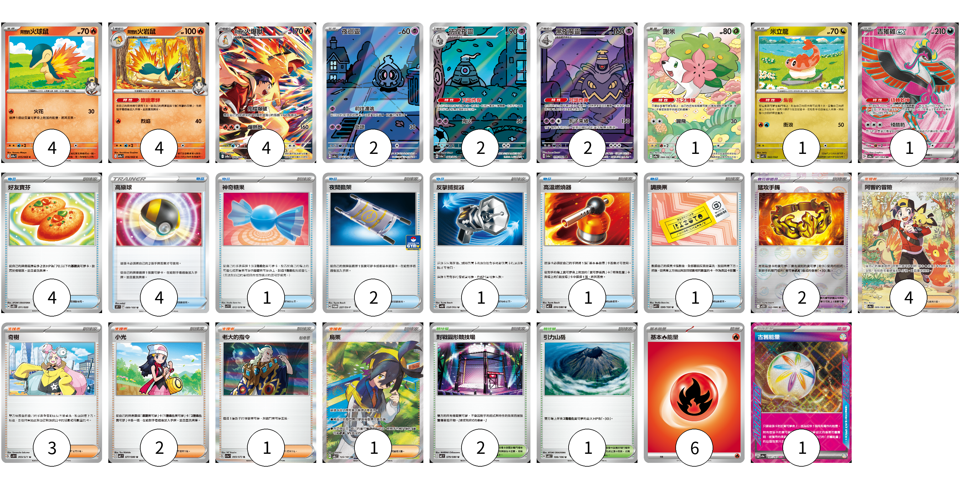 牌組構築方案 以此牌組為基礎新構築牌組 顯示卡面 顯示列表 寶可夢卡(21) 4 4 4 2 2 2 1 1 1 寶可夢道具(2) 2 物品卡(14) 4 4 1 2 1 1 1 支援者卡(11) 4 3 2 1 1 競技場卡(3) 2 1 能量卡(7) 6 1 寶可夢卡(21) 卡牌名稱 張數 卡牌名稱 張數 <阿響的>火球鼠 SV9a 015/063 04 <阿響的>火岩鼠 SV9a 016/063 04 <阿響的>火爆獸 SV9a 070/063 04 夜巡靈 SV6a 068/064 02 彷徨夜靈 SV6a 069/064 02 黑夜魔靈 SV6a 070/064 02 謝米 SV9a 066/063 01 米立龍 SVK 002/042 01 吉雉雞ex SV6a 081/064 01 寶可夢道具(2) 卡牌名稱 張數 卡牌名稱 張數 猛攻手鐲 SV11W 082/086 02 物品卡(14) 卡牌名稱 張數 卡牌名稱 張數 好友寶芬 SVOD 011/020 04 高級球 S9 089/100 04 神奇糖果 SV1V 072/078 01 夜間擔架 SV-P 227/SV-P 02 反擊捕捉器 SV4M 059/066 01 高溫燃燒器 M2 074/080 01 調換票 SV9 090/100 01 支援者卡(11) 卡牌名稱 張數 卡牌名稱 張數 阿響的冒險 SV9a 089/063 04 奇樹 SV2D 069/071 03 小光 M2 077/080 02 老大的指令 SV1a 069/073 01 烏栗 SV6 122/101 01 競技場卡(3) 卡牌名稱 張數 卡牌名稱 張數 對戰圓形競技場 M2 079/080 02 引力山岳 SV8 106/106 01 能量卡(7) 卡牌名稱 張數 卡牌名稱 張數 基本火能量 sv-p FIR 06 古舊能量 SV8a 187/187 01 以此牌組為基礎新構築牌組 牌組編碼 ILrsVt-JYArhT-wMUoqW copy 列印牌組單 牌組編碼已複製 分享至SNS