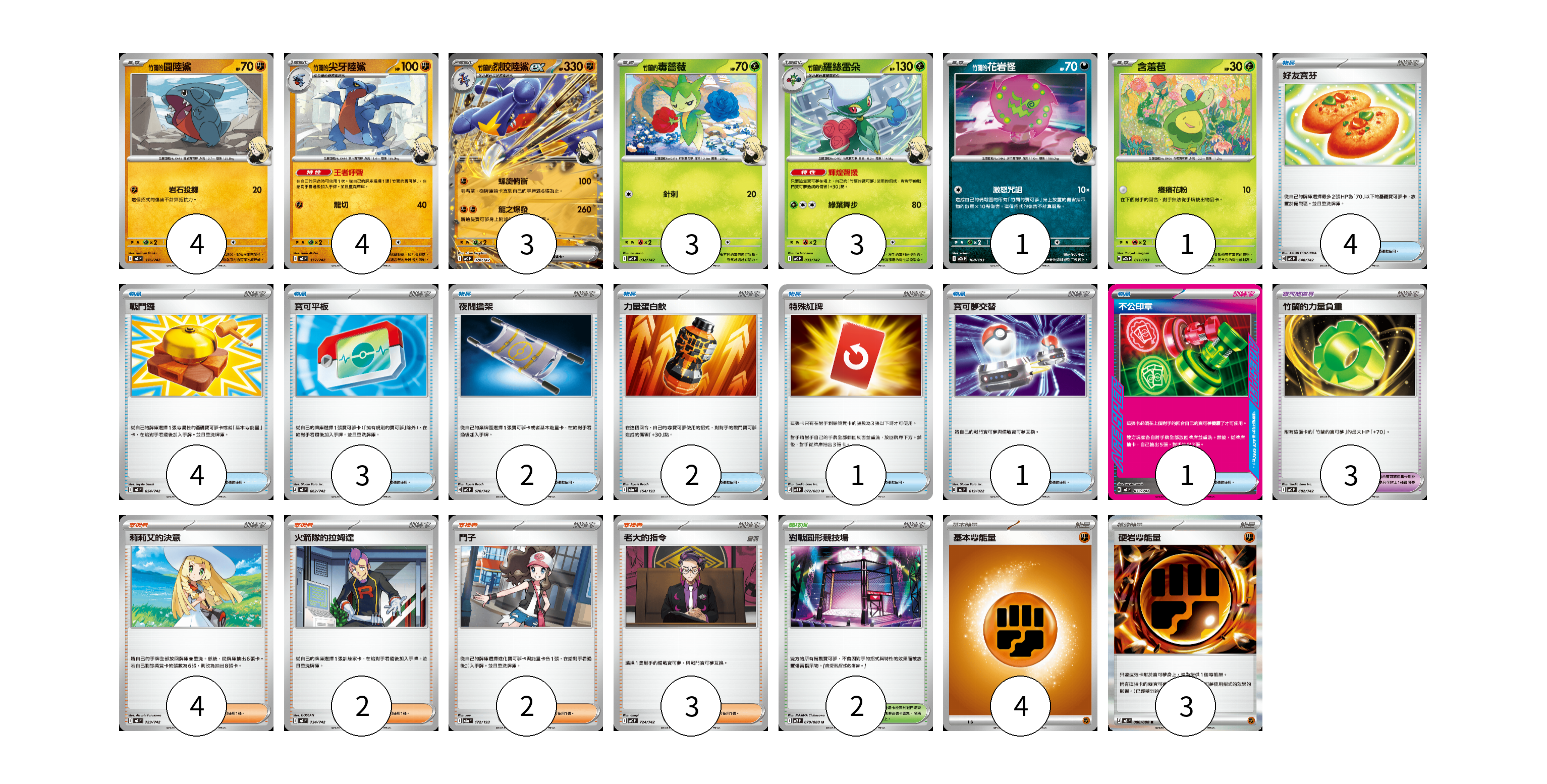 牌組構築方案 以此牌組為基礎新構築牌組 顯示卡面 顯示列表 寶可夢卡(19) 4 4 3 3 3 1 1 寶可夢道具(3) 3 物品卡(18) 4 4 3 2 2 1 1 1 支援者卡(11) 4 2 2 3 競技場卡(2) 2 能量卡(7) 4 3 寶可夢卡(19) 卡牌名稱 張數 卡牌名稱 張數 <竹蘭的>圓陸鯊 MC 376/742 04 <竹蘭的>尖牙陸鯊 MC 377/742 04 <竹蘭的>烈咬陸鯊ex MC 378/742 03 竹蘭的毒薔薇 MC 032/742 03 <竹蘭的>羅絲雷朵 MC 033/742 03 <竹蘭的>花岩怪 M2a 108/193 01 含羞苞 M2a 011/193 01 寶可夢道具(3) 卡牌名稱 張數 卡牌名稱 張數 竹蘭的力量負重 MC 682/742 03 物品卡(18) 卡牌名稱 張數 卡牌名稱 張數 好友寶芬 MC 648/742 04 戰鬥鑼 MC 654/742 04 寶可平板 MC 662/742 03 夜間擔架 MC 670/742 02 力量蛋白飲 M2a 154/193 02 特殊紅牌 M4 072/083 01 寶可夢交替 MJ 019/022 01 不公印章 MC 633/742 01 支援者卡(11) 卡牌名稱 張數 卡牌名稱 張數 莉莉艾的決意 MC 729/742 04 火箭隊的拉姆達 MC 734/742 02 鬥子 M2a 172/193 02 老大的指令 MC 724/742 03 競技場卡(2) 卡牌名稱 張數 卡牌名稱 張數 對戰圓形競技場 M2 079/080 02 能量卡(7) 卡牌名稱 張數 卡牌名稱 張數 基本【鬥】能量 MC FIG 04 硬岩【鬥】能量 M3 080/080 03 以此牌組為基礎新構築牌組 牌組編碼 ILzrTo-ChRcBM-uoPmZx copy 列印牌組單 牌組編碼已複製 分享至SNS