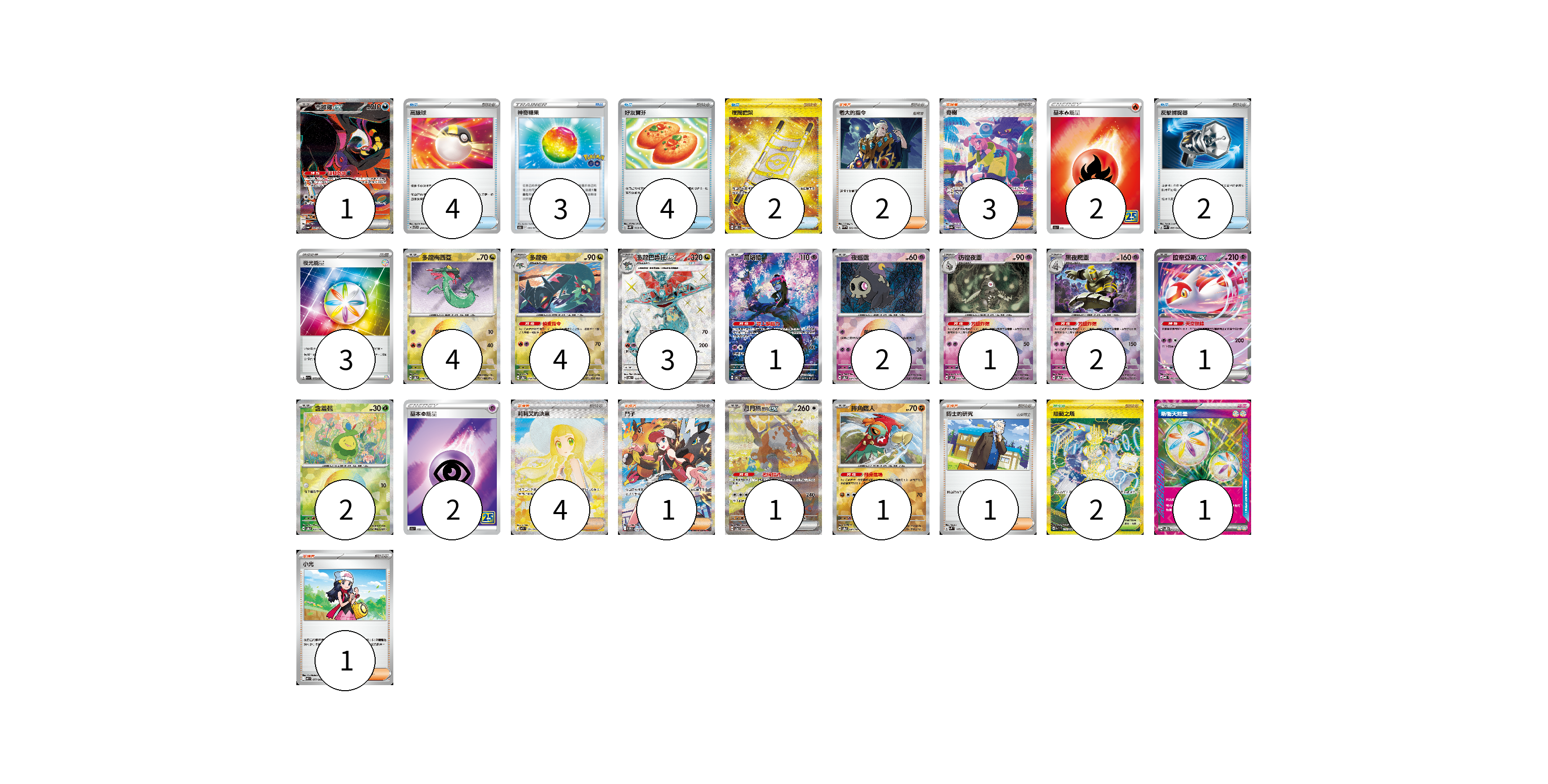 牌組構築方案 以此牌組為基礎新構築牌組 顯示卡面 顯示列表 寶可夢卡(23) 1 4 4 3 1 2 1 2 1 2 1 1 物品卡(15) 4 3 4 2 2 支援者卡(12) 2 3 4 1 1 1 競技場卡(2) 2 能量卡(8) 2 3 2 1 寶可夢卡(23) 卡牌名稱 張數 卡牌名稱 張數 吉雉雞ex SV6a 089/064 01 多龍梅西亞 SV8a 118/187 04 多龍奇 SV8a 119/187 04 多龍巴魯托ex SV6 120/101 03 願增猿 SV6 107/101 01 夜巡靈 SV8a 064/187 02 彷徨夜靈 SV8a 065/187 01 黑夜魔靈 SV8a 066/187 02 拉帝亞斯ex MBD 003/022 01 含羞苞 SV8a 001/187 02 月月熊 赫月 ex SV5a 091/066 01 摔角鷹人 SV8a 084/187 01 物品卡(15) 卡牌名稱 張數 卡牌名稱 張數 高級球 SVTR 014/021 04 神奇糖果 S10b 066/071 03 好友寶芬 SV5K 063/071 04 夜間擔架 SV8 137/106 02 反擊捕捉器 SVK 009/042 02 支援者卡(12) 卡牌名稱 張數 卡牌名稱 張數 老大的指令 SVHM 022/022 02 奇樹 SV4a 350/190 03 莉莉艾的決意 M1L 091/063 04 鬥子 SV11W 173/086 01 博士的研究 SVM 165/175 01 小光 M2 077/080 01 競技場卡(2) 卡牌名稱 張數 卡牌名稱 張數 阻礙之塔 SV10 132/098 02 能量卡(8) 卡牌名稱 張數 卡牌名稱 張數 基本火能量 S8a FIR 02 夜光能量 SV1a 073/073 03 基本超能量 S8a PSY 02 新衝天能量 SV5K 071/071 01 以此牌組為基礎新構築牌組 牌組編碼 IMFsJp-wSdVQN-cXhCvY copy 列印牌組單 牌組編碼已複製 分享至SNS