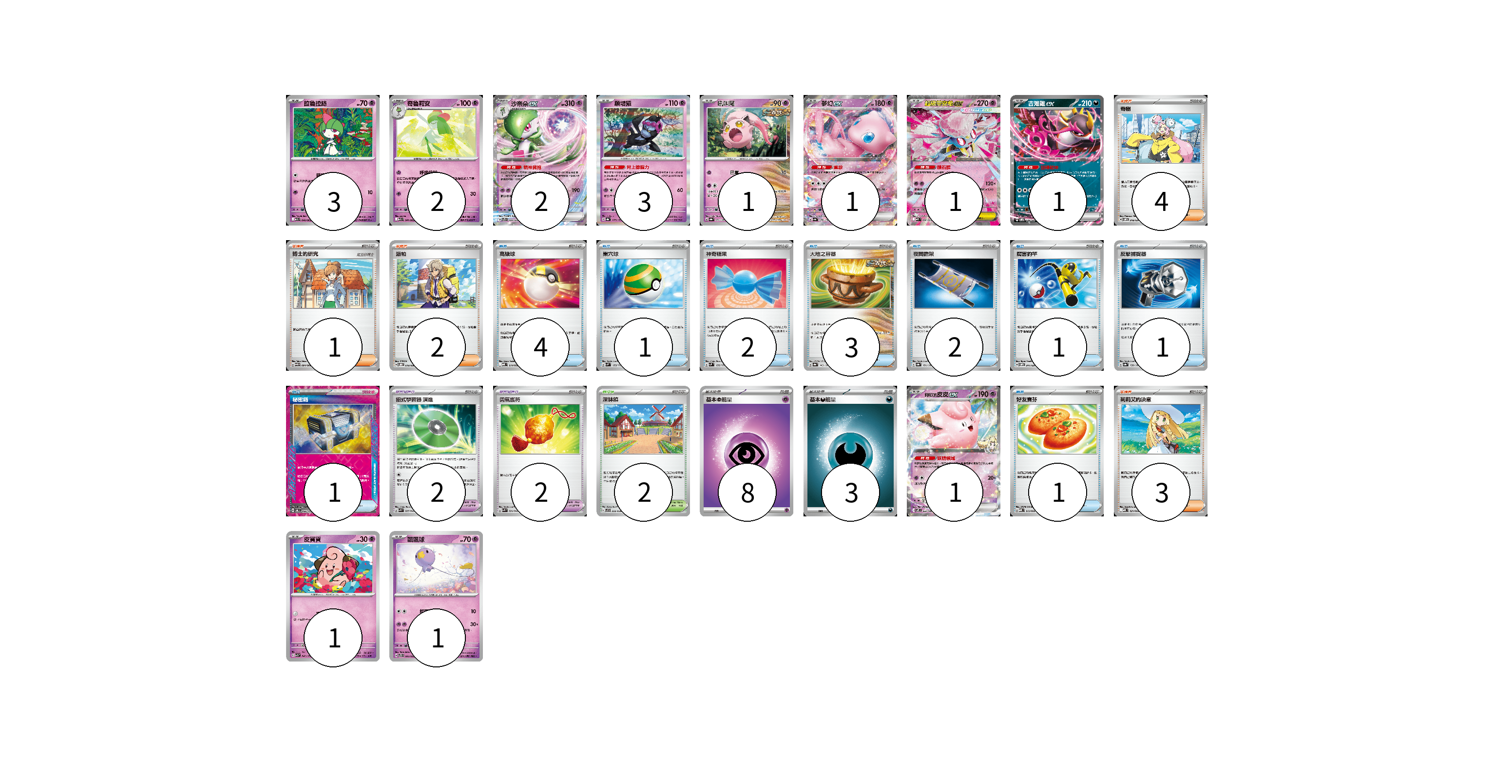 牌組構築方案 以此牌組為基礎新構築牌組 顯示卡面 顯示列表 寶可夢卡(17) 3 2 2 3 1 1 1 1 1 1 1 寶可夢道具(4) 2 2 物品卡(16) 4 1 2 3 2 1 1 1 1 支援者卡(10) 4 1 2 3 競技場卡(2) 2 能量卡(11) 8 3 寶可夢卡(17) 卡牌名稱 張數 卡牌名稱 張數 拉魯拉絲 M1S 040/063 03 奇魯莉安 M1S 041/063 02 沙奈朵ex SVTS 004/022 02 願增猿 SV8a 075/187 03 吼叫尾 SV8a 071/187 01 夢幻ex SV4a 076/190 01 超級蒂安希ex MBD 006/022 01 吉雉雞ex SVOM 009/021 01 莉莉艾的皮皮ex SV9 033/100 01 皮寶寶 SV3 042/108 01 飄飄球 SVTS 005/022 01 寶可夢道具(4) 卡牌名稱 張數 卡牌名稱 張數 招式學習器 演進 SVK 025/042 02 勇氣護符 SVK 024/042 02 物品卡(16) 卡牌名稱 張數 卡牌名稱 張數 高級球 MBD 014/022 04 巢穴球 SVM 133/175 01 神奇糖果 SVM 135/175 02 大地之容器 SV8a 143/187 03 夜間擔架 SV8a 151/187 02 厲害釣竿 SVOM 011/021 01 反擊捕捉器 SV8a 139/187 01 秘密箱 SV6 092/101 01 好友寶芬 MBD 013/022 01 支援者卡(10) 卡牌名稱 張數 卡牌名稱 張數 奇樹 SVOM 018/021 04 博士的研究 SV11B 084/086 01 派帕 SVOD 018/020 02 莉莉艾的決意 MBD 021/022 03 競技場卡(2) 卡牌名稱 張數 卡牌名稱 張數 深缽鎮 SVF 036/038 02 能量卡(11) 卡牌名稱 張數 卡牌名稱 張數 基本【超】能量 M-P PSY 08 基本【惡】能量 M-P DAR 03 以此牌組為基礎新構築牌組 牌組編碼 IOXlHA-QfErHl-XvrNKR copy 列印牌組單 牌組編碼已複製 分享至SNS