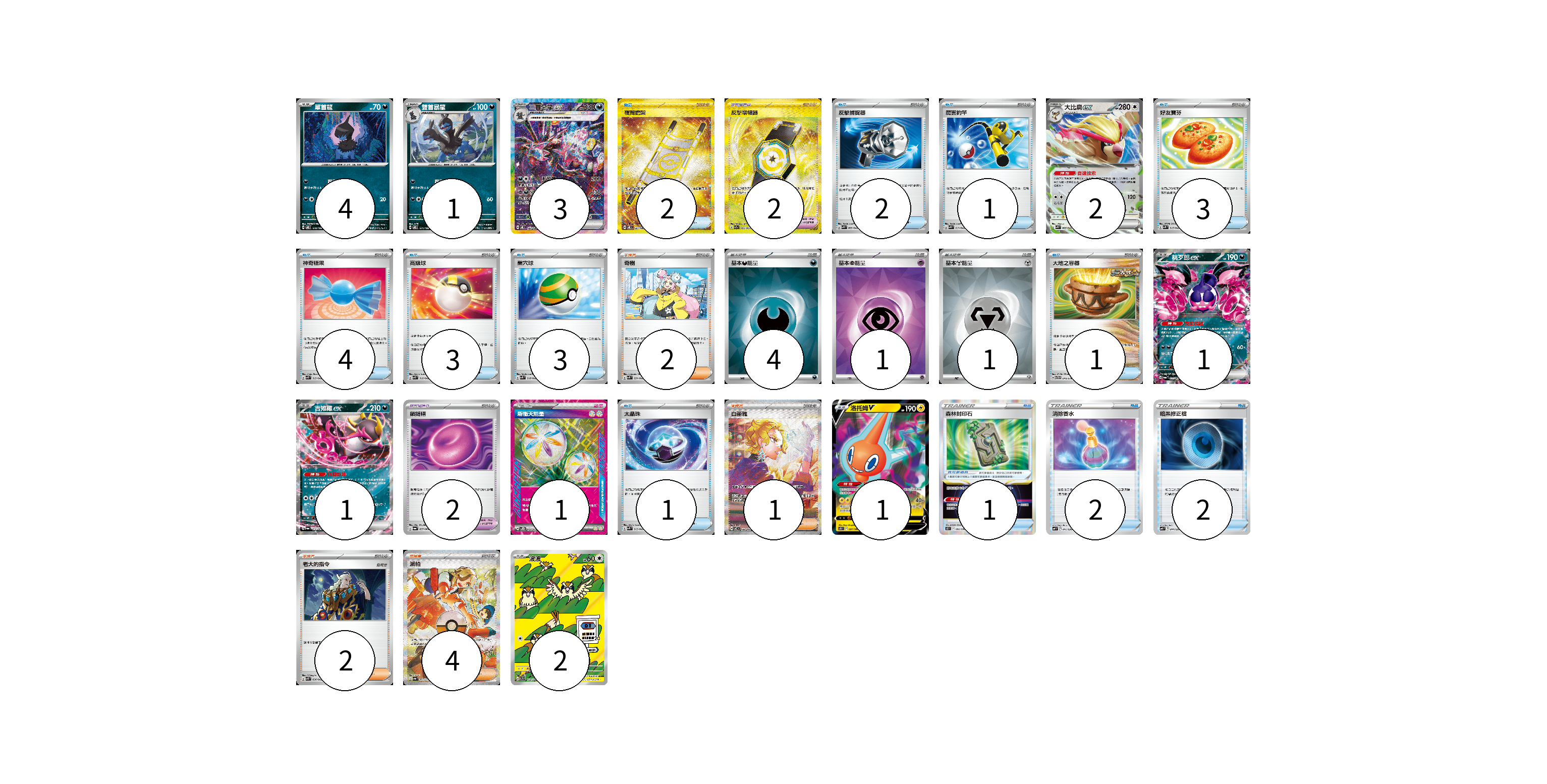 牌組構築方案 以此牌組為基礎新構築牌組 顯示卡面 顯示列表 寶可夢卡(15) 4 1 3 2 1 1 1 2 寶可夢道具(5) 2 2 1 物品卡(24) 2 2 1 3 4 3 3 1 1 2 2 支援者卡(9) 2 1 2 4 能量卡(7) 4 1 1 1 寶可夢卡(15) 卡牌名稱 張數 卡牌名稱 張數 單首龍 SV8 070/106 04 雙首暴龍 SV8 071/106 01 三首惡龍ex SV8 133/106 03 大比鳥ex SVK 005/042 02 桃歹郎ex SV6a 039/064 01 吉雉雞ex SV6a 038/064 01 洛托姆V S11 037/100 01 波波 SV3 118/108 02 寶可夢道具(5) 卡牌名稱 張數 卡牌名稱 張數 反擊增幅器 SV7a 093/064 02 鎖鏈糬 SV6a 057/064 02 森林封印石 S12 092/098 01 物品卡(24) 卡牌名稱 張數 卡牌名稱 張數 夜間擔架 SV8 137/106 02 反擊捕捉器 SVK 009/042 02 厲害釣竿 SVK 011/042 01 好友寶芬 SVK 015/042 03 神奇糖果 SVK 019/042 04 高級球 SVK 018/042 03 巢穴球 SVK 016/042 03 大地之容器 SVTG 010/019 01 太晶珠 SVK 013/042 01 消除香水 SVF 011/038 02 暗黑修正檔 SVF 014/038 02 支援者卡(9) 卡牌名稱 張數 卡牌名稱 張數 奇樹 SVK 031/042 02 白蕾雅 SV7 132/102 01 老大的指令 SVK 036/042 02 派帕 SV4a 353/190 04 能量卡(7) 卡牌名稱 張數 卡牌名稱 張數 基本【惡】能量 SVK DAR 04 基本【超】能量 SVK PSY 01 基本【鋼】能量 SVK MET 01 新衝天能量 SV5K 071/071 01 以此牌組為基礎新構築牌組 牌組編碼 IOYKcD-yokEDG-ivFvLm copy 列印牌組單 牌組編碼已複製 分享至SNS