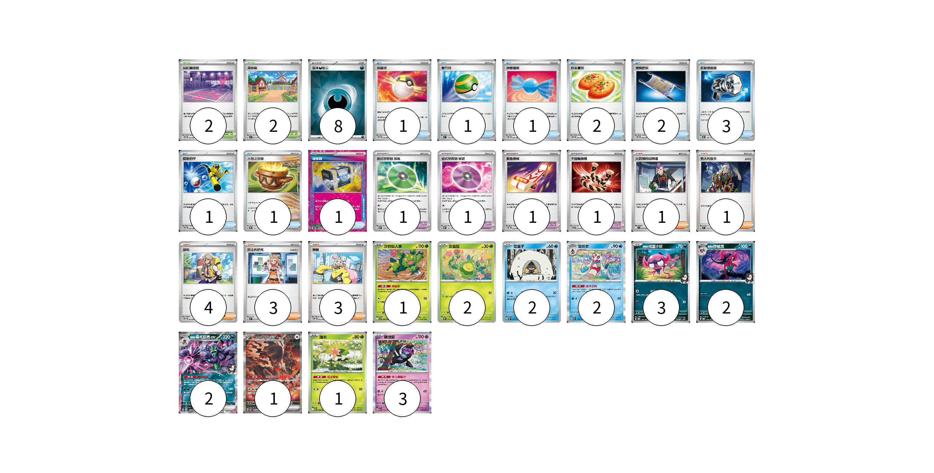 牌組構築方案 以此牌組為基礎新構築牌組 顯示卡面 顯示列表 寶可夢卡(19) 1 2 2 2 3 2 2 1 1 3 寶可夢道具(4) 1 1 1 1 物品卡(13) 1 1 1 2 2 3 1 1 1 支援者卡(12) 1 1 4 3 3 競技場卡(4) 2 2 能量卡(8) 8 寶可夢卡(19) 卡牌名稱 張數 卡牌名稱 張數 沙鈴仙人掌 SV9 006/100 01 含羞苞 SV8a 001/187 02 雪童子 SV8a 037/187 02 雪妖女 SV8a 038/187 02 <瑪俐的>搗蛋小妖 SVOM 005/021 03 <瑪俐的>詐唬魔 SVOM 006/021 02 <瑪俐的>長毛巨魔ex SVOM 007/021 02 月月熊 赫月ex SV8a 225/187 01 謝米 SV9a 006/063 01 願增猿 SV8a 075/187 03 寶可夢道具(4) 卡牌名稱 張數 卡牌名稱 張數 招式學習器 演進 SV8a 160/187 01 招式學習器 衰退 SV8a 161/187 01 緊急滑板 SVOD 015/020 01 不服輸頭帶 SVTL 016/021 01 物品卡(13) 卡牌名稱 張數 卡牌名稱 張數 高級球 SVOD 012/020 01 巢穴球 SVM 133/175 01 神奇糖果 SVOD 013/020 01 好友寶芬 SVOD 011/020 02 夜間擔架 SVOM 016/021 02 反擊捕捉器 SV8a 139/187 03 厲害釣竿 SVOD 010/020 01 大地之容器 SV8a 143/187 01 秘密箱 SV6 092/101 01 支援者卡(12) 卡牌名稱 張數 卡牌名稱 張數 火箭隊的拉姆達 SV10 094/098 01 老大的指令 SVM 172/175 01 派帕 SVOD 018/020 04 博士的研究 SVK 032/042 03 奇樹 SVOD 016/020 03 競技場卡(4) 卡牌名稱 張數 卡牌名稱 張數 尖釘鎮道館 SVOM 021/021 02 深缽鎮 SVK 039/042 02 能量卡(8) 卡牌名稱 張數 卡牌名稱 張數 基本【惡】能量 SVOM DAR 08 以此牌組為基礎新構築牌組 牌組編碼 IQctDy-sfZCpO-HXWISV copy 列印牌組單 牌組編碼已複製 分享至SNS