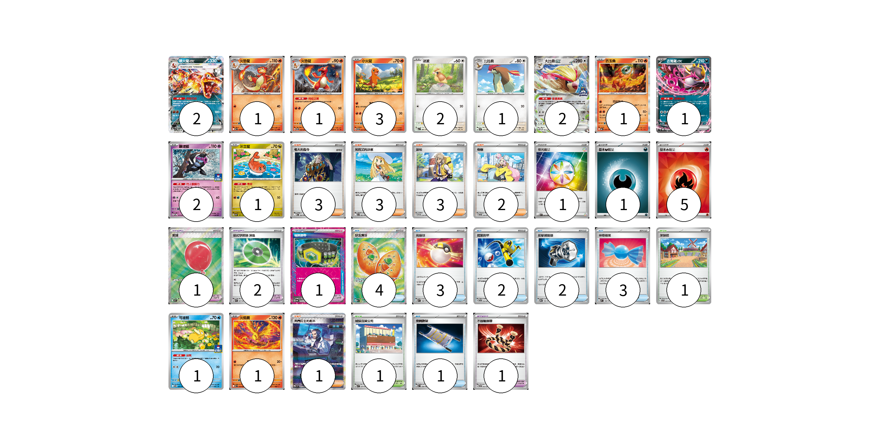 牌組構築方案 以此牌組為基礎新構築牌組 顯示卡面 顯示列表 寶可夢卡(19) 2 1 1 3 2 1 2 1 1 2 1 1 1 寶可夢道具(7) 2 1 2 1 1 物品卡(15) 4 3 2 2 3 1 支援者卡(10) 3 3 3 1 競技場卡(2) 1 1 能量卡(7) 1 1 5 寶可夢卡(19) 卡牌名稱 張數 卡牌名稱 張數 噴火龍ex SV3 066/108 02 火恐龍 M2 012/080 01 火恐龍 SVTL 002/021 01 小火龍 SVTL 001/021 03 波波 SV3 087/108 02 比比鳥 SV2a 017/165 01 大比鳥ex SV-P 183/SV-P 02 古玉魚 SV8a 025/187 01 吉雉雞ex SVOD 004/020 01 願增猿 M-P 014/M-P 02 米立龍 SV8a 121/187 01 可達鴨 SV-P 220/SV-P 01 火焰鳥 M2 014/080 01 寶可夢道具(7) 卡牌名稱 張數 卡牌名稱 張數 奇樹 SVTL 018/021 02 氣球 M1L 084/063 01 招式學習器 演進 SVK 025/042 02 極限腰帶 SV8a 159/187 01 不服輸頭帶 SVTL 016/021 01 物品卡(15) 卡牌名稱 張數 卡牌名稱 張數 好友寶芬 M1S 081/063 04 高級球 SVM 134/175 03 厲害釣竿 SVTR 012/021 02 反擊捕捉器 SV8a 139/187 02 神奇糖果 SVM 135/175 03 夜間擔架 MC 670/742 01 支援者卡(10) 卡牌名稱 張數 卡牌名稱 張數 老大的指令 MBD 020/022 03 莉莉艾的決意 M1L 062/063 03 派帕 SVTM 019/022 03 弗圖博士的劇本 SV4M 091/066 01 競技場卡(2) 卡牌名稱 張數 卡牌名稱 張數 深缽鎮 SVF 036/038 01 城鎮百貨公司 SVK 037/042 01 能量卡(7) 卡牌名稱 張數 卡牌名稱 張數 夜光能量 SVK 042/042 01 基本【惡】能量 M-P DAR 01 基本【火】能量 SVQL FIR 05 以此牌組為基礎新構築牌組 牌組編碼 ISxUqe-FcGRFY-FpSvSS copy 列印牌組單 牌組編碼已複製 分享至SNS