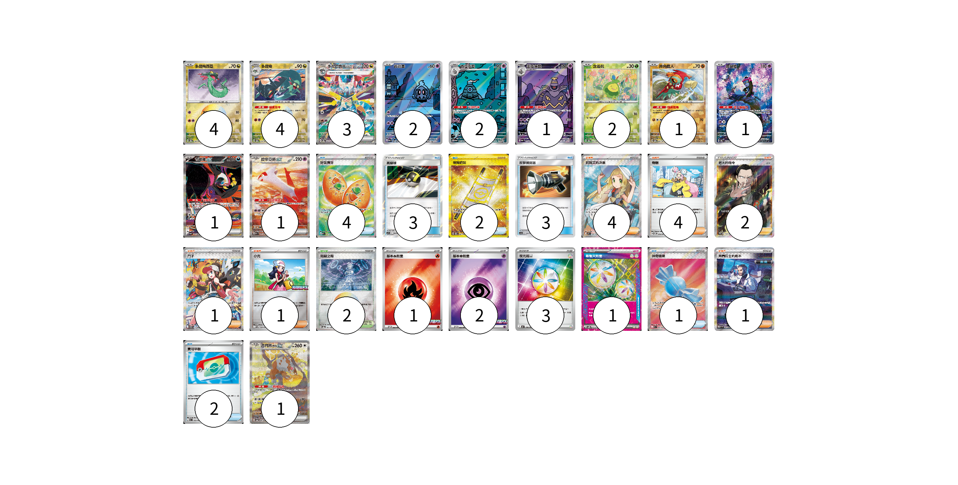 牌組構築方案 以此牌組為基礎新構築牌組 顯示卡面 顯示列表 寶可夢卡(23) 4 4 3 2 2 1 2 1 1 1 1 1 物品卡(15) 4 3 2 3 1 2 支援者卡(13) 4 4 2 1 1 1 競技場卡(2) 2 能量卡(7) 1 2 3 1 寶可夢卡(23) 卡牌名稱 張數 卡牌名稱 張數 多龍梅西亞 SV8a 118/187 04 多龍奇 SV8a 119/187 04 多龍巴魯托ex SV8a 221/187 03 夜巡靈 SV6a 068/064 02 彷徨夜靈 SV6a 069/064 02 黑夜魔靈 SV6a 070/064 01 含羞苞 SV8a 001/187 02 摔角鷹人 SV8a 084/187 01 願增猿 SV6 107/101 01 吉雉雞ex SV6a 089/064 01 拉帝亞斯ex SV7a 087/064 01 月月熊 赫月 ex SV5a 091/066 01 物品卡(15) 卡牌名稱 張數 卡牌名稱 張數 好友寶芬 M1S 081/063 04 高級球 AS5b 178/186 03 夜間擔架 SV8 137/106 02 反擊捕捉器 AC1a 130/158 03 神奇糖果 M1S 082/063 01 寶可平板 MC 662/742 02 支援者卡(13) 卡牌名稱 張數 卡牌名稱 張數 莉莉艾的決意 M1L 086/063 04 奇樹 SVOM 018/021 04 老大的指令(坂木) SC1b 170/153 02 鬥子 SV11W 173/086 01 小光 M-P 028/M-P 01 弗圖博士的劇本 SV4M 091/066 01 競技場卡(2) 卡牌名稱 張數 卡牌名稱 張數 阻礙之塔 SV8a 181/187 02 能量卡(7) 卡牌名稱 張數 卡牌名稱 張數 基本【火】能量 M-P 032/M-P 01 基本【超】能量 M-P 033/M-P 02 夜光能量 SV4a 190/190 03 新衝天能量 SV5K 071/071 01 以此牌組為基礎新構築牌組 牌組編碼 IUMPax-kwJYpT-QgDfbr copy 列印牌組單 牌組編碼已複製 分享至SNS