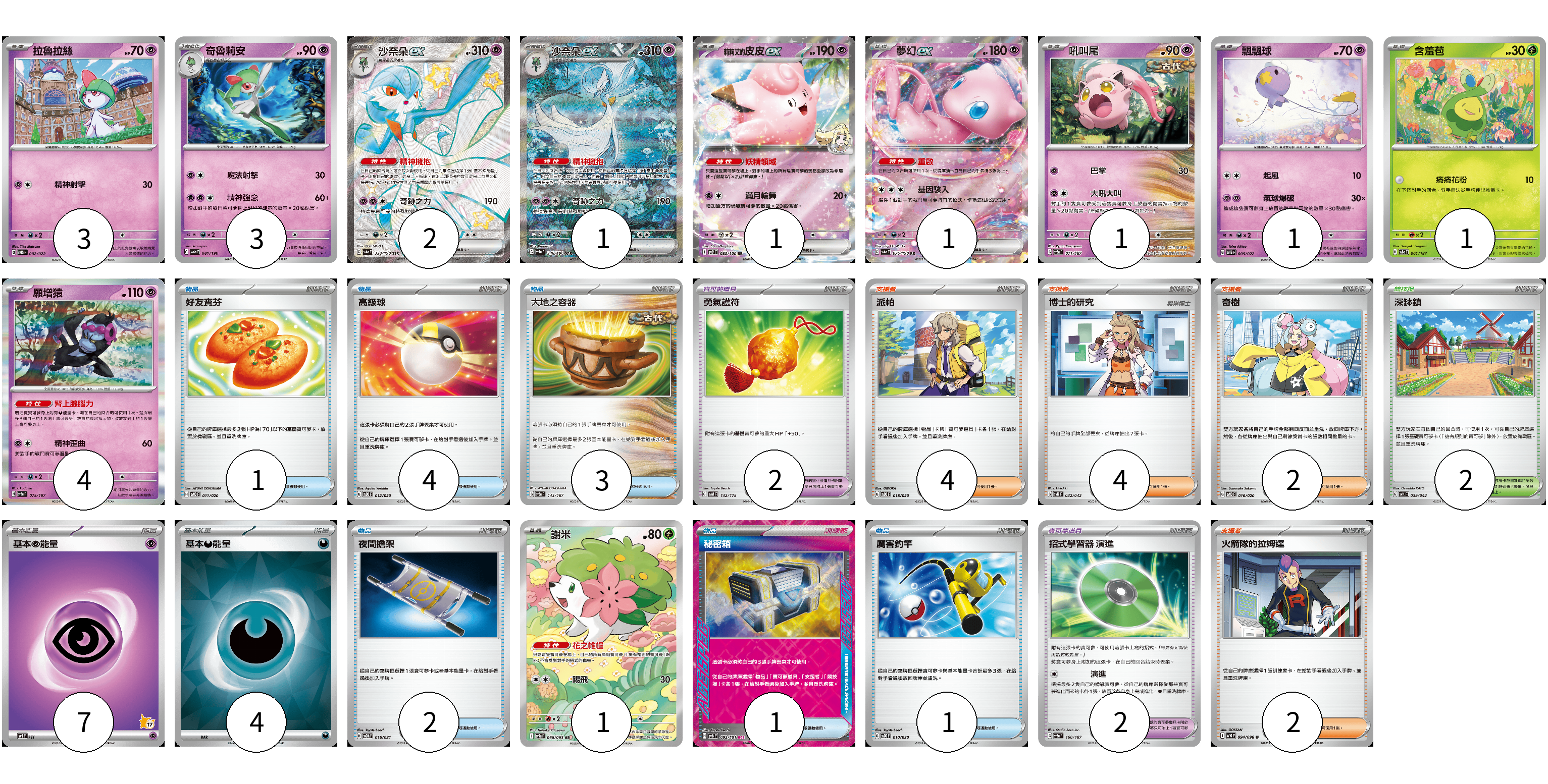 牌組構築方案 以此牌組為基礎新構築牌組 顯示卡面 顯示列表 寶可夢卡(19) 3 3 2 1 1 1 1 1 1 4 1 寶可夢道具(4) 2 2 物品卡(12) 1 4 3 2 1 1 支援者卡(12) 4 4 2 2 競技場卡(2) 2 能量卡(11) 7 4 寶可夢卡(19) 卡牌名稱 張數 卡牌名稱 張數 拉魯拉絲 SVTS 002/022 03 奇魯莉安 SV4a 081/190 03 沙奈朵ex SV4a 328/190 02 沙奈朵ex SV4a 348/190 01 莉莉艾的皮皮ex SV9 033/100 01 夢幻ex SV4a 076/190 01 吼叫尾 SV8a 071/187 01 飄飄球 SVTS 005/022 01 含羞苞 SV8a 001/187 01 願增猿 SV8a 075/187 04 謝米 SV9a 066/063 01 寶可夢道具(4) 卡牌名稱 張數 卡牌名稱 張數 勇氣護符 SVM 142/175 02 招式學習器 演進 SV8a 160/187 02 物品卡(12) 卡牌名稱 張數 卡牌名稱 張數 好友寶芬 SVOD 011/020 01 高級球 SVOD 012/020 04 大地之容器 SV8a 143/187 03 夜間擔架 SVOM 016/021 02 秘密箱 SV6 092/101 01 厲害釣竿 SVOD 010/020 01 支援者卡(12) 卡牌名稱 張數 卡牌名稱 張數 派帕 SVOD 018/020 04 博士的研究 SVK 032/042 04 奇樹 SVOD 016/020 02 火箭隊的拉姆達 SV10 094/098 02 競技場卡(2) 卡牌名稱 張數 卡牌名稱 張數 深缽鎮 SVK 039/042 02 能量卡(11) 卡牌名稱 張數 卡牌名稱 張數 基本【超】能量 SVI PSY 07 基本【惡】能量 SVOM DAR 04 以此牌組為基礎新構築牌組 牌組編碼 IWiSmh-nWSFrl-TBCZMa copy 列印牌組單 牌組編碼已複製 分享至SNS