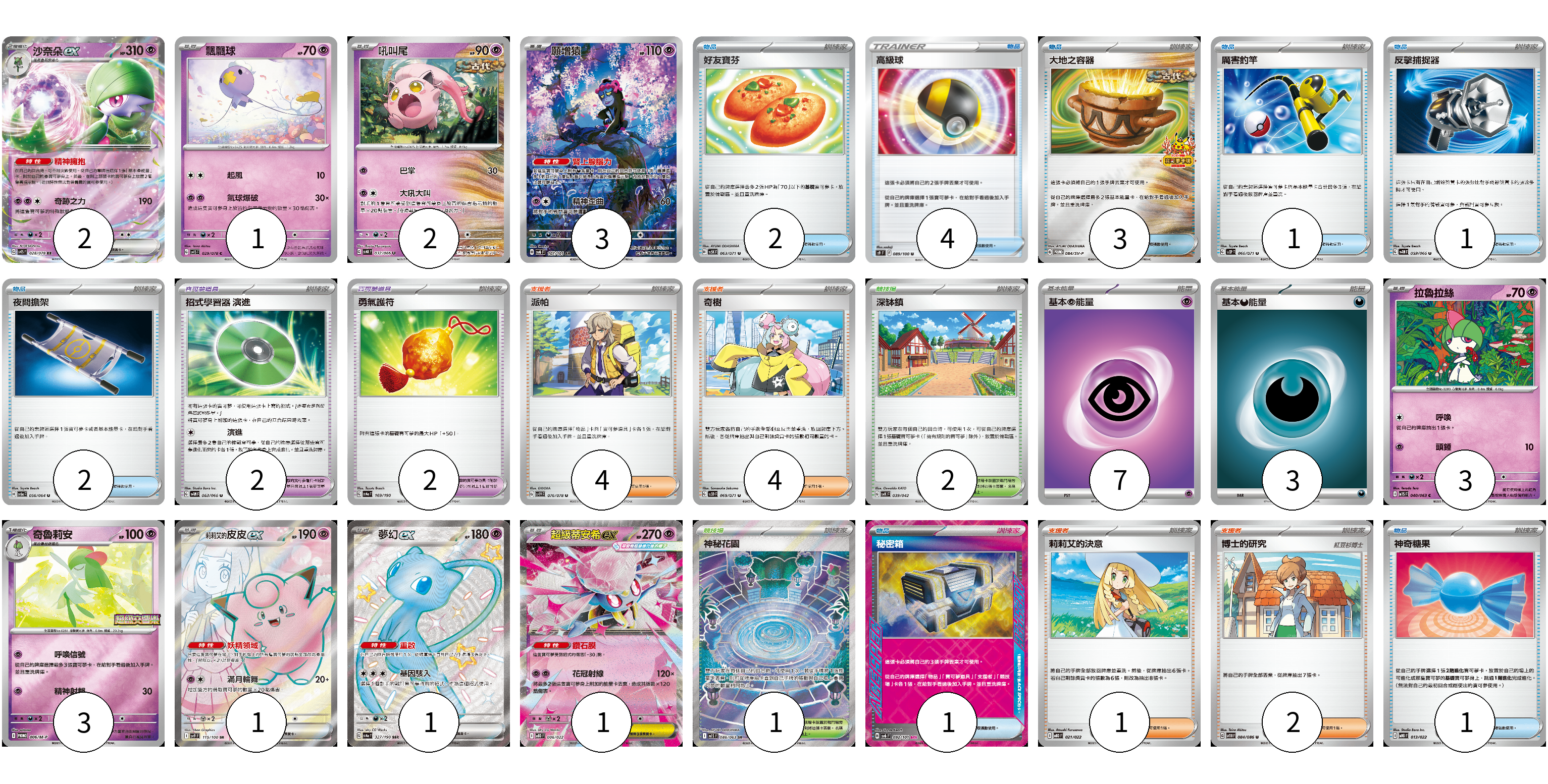 牌組構築方案 以此牌組為基礎新構築牌組 顯示卡面 顯示列表 寶可夢卡(17) 2 1 2 3 3 3 1 1 1 寶可夢道具(4) 2 2 物品卡(15) 2 4 3 1 1 2 1 1 支援者卡(11) 4 4 1 2 競技場卡(3) 2 1 能量卡(10) 7 3 寶可夢卡(17) 卡牌名稱 張數 卡牌名稱 張數 沙奈朵ex SV1S 028/078 02 飄飄球 SV1S 029/078 01 吼叫尾 SV4K 032/066 02 願增猿 SV6 107/101 03 拉魯拉絲 M1S 040/063 03 奇魯莉安 M-P 006/M-P 03 莉莉艾的皮皮ex SV9 115/100 01 夢幻ex SV4a 327/190 01 超級蒂安希ex MBD 006/022 01 寶可夢道具(4) 卡牌名稱 張數 卡牌名稱 張數 招式學習器 演進 SV4M 063/066 02 勇氣護符 SV4a 169/190 02 物品卡(15) 卡牌名稱 張數 卡牌名稱 張數 好友寶芬 SV5K 063/071 02 高級球 S9 089/100 04 大地之容器 SV-P 084/SV-P 03 厲害釣竿 SV2P 066/071 01 反擊捕捉器 SV4M 059/066 01 夜間擔架 SV6a 056/064 02 秘密箱 SV6 092/101 01 神奇糖果 MBG 013/022 01 支援者卡(11) 卡牌名稱 張數 卡牌名稱 張數 派帕 SV1V 076/078 04 奇樹 SV2D 069/071 04 莉莉艾的決意 MBD 021/022 01 博士的研究 SV11B 084/086 02 競技場卡(3) 卡牌名稱 張數 卡牌名稱 張數 深缽鎮 SVK 039/042 02 神秘花園 M1S 086/063 01 能量卡(10) 卡牌名稱 張數 卡牌名稱 張數 基本【超】能量 SVEM PSY 07 基本惡能量 sv-p DAR 03 以此牌組為基礎新構築牌組 牌組編碼 IYWzyG-XLbJcC-wDDmLu copy 列印牌組單 牌組編碼已複製 分享至SNS