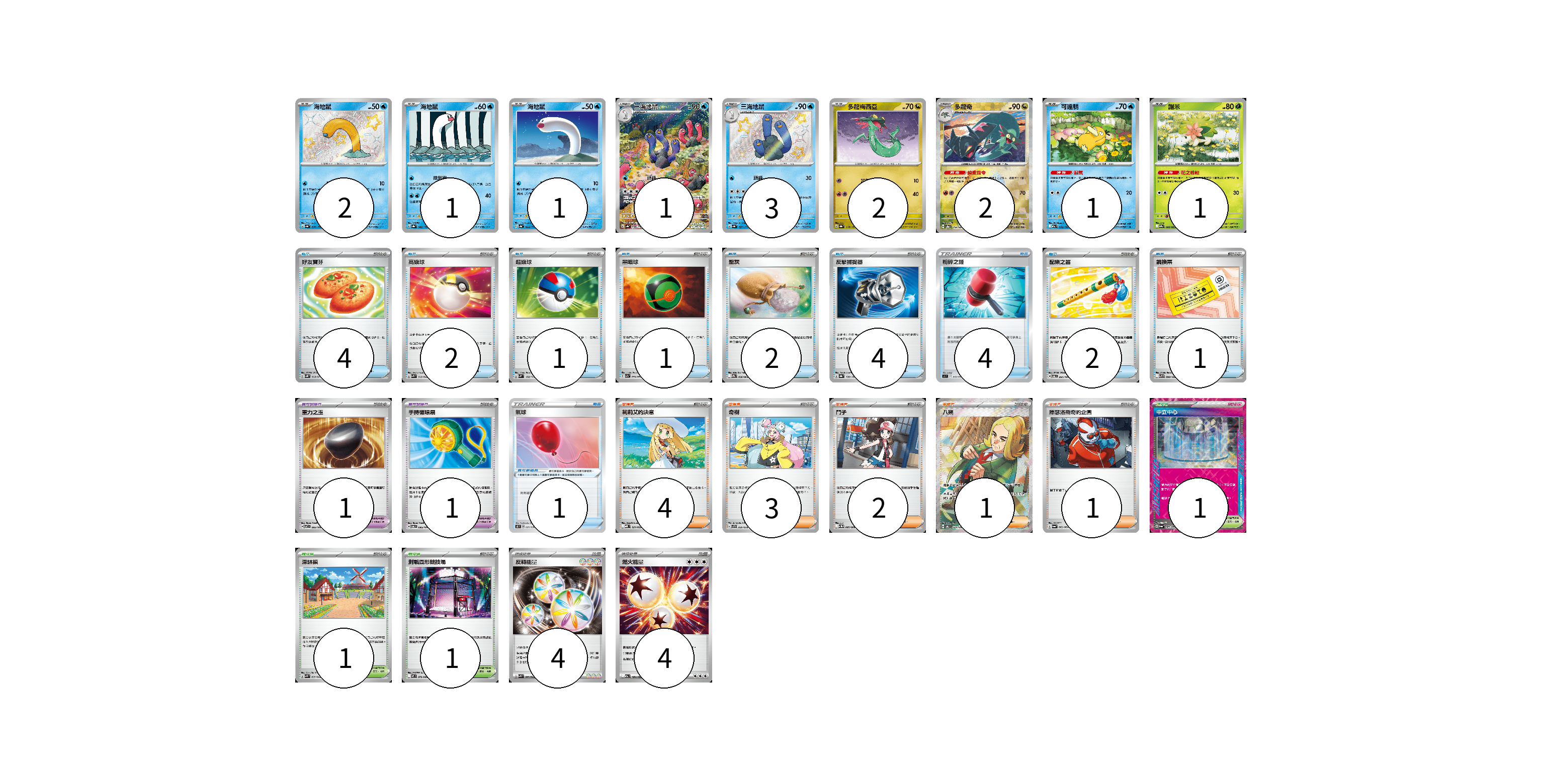 牌組構築方案 以此牌組為基礎新構築牌組 顯示卡面 顯示列表 寶可夢卡(14) 2 1 1 1 3 2 2 1 1 寶可夢道具(3) 1 1 1 物品卡(21) 4 2 1 1 2 4 4 2 1 支援者卡(11) 4 3 2 1 1 競技場卡(3) 1 1 1 能量卡(8) 4 4 寶可夢卡(14) 卡牌名稱 張數 卡牌名稱 張數 海地鼠 SV4a 226/190 02 海地鼠 SV8a 042/187 01 海地鼠 SV4a 044/190 01 三海地鼠 SV4a 338/190 01 三海地鼠 SV4a 227/190 03 多龍梅西亞 SV8a 118/187 02 多龍奇 SV8a 119/187 02 可達鴨 M2a 032/193 01 謝米 SV9a 006/063 01 寶可夢道具(3) 卡牌名稱 張數 卡牌名稱 張數 重力之玉 SV7 095/102 01 手持循環扇 SV6 095/101 01 氣球 SK 021/030 01 物品卡(21) 卡牌名稱 張數 卡牌名稱 張數 好友寶芬 SV5K 063/071 04 高級球 SVK 018/042 02 超級球 SVM 132/175 01 黑暗球 SV7a 054/064 01 聖灰 SV9a 056/063 02 反擊捕捉器 SV8a 139/187 04 粉碎之錘 SI 372/414 04 配樂之笛 SV6 091/101 02 調換票 SV9 090/100 01 支援者卡(11) 卡牌名稱 張數 卡牌名稱 張數 莉莉艾的決意 MBD 021/022 04 奇樹 SVF 029/038 03 鬥子 SV11W 085/086 02 八朔 SV6 124/101 01 庫瑟洛斯奇的企圖 SV6a 062/064 01 競技場卡(3) 卡牌名稱 張數 卡牌名稱 張數 中立中心 SV6a 063/064 01 深缽鎮 SVK 039/042 01 對戰圓形競技場 M2 079/080 01 能量卡(8) 卡牌名稱 張數 卡牌名稱 張數 反轉能量 SVK 041/042 04 燃火能量 M2a 191/193 04 以此牌組為基礎新構築牌組 牌組編碼 IZapPi-adddTy-SjjbuQ copy 列印牌組單 牌組編碼已複製 分享至SNS