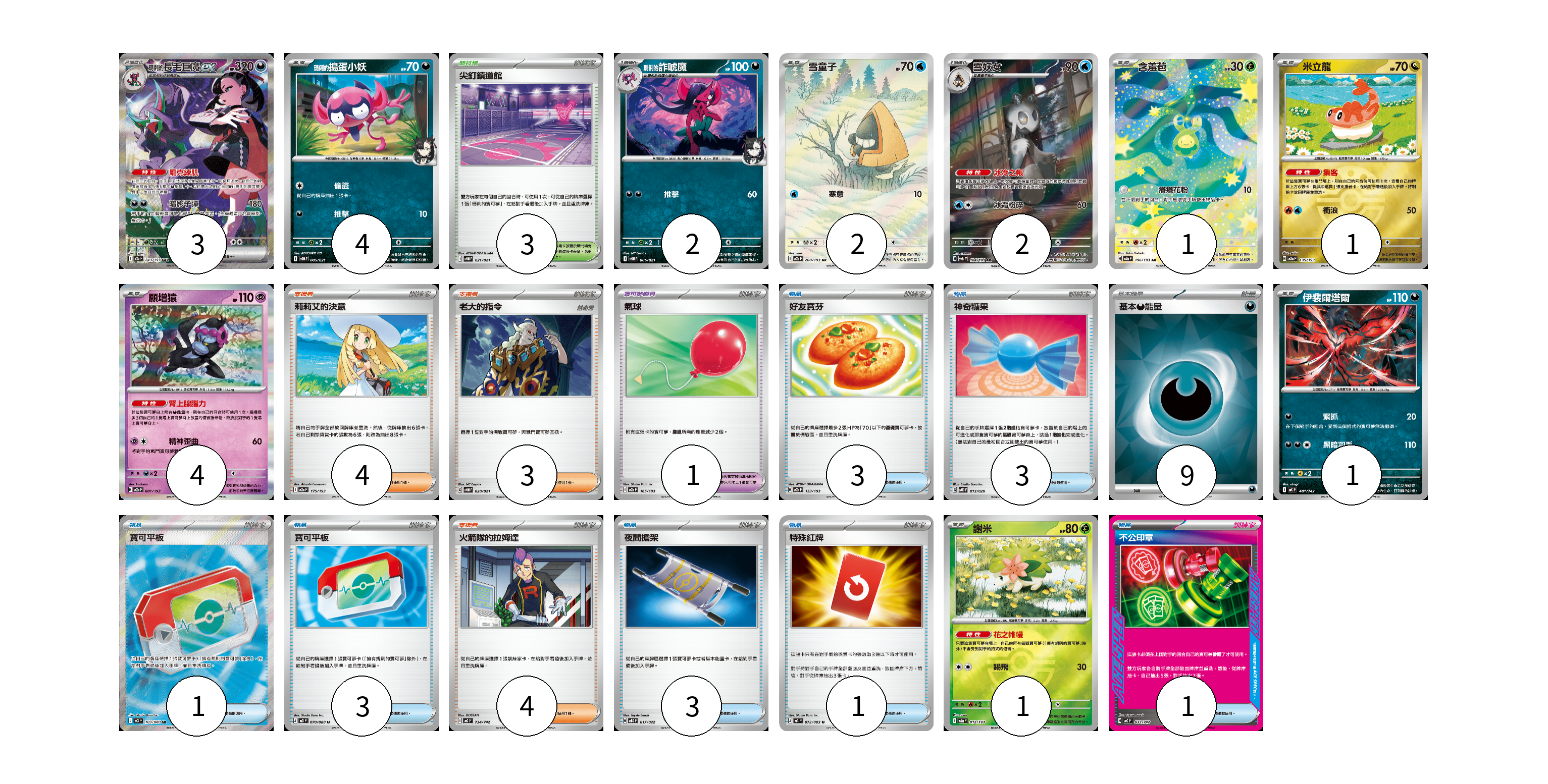 牌組構築方案 以此牌組為基礎新構築牌組 顯示卡面 顯示列表 寶可夢卡(21) 3 4 2 2 2 1 1 4 1 1 寶可夢道具(1) 1 物品卡(15) 3 3 1 3 3 1 1 支援者卡(11) 4 3 4 競技場卡(3) 3 能量卡(9) 9 寶可夢卡(21) 卡牌名稱 張數 卡牌名稱 張數 <瑪俐的>長毛巨魔ex M2a 243/193 03 <瑪俐的>搗蛋小妖 SVOM 005/021 04 <瑪俐的>詐唬魔 SVOM 006/021 02 雪童子 M2a 200/193 02 雪妖女 SV6 104/101 02 含羞苞 M2a 196/193 01 米立龍 M2a 135/193 01 願增猿 M2a 081/193 04 伊裴爾塔爾 MC 481/742 01 謝米 M2a 012/193 01 寶可夢道具(1) 卡牌名稱 張數 卡牌名稱 張數 氣球 M2a 165/193 01 物品卡(15) 卡牌名稱 張數 卡牌名稱 張數 好友寶芬 M2a 153/193 03 神奇糖果 SVOD 013/020 03 寶可平板 M3 103/080 01 寶可平板 M3 070/080 03 夜間擔架 MBG 017/022 03 特殊紅牌 M4 072/083 01 不公印章 MC 633/742 01 支援者卡(11) 卡牌名稱 張數 卡牌名稱 張數 莉莉艾的決意 M2a 175/193 04 老大的指令 SVOM 020/021 03 火箭隊的拉姆達 MC 734/742 04 競技場卡(3) 卡牌名稱 張數 卡牌名稱 張數 尖釘鎮道館 SVOM 021/021 03 能量卡(9) 卡牌名稱 張數 卡牌名稱 張數 基本【惡】能量 SVK DAR 09 以此牌組為基礎新構築牌組 牌組編碼 IaJKkP-uZIUnb-ntVxSF copy 列印牌組單 牌組編碼已複製 分享至SNS