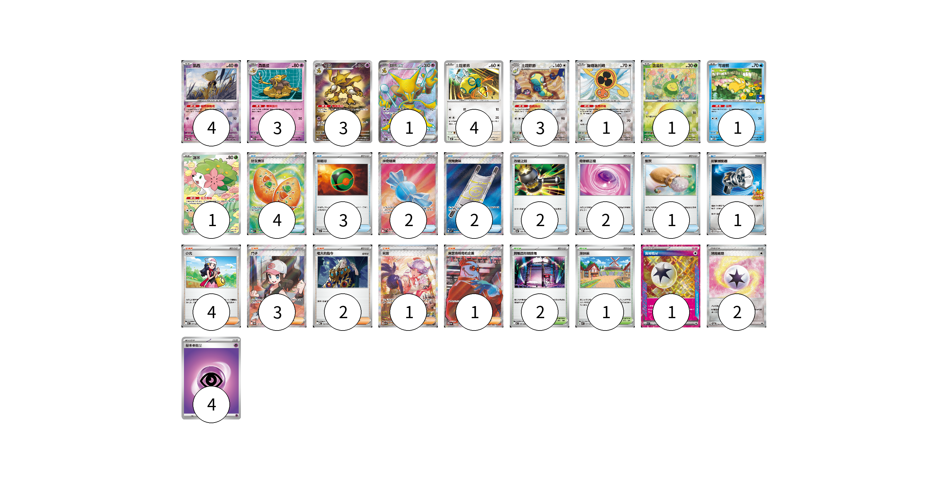牌組構築方案 以此牌組為基礎新構築牌組 顯示卡面 顯示列表 寶可夢卡(22) 4 3 3 1 4 3 1 1 1 1 物品卡(17) 4 3 2 2 2 2 1 1 支援者卡(11) 4 3 2 1 1 競技場卡(3) 2 1 能量卡(7) 1 2 4 寶可夢卡(22) 卡牌名稱 張數 卡牌名稱 張數 凱西 SV8a 057/187 04 勇基拉 M1S 037/063 03 胡地 M1S 071/063 03 胡地ex SV2a 190/165 01 土龍弟弟 SV5K 056/071 04 土龍節節 SV8a 130/187 03 旋轉洛托姆 SV8a 131/187 01 含羞苞 SV8a 001/187 01 可達鴨 SV-P 220/SV-P 01 謝米 SV9a 066/063 01 物品卡(17) 卡牌名稱 張數 卡牌名稱 張數 好友寶芬 M1S 081/063 04 黑暗球 SV7a 054/064 03 神奇糖果 M1S 082/063 02 夜間擔架 M1L 083/063 02 改造之錘 SV8a 138/187 02 奇跡修正檔 MBD 017/022 02 聖灰 SV9a 056/063 01 反擊捕捉器 SV-P 083/SV-P 01 支援者卡(11) 卡牌名稱 張數 卡牌名稱 張數 小光 M2 077/080 04 鬥子 SV11W 166/086 03 老大的指令 MBD 020/022 02 莉普 SV4M 092/066 01 庫瑟洛斯奇的企圖 SV6a 086/064 01 競技場卡(3) 卡牌名稱 張數 卡牌名稱 張數 對戰圓形競技場 M2 079/080 02 深缽鎮 SVK 039/042 01 能量卡(7) 卡牌名稱 張數 卡牌名稱 張數 富裕能量 SV7a 064/064 01 薄霧能量 SV8a 186/187 02 基本超能量 sv-p PSY 04 以此牌組為基礎新構築牌組 牌組編碼 Iagaxg-owFyTD-xycwNE copy 列印牌組單 牌組編碼已複製 分享至SNS