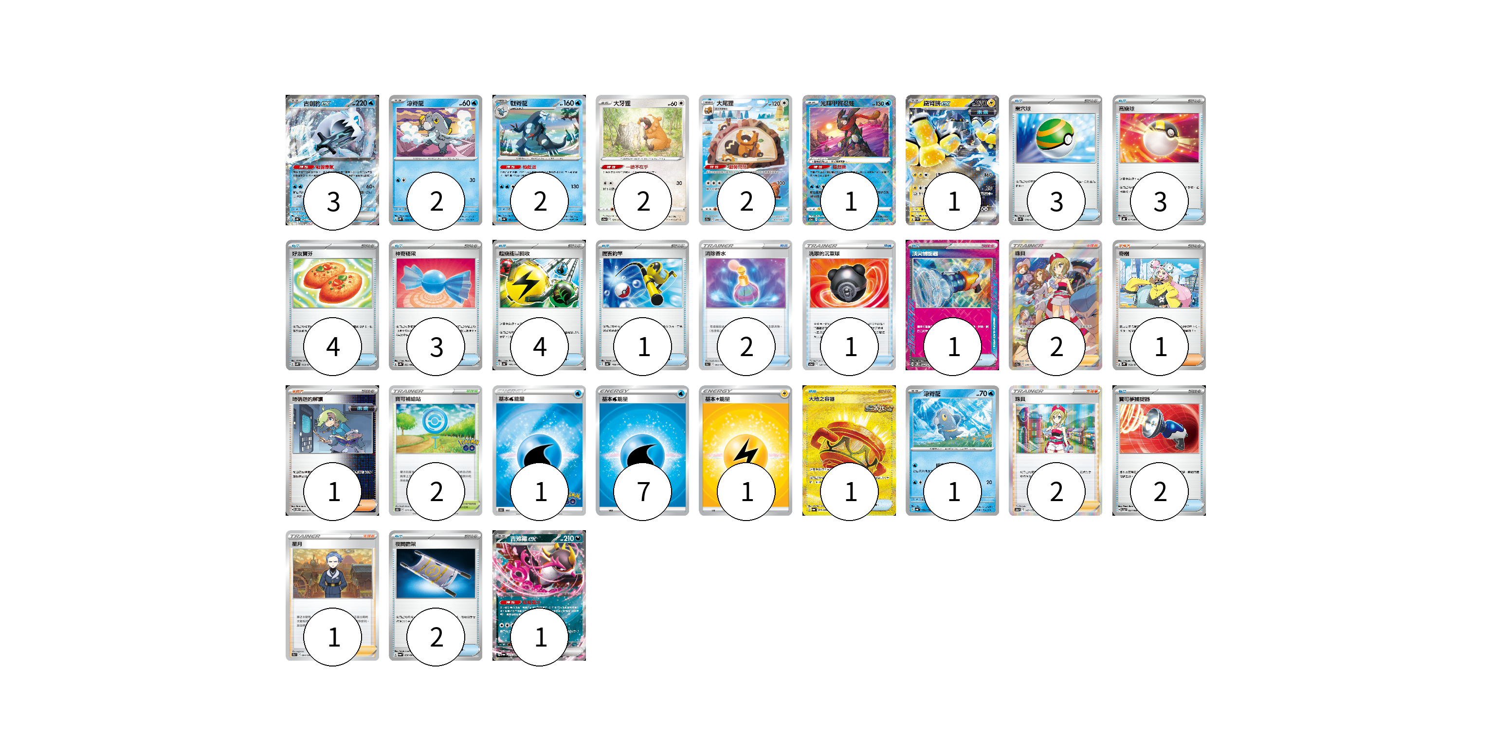 牌組構築方案 以此牌組為基礎新構築牌組 顯示卡面 顯示列表 寶可夢卡(15) 3 2 2 2 2 1 1 1 1 物品卡(27) 3 3 4 3 4 1 2 1 1 1 2 2 支援者卡(7) 2 1 1 2 1 競技場卡(2) 2 能量卡(9) 1 7 1 寶可夢卡(15) 卡牌名稱 張數 卡牌名稱 張數 古劍豹ex SV4a 054/190 03 涼脊龍 SV2P 024/071 02 戟脊龍 SV4a 053/190 02 大牙狸 S12a 121/172 02 大尾狸 S12a 200/172 02 光輝甲賀忍蛙 S12a 033/172 01 鐵臂膀ex SV4M 027/066 01 涼脊龍 SV4a 051/190 01 吉雉雞ex SV6a 038/064 01 物品卡(27) 卡牌名稱 張數 卡牌名稱 張數 巢穴球 SV1S 070/078 03 高級球 SVHK 013/022 03 好友寶芬 SV5K 063/071 04 神奇糖果 SV3a 053/062 03 超級能量回收 SV4a 157/190 04 厲害釣竿 SV4a 158/190 01 消除香水 S9a 063/067 02 洗翠的沉重球 S12a 140/172 01 頂尖捕捉器 SV5M 062/071 01 大地之容器 SV6a 093/064 01 寶可夢捕捉器 SV5a 057/066 02 夜間擔架 SV6a 056/064 02 支援者卡(7) 卡牌名稱 張數 卡牌名稱 張數 珠貝 S12a 236/172 02 奇樹 SV2D 069/071 01 暗碼迷的解讀 SV5M 067/071 01 珠貝 S12a 149/172 02 星月 S9a 064/067 01 競技場卡(2) 卡牌名稱 張數 卡牌名稱 張數 寶可補給站 S10b 071/071 02 能量卡(9) 卡牌名稱 張數 卡牌名稱 張數 基本水能量 S10b WAT 01 基本【水】能量 SI WAT 07 基本【雷】能量 SI LIG 01 以此牌組為基礎新構築牌組 牌組編碼 IcITfz-OexXqS-OsJvLA copy 列印牌組單 牌組編碼已複製 分享至SNS
