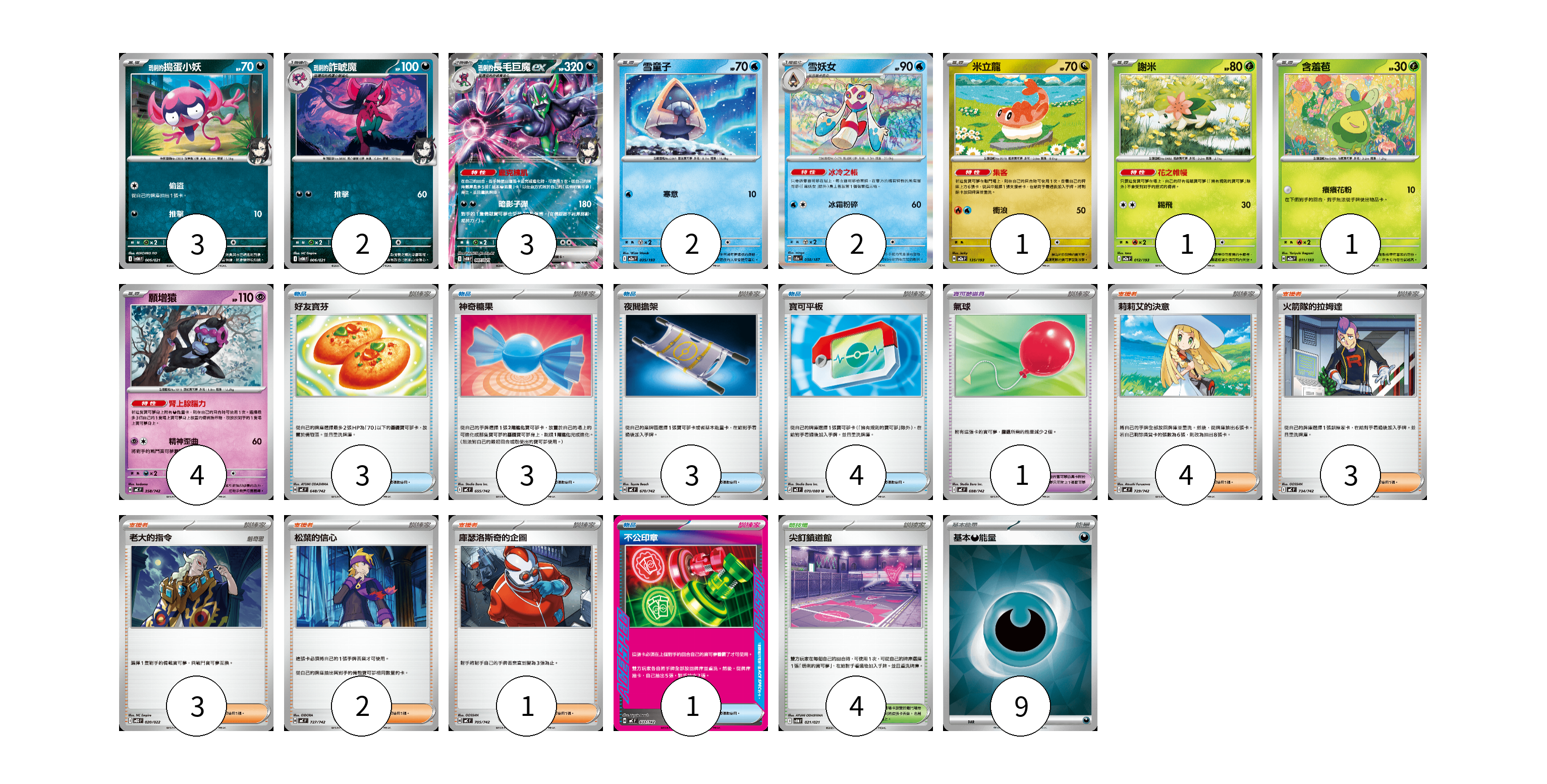 牌組構築方案 以此牌組為基礎新構築牌組 顯示卡面 顯示列表 寶可夢卡(19) 3 2 3 2 2 1 1 1 4 寶可夢道具(1) 1 物品卡(14) 3 3 3 4 1 支援者卡(13) 4 3 3 2 1 競技場卡(4) 4 能量卡(9) 9 寶可夢卡(19) 卡牌名稱 張數 卡牌名稱 張數 <瑪俐的>搗蛋小妖 SVOM 005/021 03 <瑪俐的>詐唬魔 SVOM 006/021 02 <瑪俐的>長毛巨魔ex SVOM 007/021 03 雪童子 M2a 035/193 02 雪妖女 SV8a 038/187 02 米立龍 M2a 135/193 01 謝米 M2a 012/193 01 含羞苞 M2a 011/193 01 願增猿 MC 358/742 04 寶可夢道具(1) 卡牌名稱 張數 卡牌名稱 張數 氣球 MC 688/742 01 物品卡(14) 卡牌名稱 張數 卡牌名稱 張數 好友寶芬 MC 648/742 03 神奇糖果 MC 655/742 03 夜間擔架 MC 670/742 03 寶可平板 M3 070/080 04 不公印章 MC 633/742 01 支援者卡(13) 卡牌名稱 張數 卡牌名稱 張數 莉莉艾的決意 MC 729/742 04 火箭隊的拉姆達 MC 734/742 03 老大的指令 MBD 020/022 03 松葉的信心 MC 727/742 02 庫瑟洛斯奇的企圖 MC 705/742 01 競技場卡(4) 卡牌名稱 張數 卡牌名稱 張數 尖釘鎮道館 SVOM 021/021 04 能量卡(9) 卡牌名稱 張數 卡牌名稱 張數 基本【惡】能量 SVOM DAR 09 以此牌組為基礎新構築牌組 牌組編碼 IdTOds-MkbDCx-bUgyxl copy 列印牌組單 牌組編碼已複製 分享至SNS