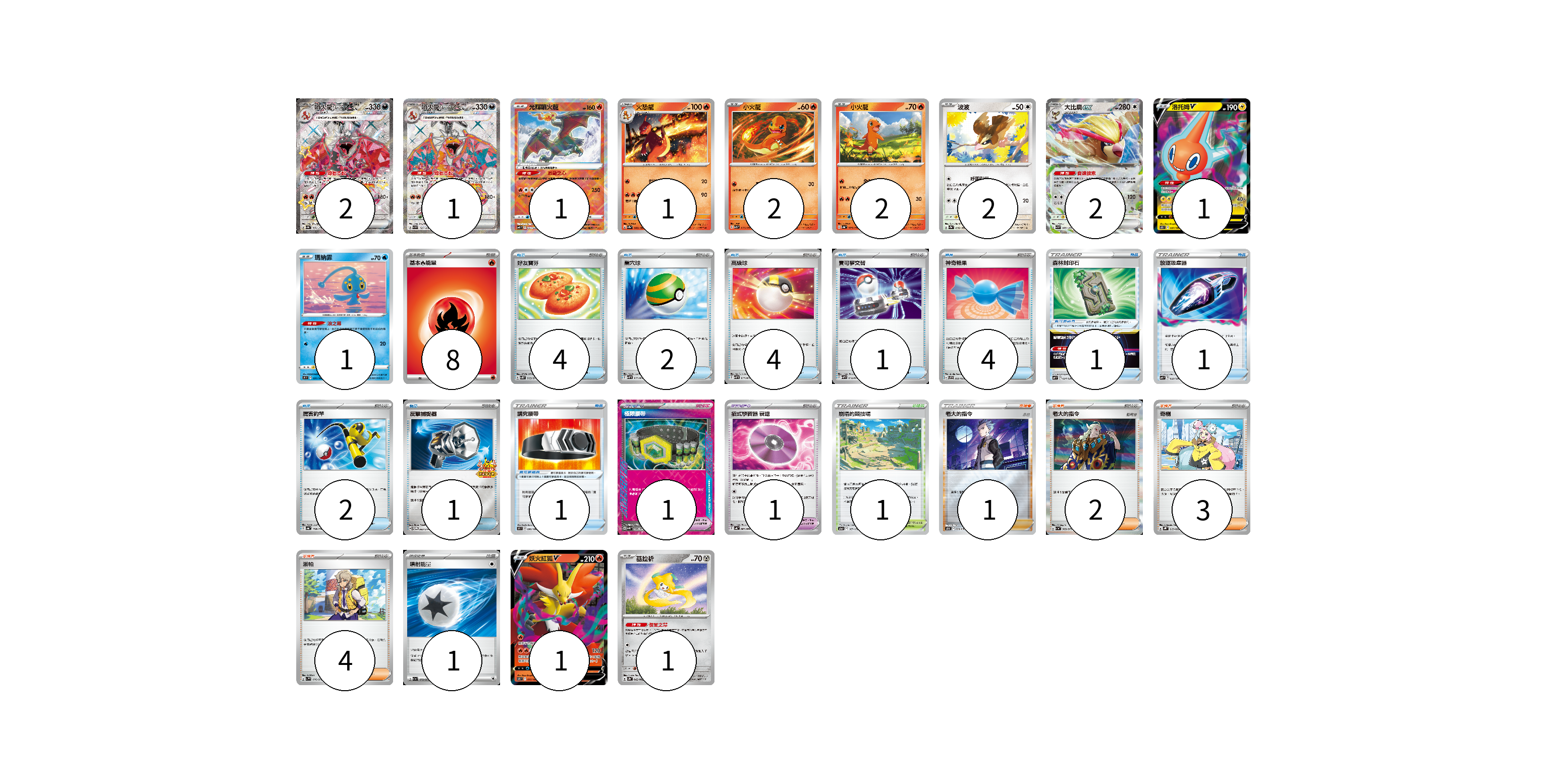牌組構築方案 以此牌組為基礎新構築牌組 顯示卡面 顯示列表 寶可夢卡(17) 2 1 1 1 2 2 2 2 1 1 1 1 寶可夢道具(3) 1 1 1 物品卡(20) 4 2 4 1 4 1 1 2 1 支援者卡(10) 1 2 3 4 競技場卡(1) 1 能量卡(9) 8 1 寶可夢卡(17) 卡牌名稱 張數 卡牌名稱 張數 噴火龍ex SV4a 331/190 02 噴火龍ex SV3 125/108 01 光輝噴火龍 SVF 001/038 01 火恐龍 SV2a 005/165 01 小火龍 SV3 012/108 02 小火龍 SV4a 025/190 02 波波 SV2a 016/165 02 大比鳥ex SV3 089/108 02 洛托姆V S11 037/100 01 瑪納霏 S9 031/100 01 妖火紅狐V S11 017/100 01 基拉祈 SV3a 042/062 01 寶可夢道具(3) 卡牌名稱 張數 卡牌名稱 張數 講究腰帶 S9 090/100 01 極限腰帶 SV5K 066/071 01 招式學習器 衰退 SV4K 063/066 01 物品卡(20) 卡牌名稱 張數 卡牌名稱 張數 好友寶芬 SV5K 063/071 04 巢穴球 SVHM 012/022 02 高級球 SVHM 013/022 04 寶可夢交替 SVHM 014/022 01 神奇糖果 SVF 020/038 04 森林封印石 SVF 024/038 01 放逐吸塵器 SVF 023/038 01 厲害釣竿 SV4a 158/190 02 反擊捕捉器 SV-P 083/SV-P 01 支援者卡(10) 卡牌名稱 張數 卡牌名稱 張數 老大的指令(赤日) SO 028/030 01 老大的指令 SV1a 069/073 02 奇樹 SVHK 019/022 03 派帕 SV1V 076/078 04 競技場卡(1) 卡牌名稱 張數 卡牌名稱 張數 崩塌的競技場 S12a 167/172 01 能量卡(9) 卡牌名稱 張數 卡牌名稱 張數 基本【火】能量 SVEL FIR 08 噴射能量 SV1a 072/073 01 以此牌組為基礎新構築牌組 牌組編碼 IeOWDn-SrAAiB-XEvvsh copy 列印牌組單 牌組編碼已複製 分享至SNS