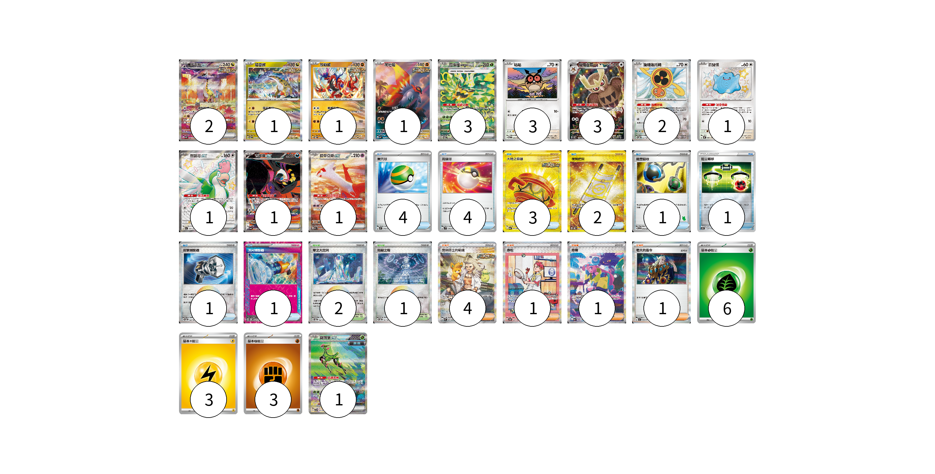 牌組構築方案 以此牌組為基礎新構築牌組 顯示卡面 顯示列表 寶可夢卡(21) 2 1 1 1 3 3 3 2 1 1 1 1 1 物品卡(17) 4 4 3 2 1 1 1 1 支援者卡(7) 4 1 1 1 競技場卡(3) 2 1 能量卡(12) 6 3 3 寶可夢卡(21) 卡牌名稱 張數 卡牌名稱 張數 猛雷鼓ex SV5K 095/071 02 猛雷鼓 SV7 075/102 01 故勒頓 SV8 069/106 01 爬地翅 SV4K 074/066 01 厄鬼椪 碧草面具ex SV6 125/101 03 咕咕 SV7 076/102 03 貓頭夜鷹 SV7 114/102 03 旋轉洛托姆 SV8a 131/187 02 百變怪 SV4a 309/190 01 怒鸚哥ex SV4a 337/190 01 吉雉雞ex SV6a 089/064 01 拉帝亞斯ex SV7a 087/064 01 鐵斑葉ex SV5M 093/071 01 物品卡(17) 卡牌名稱 張數 卡牌名稱 張數 巢穴球 SV1S 070/078 04 高級球 SV1V 070/078 04 大地之容器 SV6a 093/064 03 夜間擔架 SV8 137/106 02 能量回收 SVI 049/066 01 能量轉移 SO 017/030 01 反擊捕捉器 SV8a 139/187 01 頂尖捕捉器 SV5M 062/071 01 支援者卡(7) 卡牌名稱 張數 卡牌名稱 張數 奧琳博士的氣魄 SV4K 091/066 04 赤松 SV8a 227/187 01 奇樹 SV4a 350/190 01 老大的指令 SV1a 069/073 01 競技場卡(3) 卡牌名稱 張數 卡牌名稱 張數 零之大空洞 SV8a 182/187 02 阻礙之塔 SV8a 181/187 01 能量卡(12) 卡牌名稱 張數 卡牌名稱 張數 基本【草】能量 SVTM GRA 06 基本【雷】能量 SVTR LIG 03 基本【鬥】能量 SVTG FIG 03 以此牌組為基礎新構築牌組 牌組編碼 IfzlYV-ajMtYN-wUIVyT copy 列印牌組單 牌組編碼已複製 分享至SNS
