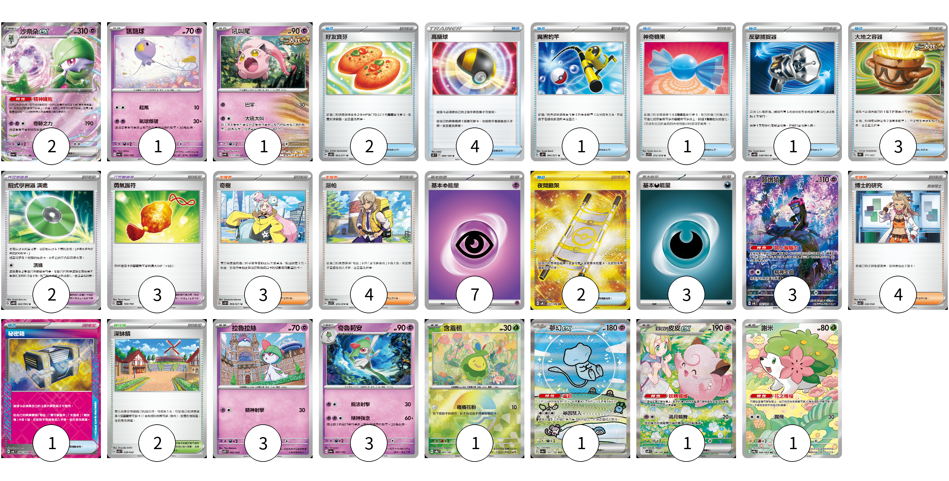 牌組構築方案 以此牌組為基礎新構築牌組 顯示卡面 顯示列表 寶可夢卡(17) 2 1 1 3 3 3 1 1 1 1 寶可夢道具(5) 2 3 物品卡(15) 2 4 1 1 1 3 2 1 支援者卡(11) 3 4 4 競技場卡(2) 2 能量卡(10) 7 3 寶可夢卡(17) 卡牌名稱 張數 卡牌名稱 張數 沙奈朵ex SV4a 082/190 02 飄飄球 SV4a 083/190 01 吼叫尾 SV4K 032/066 01 願增猿 SV6 107/101 03 拉魯拉絲 SVTS 002/022 03 奇魯莉安 SV4a 081/190 03 含羞苞 SV8a 001/187 01 夢幻ex SV4a 347/190 01 莉莉艾的皮皮ex SV9 126/100 01 謝米 SV9a 066/063 01 寶可夢道具(5) 卡牌名稱 張數 卡牌名稱 張數 招式學習器 演進 SV4M 063/066 02 勇氣護符 SV4a 169/190 03 物品卡(15) 卡牌名稱 張數 卡牌名稱 張數 好友寶芬 SV5K 063/071 02 高級球 S9 089/100 04 厲害釣竿 SV2P 066/071 01 神奇糖果 SV1V 072/078 01 反擊捕捉器 SV4M 059/066 01 大地之容器 SVHK 011/022 03 夜間擔架 SV8 137/106 02 秘密箱 SV6 092/101 01 支援者卡(11) 卡牌名稱 張數 卡牌名稱 張數 奇樹 SV2D 069/071 03 派帕 SV1V 076/078 04 博士的研究 SVK 032/042 04 競技場卡(2) 卡牌名稱 張數 卡牌名稱 張數 深缽鎮 SVK 039/042 02 能量卡(10) 卡牌名稱 張數 卡牌名稱 張數 基本超能量 sv-p PSY 07 基本【惡】能量 SVF DAR 03 以此牌組為基礎新構築牌組 牌組編碼 IgTzAJ-eJHuwm-bHHieY copy 列印牌組單 牌組編碼已複製 分享至SNS