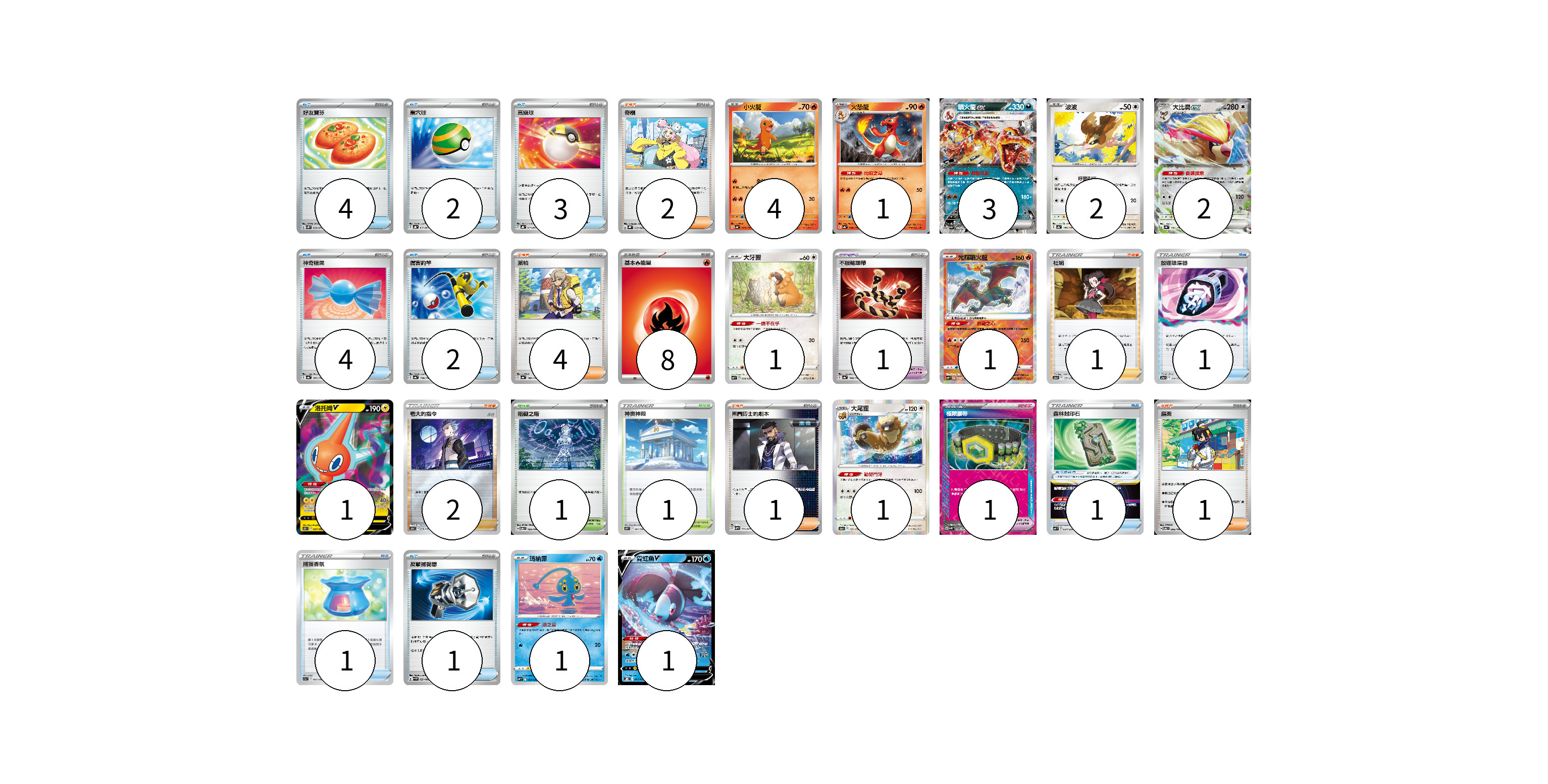 牌組構築方案 以此牌組為基礎新構築牌組 顯示卡面 顯示列表 寶可夢卡(18) 4 1 3 2 2 1 1 1 1 1 1 寶可夢道具(2) 1 1 物品卡(19) 4 2 3 4 2 1 1 1 1 支援者卡(11) 2 4 1 2 1 1 競技場卡(2) 1 1 能量卡(8) 8 寶可夢卡(18) 卡牌名稱 張數 卡牌名稱 張數 小火龍 SV4a 025/190 04 火恐龍 SV4a 026/190 01 噴火龍ex SV4a 115/190 03 波波 SV4a 137/190 02 大比鳥ex SV4a 139/190 02 大牙狸 SVF 008/038 01 光輝噴火龍 SVF 001/038 01 洛托姆V S11 037/100 01 大尾狸 S12a 122/172 01 瑪納霏 SVF 003/038 01 霓虹魚V SVHM 001/022 01 寶可夢道具(2) 卡牌名稱 張數 卡牌名稱 張數 不服輸頭帶 SV4a 168/190 01 極限腰帶 SV5K 066/071 01 物品卡(19) 卡牌名稱 張數 卡牌名稱 張數 好友寶芬 SV5K 063/071 04 巢穴球 SVHK 012/022 02 高級球 SVHK 013/022 03 神奇糖果 SV4a 163/190 04 厲害釣竿 SV4a 158/190 02 放逐吸塵器 S12a 144/172 01 森林封印石 SVF 024/038 01 捕獲香氛 S11a 060/068 01 反擊捕捉器 SV4M 059/066 01 支援者卡(11) 卡牌名稱 張數 卡牌名稱 張數 奇樹 SVHK 019/022 02 派帕 SV4a 180/190 04 杜娟 S12a 157/172 01 老大的指令(赤日) SO 028/030 02 弗圖博士的劇本 SVHM 021/022 01 烏栗 SV6 096/101 01 競技場卡(2) 卡牌名稱 張數 卡牌名稱 張數 阻礙之塔 SV6 100/101 01 神奧神殿 S10P 067/067 01 能量卡(8) 卡牌名稱 張數 卡牌名稱 張數 基本【火】能量 SVEL FIR 08 以此牌組為基礎新構築牌組 牌組編碼 IgsvHl-wfjjGS-hSuQXw copy 列印牌組單 牌組編碼已複製 分享至SNS