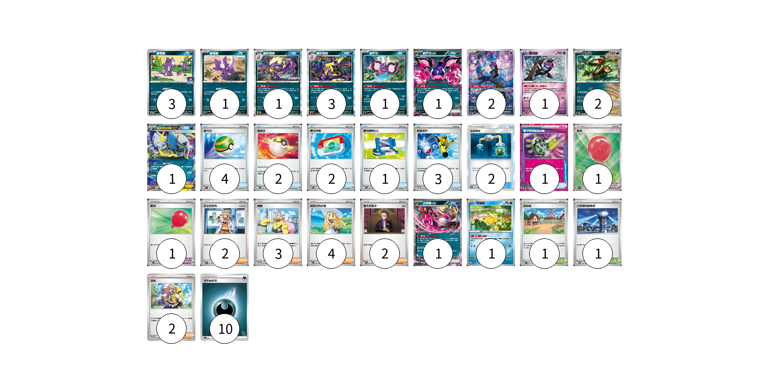 牌組構築方案 以此牌組為基礎新構築牌組 顯示卡面 顯示列表 寶可夢卡(18) 3 1 1 3 1 1 2 1 2 1 1 1 寶可夢道具(2) 1 1 物品卡(15) 4 2 2 1 3 2 1 支援者卡(13) 2 3 4 2 2 競技場卡(2) 1 1 能量卡(10) 10 寶可夢卡(18) 卡牌名稱 張數 卡牌名稱 張數 毒電嬰 M-P 044/M-P 03 毒電嬰 M2 056/080 01 顫弦蠑螈 M-P 031/M-P 01 顫弦蠑螈 M2 057/080 03 桃歹郎 MC 490/742 01 桃歹郎ex MC 491/742 01 願增猿 SV6 107/101 02 願增猿 M2a 081/193 01 猛惡菇 SV6 071/101 02 超級阿勃梭魯ex M1L 038/063 01 吉雉雞ex MC 489/742 01 可達鴨 M2a 032/193 01 寶可夢道具(2) 卡牌名稱 張數 卡牌名稱 張數 氣球 M1L 084/063 01 氣球 MC 688/742 01 物品卡(15) 卡牌名稱 張數 卡牌名稱 張數 巢穴球 SVM 133/175 04 高級球 MC 651/742 02 寶可平板 MC 662/742 02 寶可裝置3.0 MC 660/742 01 厲害釣竿 SVOD 010/020 03 能量轉移 AS6D 142/168 02 寶可夢旋風回收機 SV6 093/101 01 支援者卡(13) 卡牌名稱 張數 卡牌名稱 張數 博士的研究 SVK 032/042 02 奇樹 SVOD 016/020 03 莉莉艾的決意 MC 729/742 04 老大的指令 MC 724/742 02 派帕 SVOD 018/020 02 競技場卡(2) 卡牌名稱 張數 卡牌名稱 張數 深缽鎮 SVK 039/042 01 火箭隊的監視塔 M2a 189/193 01 能量卡(10) 卡牌名稱 張數 卡牌名稱 張數 基本惡能量 SH DAR 10 以此牌組為基礎新構築牌組 牌組編碼 IiCdke-fDTeUN-SnezGa copy 列印牌組單 牌組編碼已複製 分享至SNS