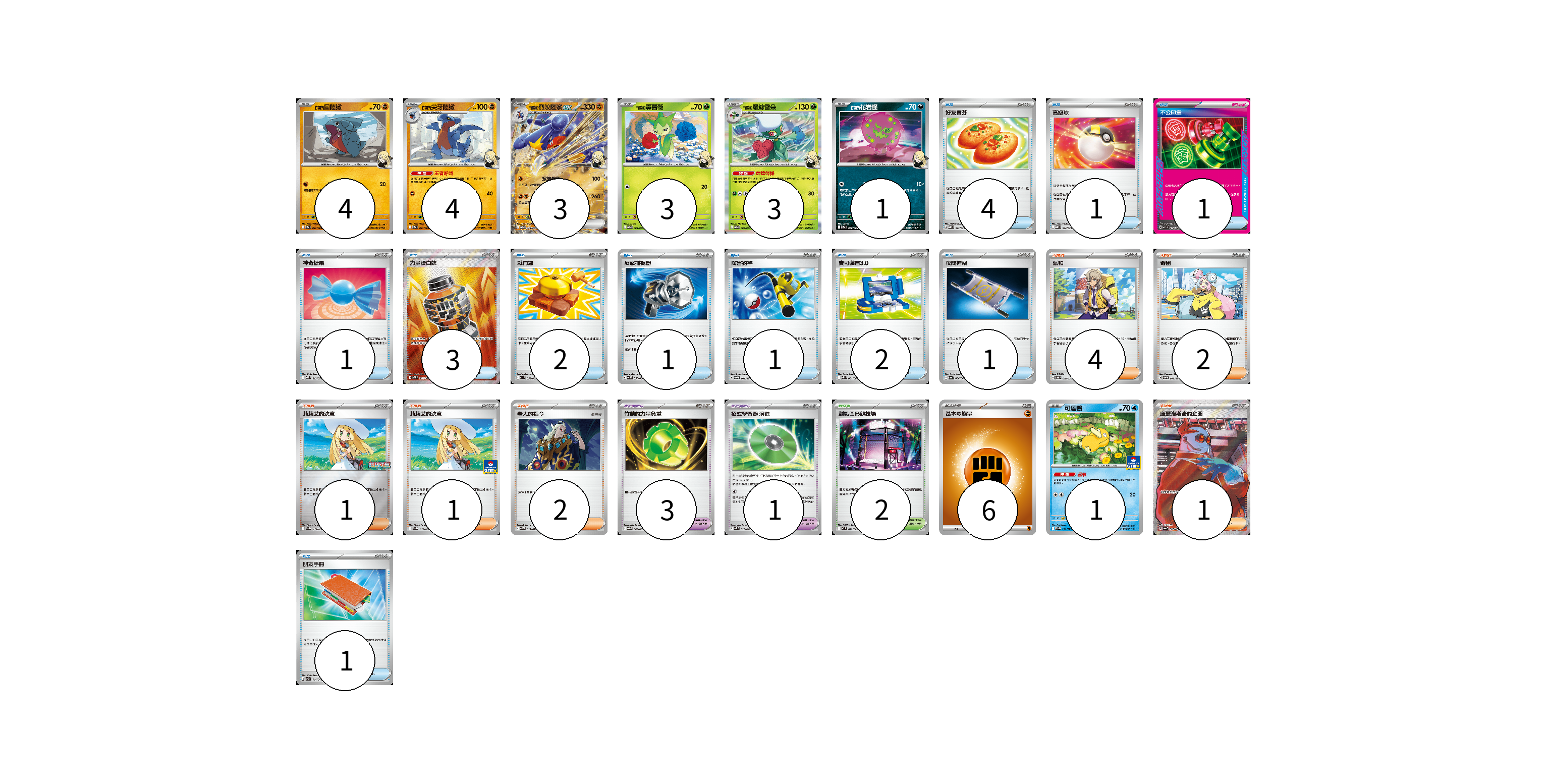 牌組構築方案 以此牌組為基礎新構築牌組 顯示卡面 顯示列表 寶可夢卡(19) 4 4 3 3 3 1 1 寶可夢道具(4) 3 1 物品卡(18) 4 1 1 1 3 2 1 1 2 1 1 支援者卡(11) 4 2 1 1 2 1 競技場卡(2) 2 能量卡(6) 6 寶可夢卡(19) 卡牌名稱 張數 卡牌名稱 張數 <竹蘭的>圓陸鯊 SV9a 042/063 04 <竹蘭的>尖牙陸鯊 SV9a 043/063 04 <竹蘭的>烈咬陸鯊ex SV9a 044/063 03 <竹蘭的>毒薔薇 SV9a 004/063 03 <竹蘭的>羅絲雷朵 SV9a 005/063 03 <竹蘭的>花岩怪 SV9a 050/063 01 可達鴨 SV-P 220/SV-P 01 寶可夢道具(4) 卡牌名稱 張數 卡牌名稱 張數 竹蘭的力量負重 SV9a 060/063 03 招式學習器 演進 SVK 025/042 01 物品卡(18) 卡牌名稱 張數 卡牌名稱 張數 好友寶芬 MBD 013/022 04 高級球 MBD 014/022 01 不公印章 MBD 011/022 01 神奇糖果 MBG 013/022 01 力量蛋白飲 M1L 081/063 03 戰鬥鑼 M1L 059/063 02 反擊捕捉器 SV4M 059/066 01 厲害釣竿 SVOM 011/021 01 寶可裝置3.0 SV11B 081/086 02 夜間擔架 SV6a 056/064 01 朋友手冊 SVK 014/042 01 支援者卡(11) 卡牌名稱 張數 卡牌名稱 張數 派帕 SVOD 018/020 04 奇樹 SVOM 018/021 02 莉莉艾的決意 M-P 011/M-P 01 莉莉艾的決意 M-P 018/M-P 01 老大的指令 SVHM 022/022 02 庫瑟洛斯奇的企圖 SV6a 086/064 01 競技場卡(2) 卡牌名稱 張數 卡牌名稱 張數 對戰圓形競技場 M2 079/080 02 能量卡(6) 卡牌名稱 張數 卡牌名稱 張數 基本【鬥】能量 M-P FIG 06 以此牌組為基礎新構築牌組 牌組編碼 IiLdUa-TIxJxO-wGNvjb copy 列印牌組單 牌組編碼已複製 分享至SNS