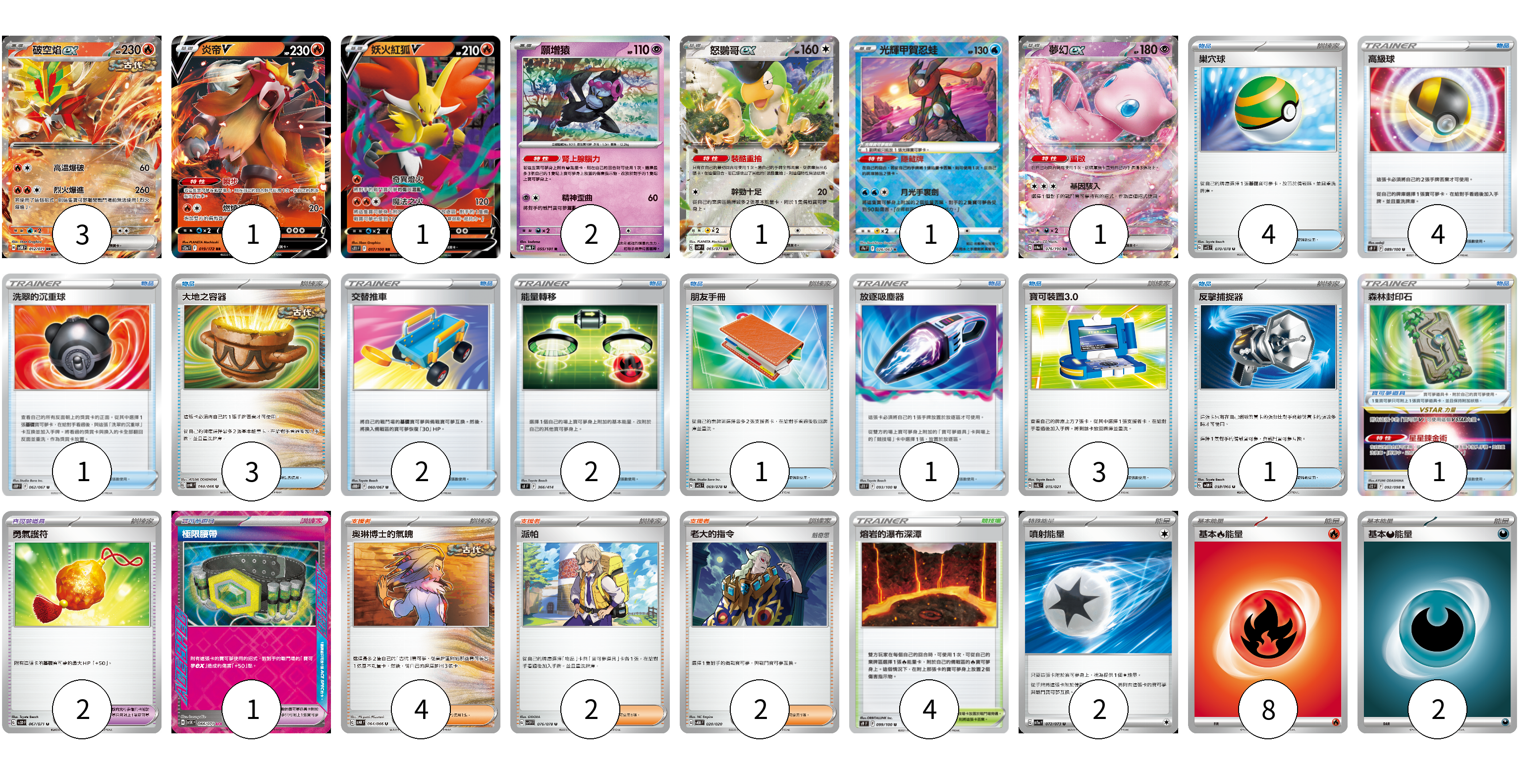 牌組構築方案 以此牌組為基礎新構築牌組 顯示卡面 顯示列表 寶可夢卡(10) 3 1 1 2 1 1 1 寶可夢道具(4) 1 2 1 物品卡(22) 4 4 1 3 2 2 1 1 3 1 支援者卡(8) 4 2 2 競技場卡(4) 4 能量卡(12) 2 8 2 寶可夢卡(10) 卡牌名稱 張數 卡牌名稱 張數 破空焰ex SV5K 012/071 03 炎帝V S12a 019/172 01 妖火紅狐V S11 017/100 01 願增猿 SV6 055/101 02 怒鸚哥ex SV2P 065/071 01 光輝甲賀忍蛙 S9a 026/067 01 夢幻ex SV4a 076/190 01 寶可夢道具(4) 卡牌名稱 張數 卡牌名稱 張數 森林封印石 S12 092/098 01 勇氣護符 SV2D 067/071 02 極限腰帶 SV5K 066/071 01 物品卡(22) 卡牌名稱 張數 卡牌名稱 張數 巢穴球 SV1S 070/078 04 高級球 S9 089/100 04 洗翠的沉重球 S10P 062/067 01 大地之容器 SV4K 060/066 03 交替推車 S10D 060/067 02 能量轉移 SI 366/414 02 朋友手冊 SV1S 069/078 01 放逐吸塵器 S11 093/100 01 寶可裝置3.0 SVAL 015/021 03 反擊捕捉器 SV4M 059/066 01 支援者卡(8) 卡牌名稱 張數 卡牌名稱 張數 奧琳博士的氣魄 SV4K 064/066 04 派帕 SV1V 076/078 02 老大的指令 SVEM 020/020 02 競技場卡(4) 卡牌名稱 張數 卡牌名稱 張數 熔岩的瀑布深潭 S9 099/100 04 能量卡(12) 卡牌名稱 張數 卡牌名稱 張數 噴射能量 SV1a 072/073 02 基本火能量 sv-p FIR 08 基本惡能量 sv-p DAR 02 以此牌組為基礎新構築牌組 牌組編碼 IkcCDz-gEiHif-bvKBCN copy 列印牌組單 牌組編碼已複製 分享至SNS