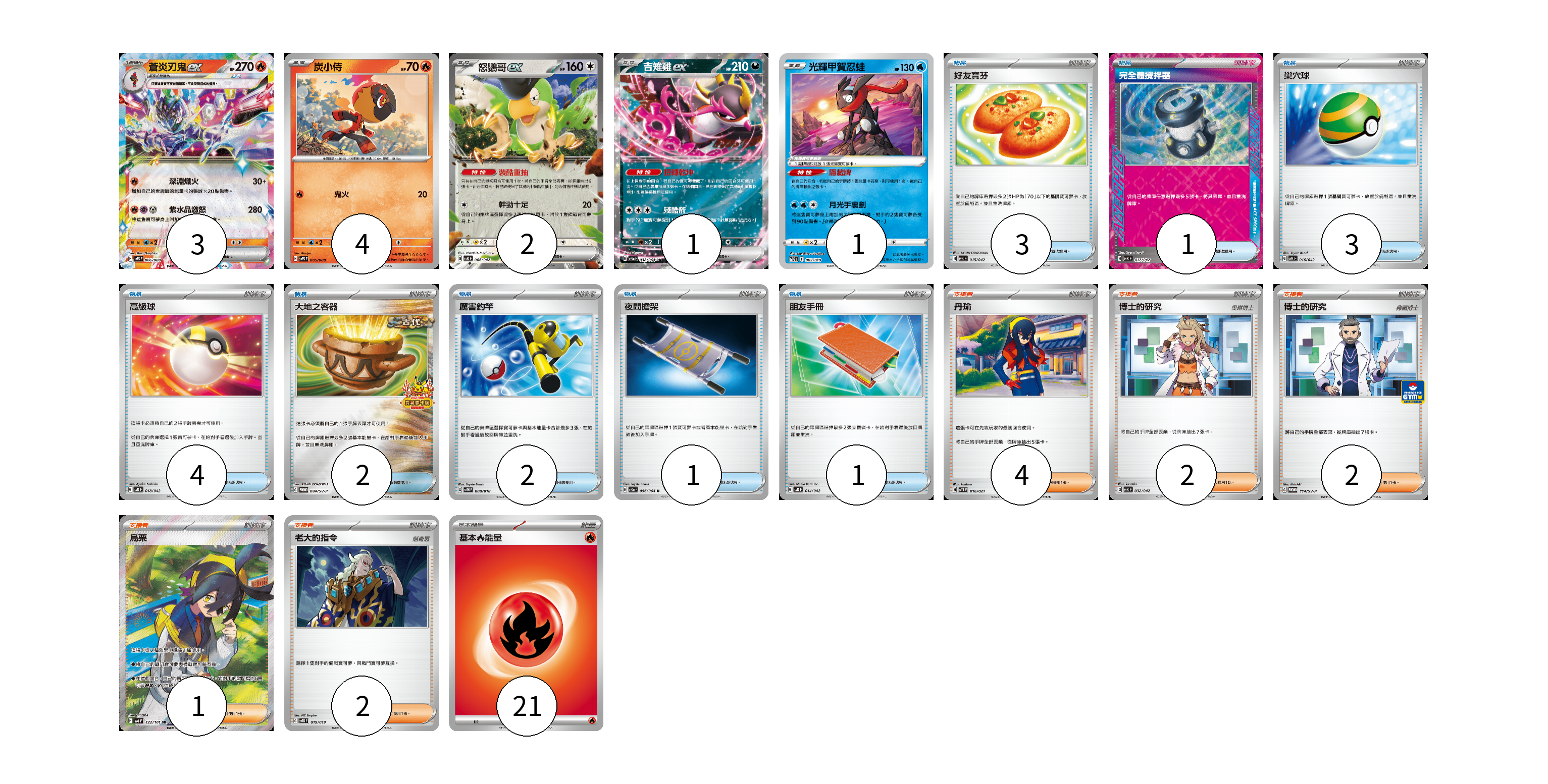 牌組構築方案 以此牌組為基礎新構築牌組 顯示卡面 顯示列表 寶可夢卡(11) 3 4 2 1 1 物品卡(17) 3 1 3 4 2 2 1 1 支援者卡(11) 4 2 2 1 2 能量卡(21) 21 寶可夢卡(11) 卡牌名稱 張數 卡牌名稱 張數 蒼炎刃鬼ex SVPS 006/008 03 炭小侍 SVPS 005/008 04 怒鸚哥ex SVK 006/042 02 吉雉雞ex SV6a 038/064 01 光輝甲賀忍蛙 SVTG 002/019 01 物品卡(17) 卡牌名稱 張數 卡牌名稱 張數 好友寶芬 SVK 015/042 03 完全體攪拌器 SVK 017/042 01 巢穴球 SVK 016/042 03 高級球 SVK 018/042 04 大地之容器 SV-P 084/SV-P 02 厲害釣竿 SVTH 008/018 02 夜間擔架 SV6a 056/064 01 朋友手冊 SVK 014/042 01 支援者卡(11) 卡牌名稱 張數 卡牌名稱 張數 丹瑜 SVTR 016/021 04 博士的研究 SVK 032/042 02 博士的研究 SV-P 114/SV-P 02 烏栗 SV6 122/101 01 老大的指令 SVTG 019/019 02 能量卡(21) 卡牌名稱 張數 卡牌名稱 張數 基本【火】能量 SVHK FIR 21 以此牌組為基礎新構築牌組 牌組編碼 IkzOLP-jkMqYP-fdfFfh copy 列印牌組單 牌組編碼已複製 分享至SNS