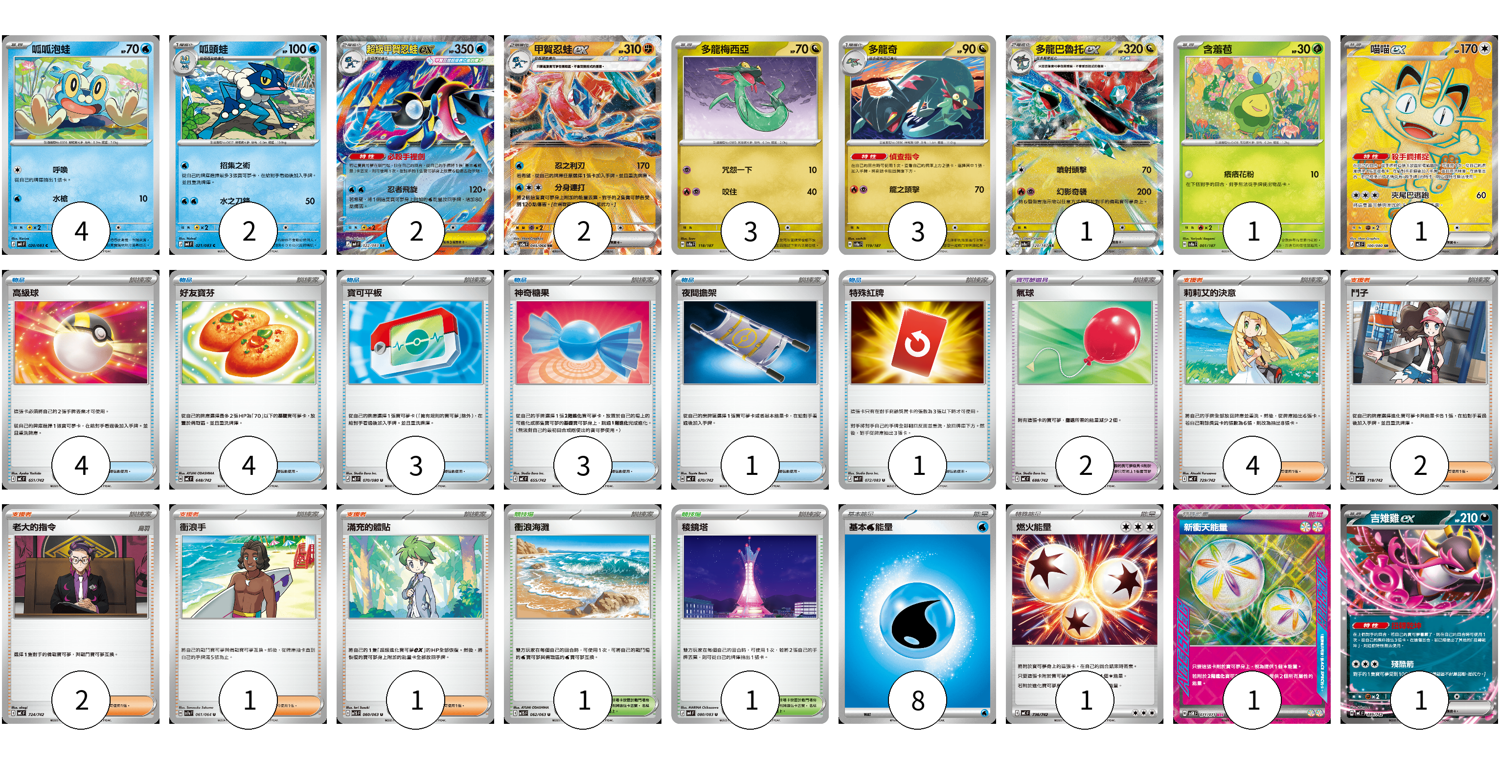 牌組構築方案 以此牌組為基礎新構築牌組 顯示卡面 顯示列表 寶可夢卡(20) 4 2 2 2 3 3 1 1 1 1 寶可夢道具(2) 2 物品卡(16) 4 4 3 3 1 1 支援者卡(10) 4 2 2 1 1 競技場卡(2) 1 1 能量卡(10) 8 1 1 寶可夢卡(20) 卡牌名稱 張數 卡牌名稱 張數 呱呱泡蛙 M4 020/083 04 呱頭蛙 M4 021/083 02 超級甲賀忍蛙ex M4 022/083 02 甲賀忍蛙ex SV5a 045/066 02 多龍梅西亞 SV8a 118/187 03 多龍奇 SV8a 119/187 03 多龍巴魯托ex SV8a 120/187 01 含羞苞 SV8a 001/187 01 喵喵ex M3 100/080 01 吉雉雞ex MC 489/742 01 寶可夢道具(2) 卡牌名稱 張數 卡牌名稱 張數 氣球 MC 688/742 02 物品卡(16) 卡牌名稱 張數 卡牌名稱 張數 高級球 MC 651/742 04 好友寶芬 MC 648/742 04 寶可平板 M3 070/080 03 神奇糖果 MC 655/742 03 夜間擔架 MC 670/742 01 特殊紅牌 M4 072/083 01 支援者卡(10) 卡牌名稱 張數 卡牌名稱 張數 莉莉艾的決意 MC 729/742 04 鬥子 MC 718/742 02 老大的指令 MC 724/742 02 衝浪手 SV7a 061/064 01 滿充的體貼 M1S 060/063 01 競技場卡(2) 卡牌名稱 張數 卡牌名稱 張數 衝浪海灘 M1S 062/063 01 稜鏡塔 M4 080/083 01 能量卡(10) 卡牌名稱 張數 卡牌名稱 張數 基本【水】能量 MC WAT 08 燃火能量 MC 736/742 01 新衝天能量 SV5K 071/071 01 以此牌組為基礎新構築牌組 牌組編碼 IlmGgn-lqXRye-dHHboN copy 列印牌組單 牌組編碼已複製 分享至SNS