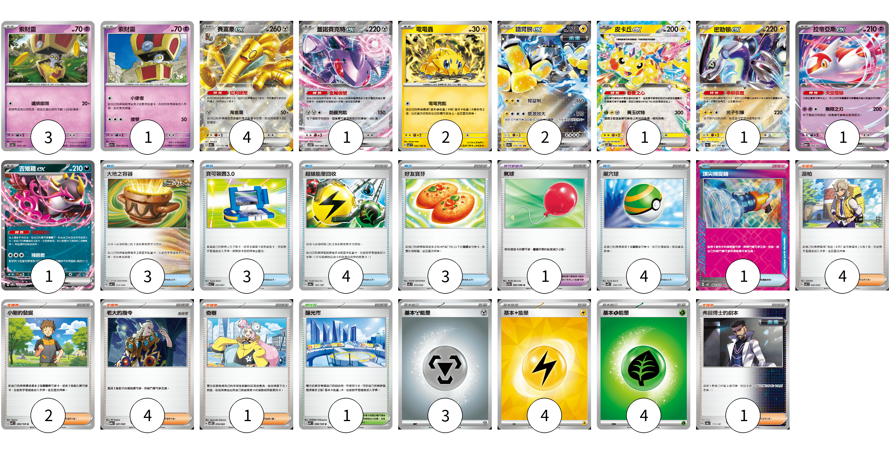 牌組構築方案 以此牌組為基礎新構築牌組 顯示卡面 顯示列表 寶可夢卡(17) 3 1 4 1 2 2 1 1 1 1 寶可夢道具(1) 1 物品卡(18) 3 3 4 3 4 1 支援者卡(12) 4 2 4 1 1 競技場卡(1) 1 能量卡(11) 3 4 4 寶可夢卡(17) 卡牌名稱 張數 卡牌名稱 張數 索財靈 SV8a 073/187 03 索財靈 SV7a 024/064 01 賽富豪ex SV8a 117/187 04 蓋諾賽克特ex SV11B 069/086 01 電電蟲 SV7 032/102 02 鐵臂膀ex SV8a 054/187 02 皮卡丘ex SV8 033/106 01 密勒頓ex SV4a 071/190 01 拉帝亞斯ex MBD 003/022 01 吉雉雞ex SVOD 004/020 01 寶可夢道具(1) 卡牌名稱 張數 卡牌名稱 張數 氣球 SV11B 082/086 01 物品卡(18) 卡牌名稱 張數 卡牌名稱 張數 大地之容器 SVK 012/042 03 寶可裝置3.0 SVC 015/021 03 超級能量回收 SV8a 141/187 04 好友寶芬 SVK 015/042 03 巢穴球 SVM 133/175 04 頂尖捕捉器 SV5M 062/071 01 支援者卡(12) 卡牌名稱 張數 卡牌名稱 張數 派帕 SVK 035/042 04 小剛的發掘 SV9 096/100 02 老大的指令 MBG 021/022 04 奇樹 SVOD 016/020 01 弗圖博士的劇本 SV8a 175/187 01 競技場卡(1) 卡牌名稱 張數 卡牌名稱 張數 釀光市 SV9 098/100 01 能量卡(11) 卡牌名稱 張數 卡牌名稱 張數 基本【鋼】能量 M-P MET 03 基本【雷】能量 SVQP LIG 04 基本【草】能量 M-P GRA 04 以此牌組為基礎新構築牌組 牌組編碼 InXCIF-JoxgfY-SwhXYw copy 列印牌組單 牌組編碼已複製 分享至SNS