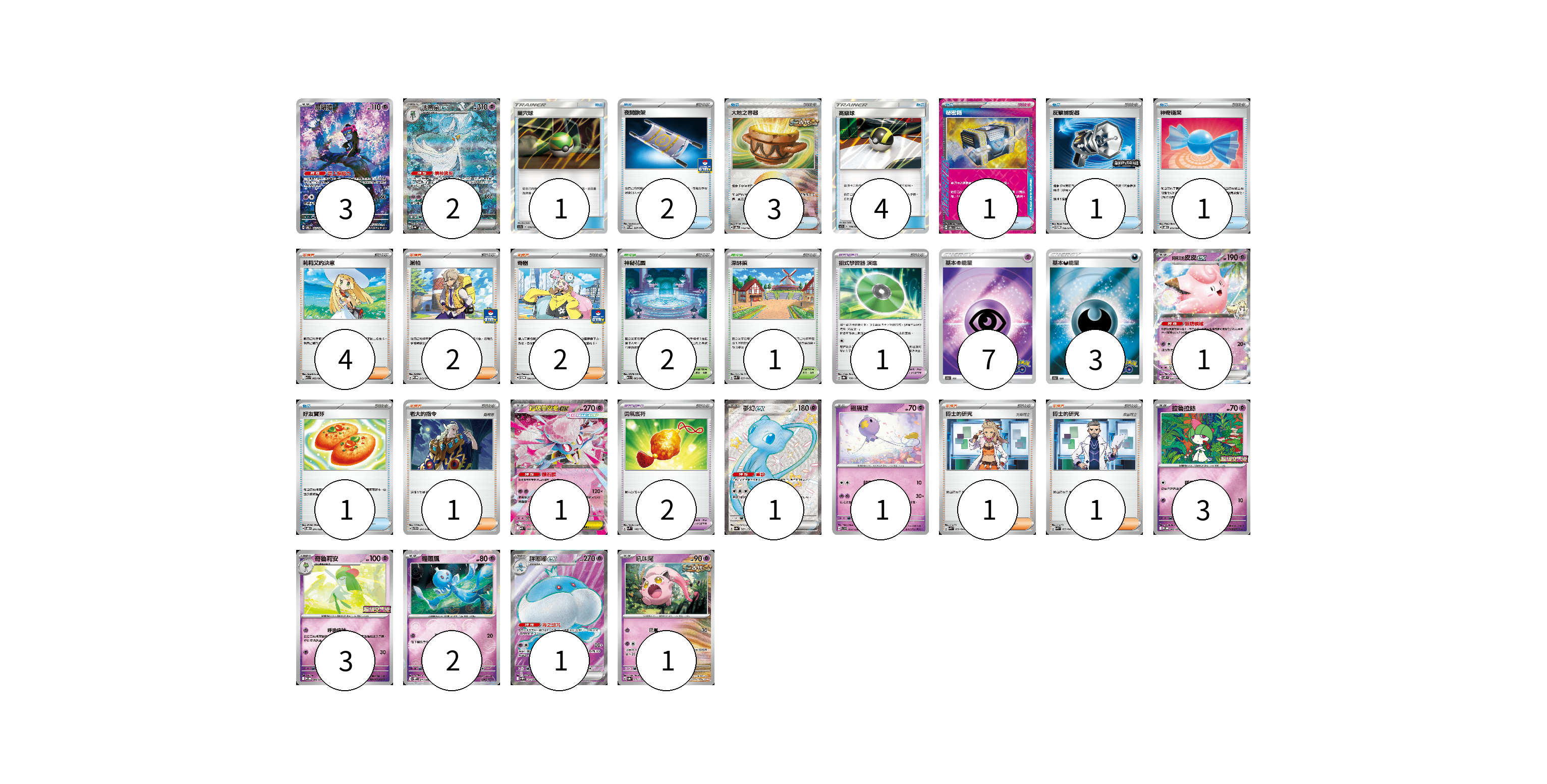 牌組構築方案 以此牌組為基礎新構築牌組 顯示卡面 顯示列表 寶可夢卡(19) 3 2 1 1 1 1 3 3 2 1 1 寶可夢道具(3) 1 2 物品卡(14) 1 2 3 4 1 1 1 1 支援者卡(11) 4 2 2 1 1 1 競技場卡(3) 2 1 能量卡(10) 7 3 寶可夢卡(19) 卡牌名稱 張數 卡牌名稱 張數 願增猿 SV6 107/101 03 沙奈朵ex SV4a 348/190 02 莉莉艾的皮皮ex SV9 033/100 01 超級蒂安希ex MBD 006/022 01 夢幻ex SV4a 327/190 01 飄飄球 SVD 052/139 01 拉魯拉絲 M-P 005/M-P 03 奇魯莉安 M-P 006/M-P 03 輕飄飄 SV11W 041/086 02 胖嘟嘟ex SV11W 162/086 01 吼叫尾 SV8a 071/187 01 寶可夢道具(3) 卡牌名稱 張數 卡牌名稱 張數 招式學習器 演進 SV8a 160/187 01 勇氣護符 SVM 142/175 02 物品卡(14) 卡牌名稱 張數 卡牌名稱 張數 巢穴球 AS5a 178/184 01 夜間擔架 SV-P 227/SV-P 02 大地之容器 SV8a 143/187 03 高級球 AS5b 178/186 04 秘密箱 SV6 092/101 01 反擊捕捉器 SV-P 136/SV-P 01 神奇糖果 SVOD 013/020 01 好友寶芬 SVOD 011/020 01 支援者卡(11) 卡牌名稱 張數 卡牌名稱 張數 莉莉艾的決意 M1L 062/063 04 派帕 SV-P 213/SV-P 02 奇樹 SV-P 106/SV-P 02 老大的指令 SVTH 017/018 01 博士的研究 SVK 032/042 01 博士的研究 SVK 033/042 01 競技場卡(3) 卡牌名稱 張數 卡牌名稱 張數 神秘花園 M1S 063/063 02 深缽鎮 SVK 039/042 01 能量卡(10) 卡牌名稱 張數 卡牌名稱 張數 基本超能量 S10b PSY 07 基本惡能量 S10b DAR 03 以此牌組為基礎新構築牌組 牌組編碼 IoLjeQ-CkdNJK-lVNURC copy 列印牌組單 牌組編碼已複製 分享至SNS