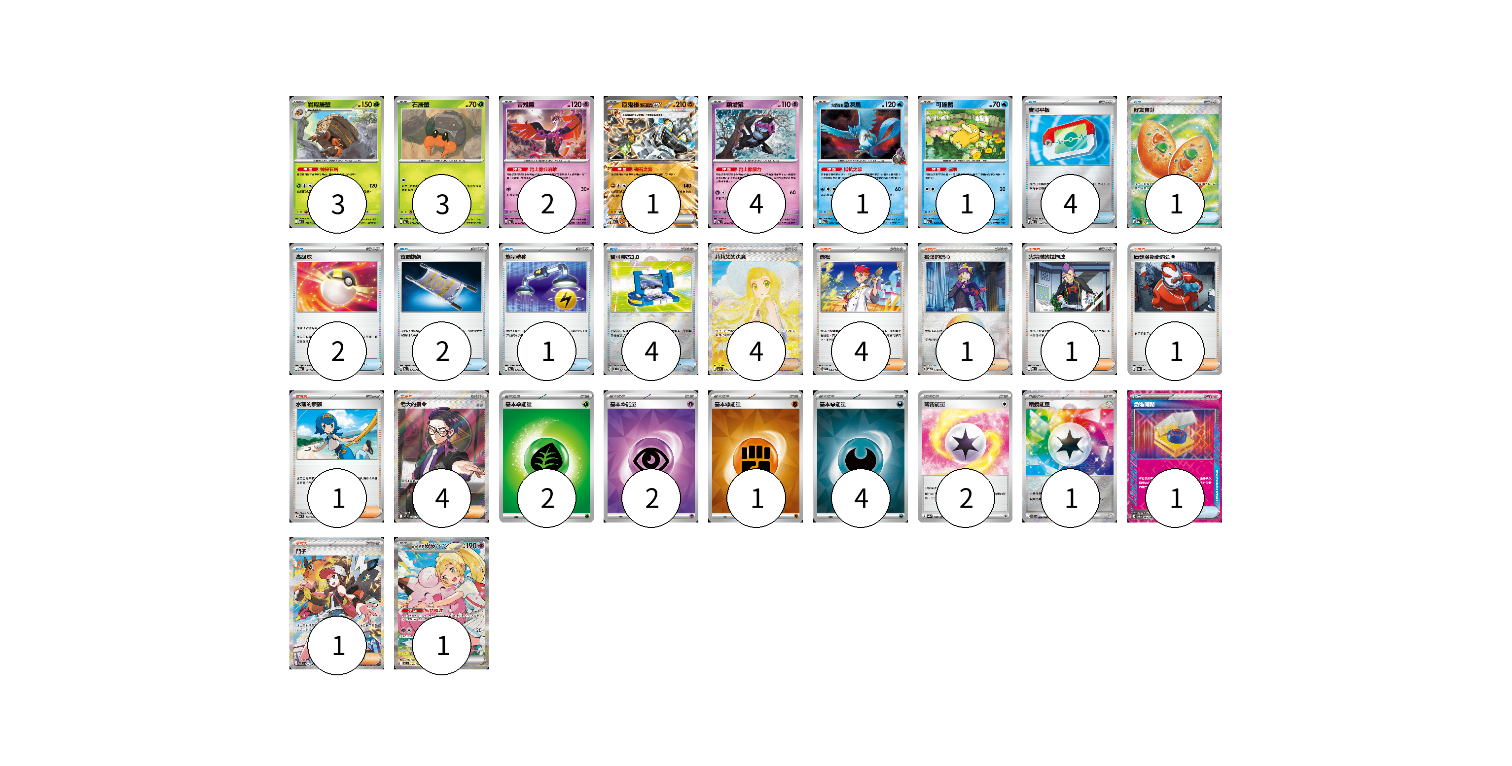 牌組構築方案 以此牌組為基礎新構築牌組 顯示卡面 顯示列表 寶可夢卡(16) 3 3 2 1 4 1 1 1 物品卡(15) 4 1 2 2 1 4 1 支援者卡(17) 4 4 1 1 1 1 4 1 能量卡(12) 2 2 1 4 2 1 寶可夢卡(16) 卡牌名稱 張數 卡牌名稱 張數 岩殿居蟹 MC 046/742 03 石居蟹 MC 045/742 03 吉雉雞 MC 359/742 02 厄鬼椪 礎石面具ex MC 428/742 01 願增猿 MC 358/742 04 <火箭隊的>急凍鳥 M2a 034/193 01 可達鴨 M2a 032/193 01 莉莉艾的皮皮ex MC 765/742 01 物品卡(15) 卡牌名稱 張數 卡牌名稱 張數 寶可平板 MC 662/742 04 好友寶芬 M1S 081/063 01 高級球 MBD 014/022 02 夜間擔架 MC 670/742 02 能量轉移 MC 638/742 01 寶可裝置3.0 SV11B 081/086 04 急進開關 SV8 095/106 01 支援者卡(17) 卡牌名稱 張數 卡牌名稱 張數 莉莉艾的決意 M1L 091/063 04 赤松 SV7 097/102 04 松葉的信心 SV8a 178/187 01 火箭隊的拉姆達 MC 734/742 01 庫瑟洛斯奇的企圖 SV6a 062/064 01 水蓮的照顧 MC 712/742 01 老大的指令(烏羽) MC 760/742 04 鬥子 SV11W 173/086 01 能量卡(12) 卡牌名稱 張數 卡牌名稱 張數 基本【草】能量 MJ GRA 02 基本【超】能量 SVOD PSY 02 基本【鬥】能量 SVM FIG 01 基本【惡】能量 SVM DAR 04 薄霧能量 SV8a 186/187 02 稜鏡能量 SV11B 086/086 01 以此牌組為基礎新構築牌組 牌組編碼 IpilJr-QJkpKP-MvEDQZ copy 列印牌組單 牌組編碼已複製 分享至SNS