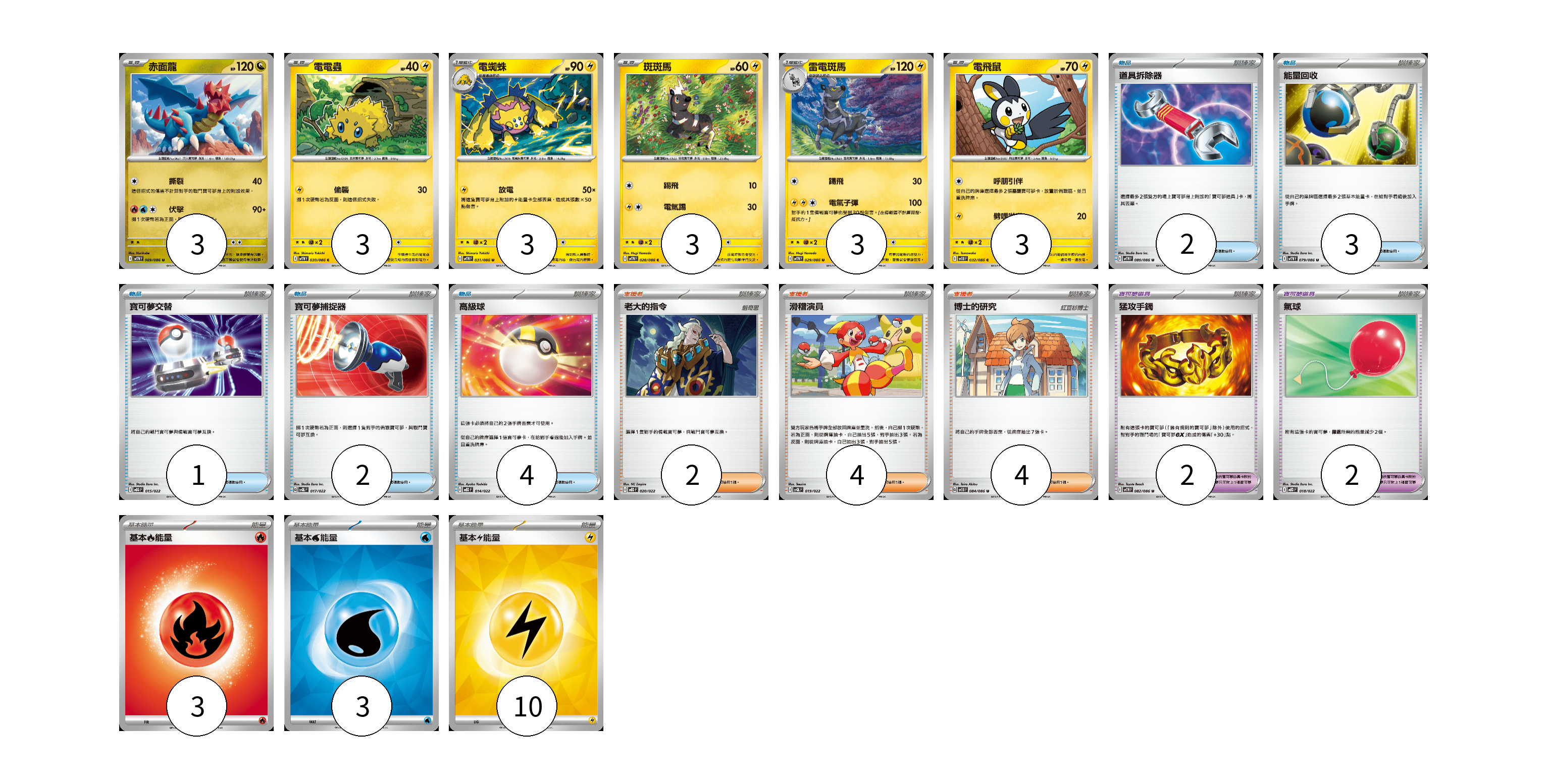 牌組構築方案 以此牌組為基礎新構築牌組 顯示卡面 顯示列表 寶可夢卡(18) 3 3 3 3 3 3 寶可夢道具(4) 2 2 物品卡(12) 2 3 1 2 4 支援者卡(10) 2 4 4 能量卡(16) 3 3 10 寶可夢卡(18) 卡牌名稱 張數 卡牌名稱 張數 赤面龍 SV11W 069/086 03 電電蟲 SV11W 030/086 03 電蜘蛛 SV11W 031/086 03 斑斑馬 SV11W 028/086 03 雷電斑馬 SV11W 029/086 03 電飛鼠 SV11B 032/086 03 寶可夢道具(4) 卡牌名稱 張數 卡牌名稱 張數 猛攻手鐲 SV11W 082/086 02 氣球 MBD 018/022 02 物品卡(12) 卡牌名稱 張數 卡牌名稱 張數 道具拆除器 SV11W 080/086 02 能量回收 SV11W 079/086 03 寶可夢交替 MBG 015/022 01 寶可夢捕捉器 SVQL 017/022 02 高級球 MBD 014/022 04 支援者卡(10) 卡牌名稱 張數 卡牌名稱 張數 老大的指令 MBD 020/022 02 滑稽演員 SVQL 019/022 04 博士的研究 SV11B 084/086 04 能量卡(16) 卡牌名稱 張數 卡牌名稱 張數 基本【火】能量 M-P FIR 03 基本【水】能量 SVK WAT 03 基本【雷】能量 SVQP LIG 10 以此牌組為基礎新構築牌組 牌組編碼 IqFMFs-PrfTua-IwCtQL copy 列印牌組單 牌組編碼已複製 分享至SNS