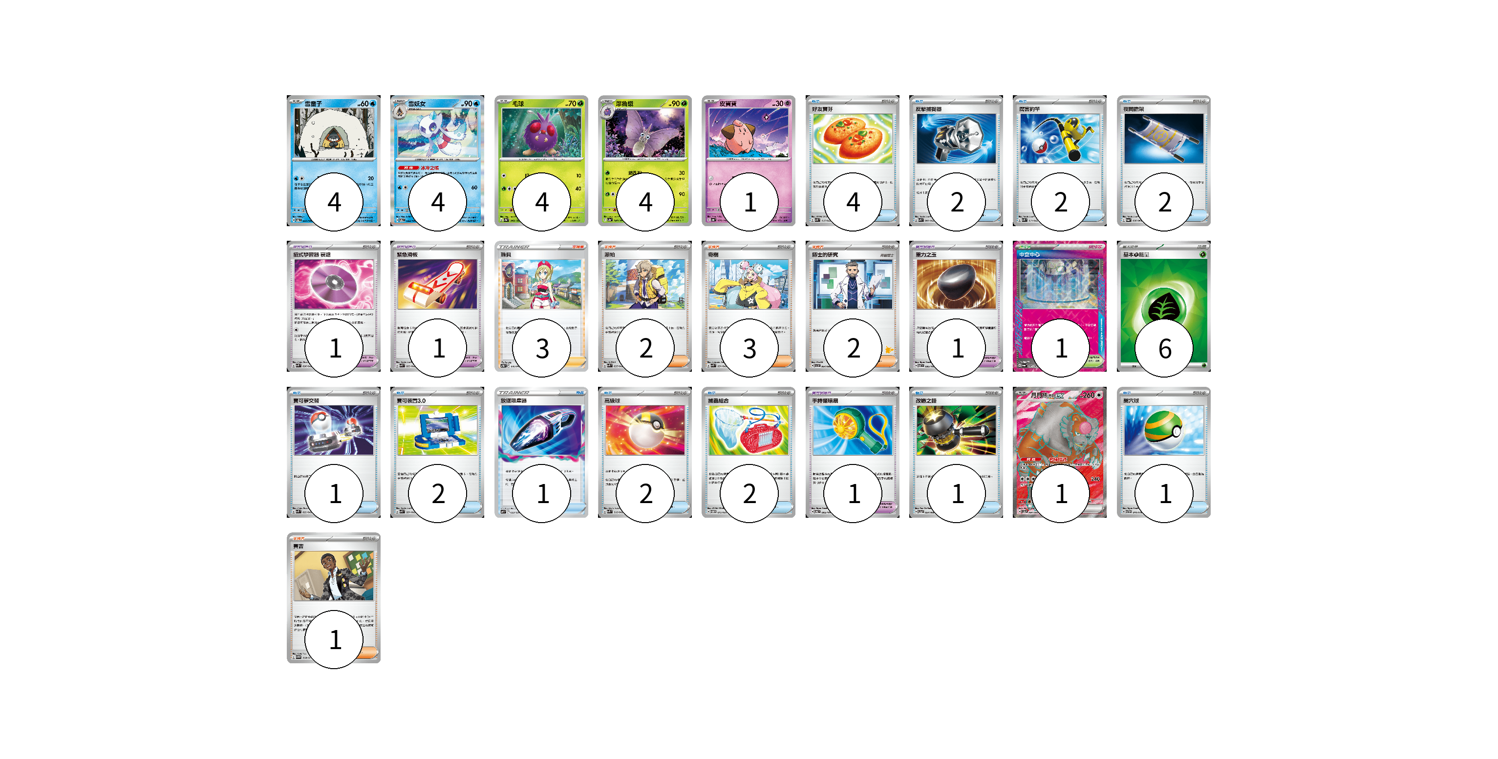 牌組構築方案 以此牌組為基礎新構築牌組 顯示卡面 顯示列表 寶可夢卡(18) 4 4 4 4 1 1 寶可夢道具(4) 1 1 1 1 物品卡(20) 4 2 2 2 1 2 1 2 2 1 1 支援者卡(11) 3 2 3 2 1 競技場卡(1) 1 能量卡(6) 6 寶可夢卡(18) 卡牌名稱 張數 卡牌名稱 張數 雪童子 SV6 031/101 04 雪妖女 SV6 033/101 04 毛球 SV2a 048/165 04 摩魯蛾 SV2a 049/165 04 皮寶寶 SV4a 077/190 01 月月熊 赫月 ex SV5a 084/066 01 寶可夢道具(4) 卡牌名稱 張數 卡牌名稱 張數 招式學習器 衰退 SVK 026/042 01 緊急滑板 SVK 023/042 01 重力之玉 SV7 095/102 01 手持循環扇 SV6 095/101 01 物品卡(20) 卡牌名稱 張數 卡牌名稱 張數 好友寶芬 SVK 015/042 04 反擊捕捉器 SVK 009/042 02 厲害釣竿 SVK 011/042 02 夜間擔架 SV6a 056/064 02 寶可夢交替 SVK 022/042 01 寶可裝置3.0 SVK 021/042 02 放逐吸塵器 SVF 023/038 01 高級球 SVK 018/042 02 捕蟲組合 SVTM 015/022 02 改造之錘 SV5a 054/066 01 巢穴球 SVTH 010/018 01 支援者卡(11) 卡牌名稱 張數 卡牌名稱 張數 珠貝 SVTG 016/019 03 派帕 SVK 035/042 02 奇樹 SVK 031/042 03 博士的研究 SVI 064/066 02 賽吉 SV5M 068/071 01 競技場卡(1) 卡牌名稱 張數 卡牌名稱 張數 中立中心 SV6a 063/064 01 能量卡(6) 卡牌名稱 張數 卡牌名稱 張數 基本【草】能量 SVK GRA 06 以此牌組為基礎新構築牌組 牌組編碼 IrFYmf-ExtHFe-wFWyvE copy 列印牌組單 牌組編碼已複製 分享至SNS