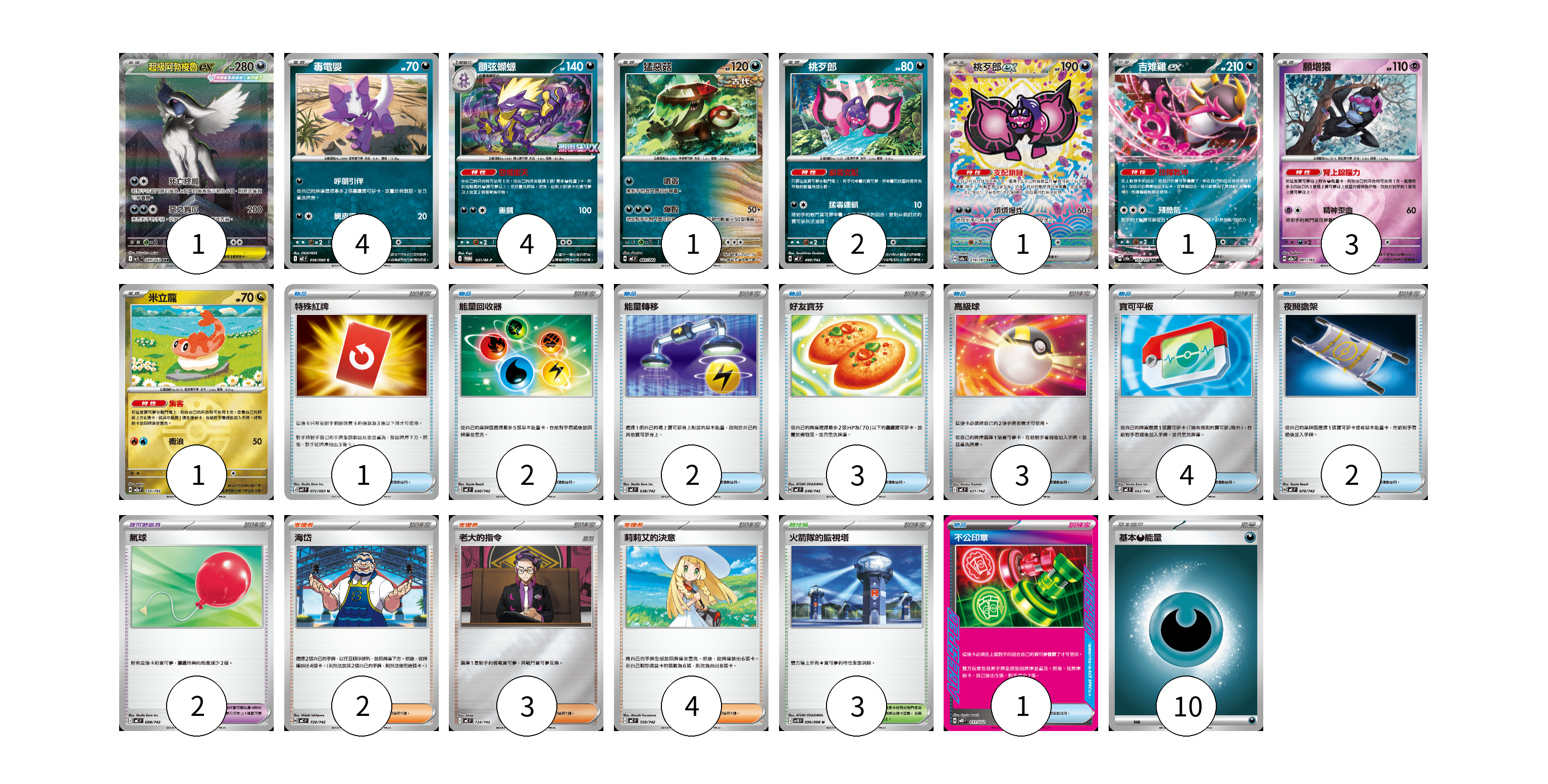 牌組構築方案 以此牌組為基礎新構築牌組 顯示卡面 顯示列表 寶可夢卡(18) 1 4 4 1 2 1 1 3 1 寶可夢道具(2) 2 物品卡(18) 1 2 2 3 3 4 2 1 支援者卡(9) 2 3 4 競技場卡(3) 3 能量卡(10) 10 寶可夢卡(18) 卡牌名稱 張數 卡牌名稱 張數 超級阿勃梭魯ex M1L 089/063 01 毒電嬰 M2 056/080 04 顫弦蠑螈 M-P 031/M-P 04 猛惡菇 MC 487/742 01 桃歹郎 MC 490/742 02 桃歹郎ex SV8a 219/187 01 吉雉雞ex SV8a 104/187 01 願增猿 M2a 081/193 03 米立龍 M2a 135/193 01 寶可夢道具(2) 卡牌名稱 張數 卡牌名稱 張數 氣球 MC 688/742 02 物品卡(18) 卡牌名稱 張數 卡牌名稱 張數 特殊紅牌 M4 072/083 01 能量回收器 MC 640/742 02 能量轉移 MC 638/742 02 好友寶芬 MC 648/742 03 高級球 MC 651/742 03 寶可平板 MC 662/742 04 夜間擔架 MC 670/742 02 不公印章 MBD 011/022 01 支援者卡(9) 卡牌名稱 張數 卡牌名稱 張數 海岱 MC 720/742 02 老大的指令 MC 724/742 03 莉莉艾的決意 MC 729/742 04 競技場卡(3) 卡牌名稱 張數 卡牌名稱 張數 火箭隊的監視塔 SV10 096/098 03 能量卡(10) 卡牌名稱 張數 卡牌名稱 張數 基本【惡】能量 MC DAR 10 以此牌組為基礎新構築牌組 牌組編碼 IuaQrd-qwWTzA-RRhhwM copy 列印牌組單 牌組編碼已複製 分享至SNS