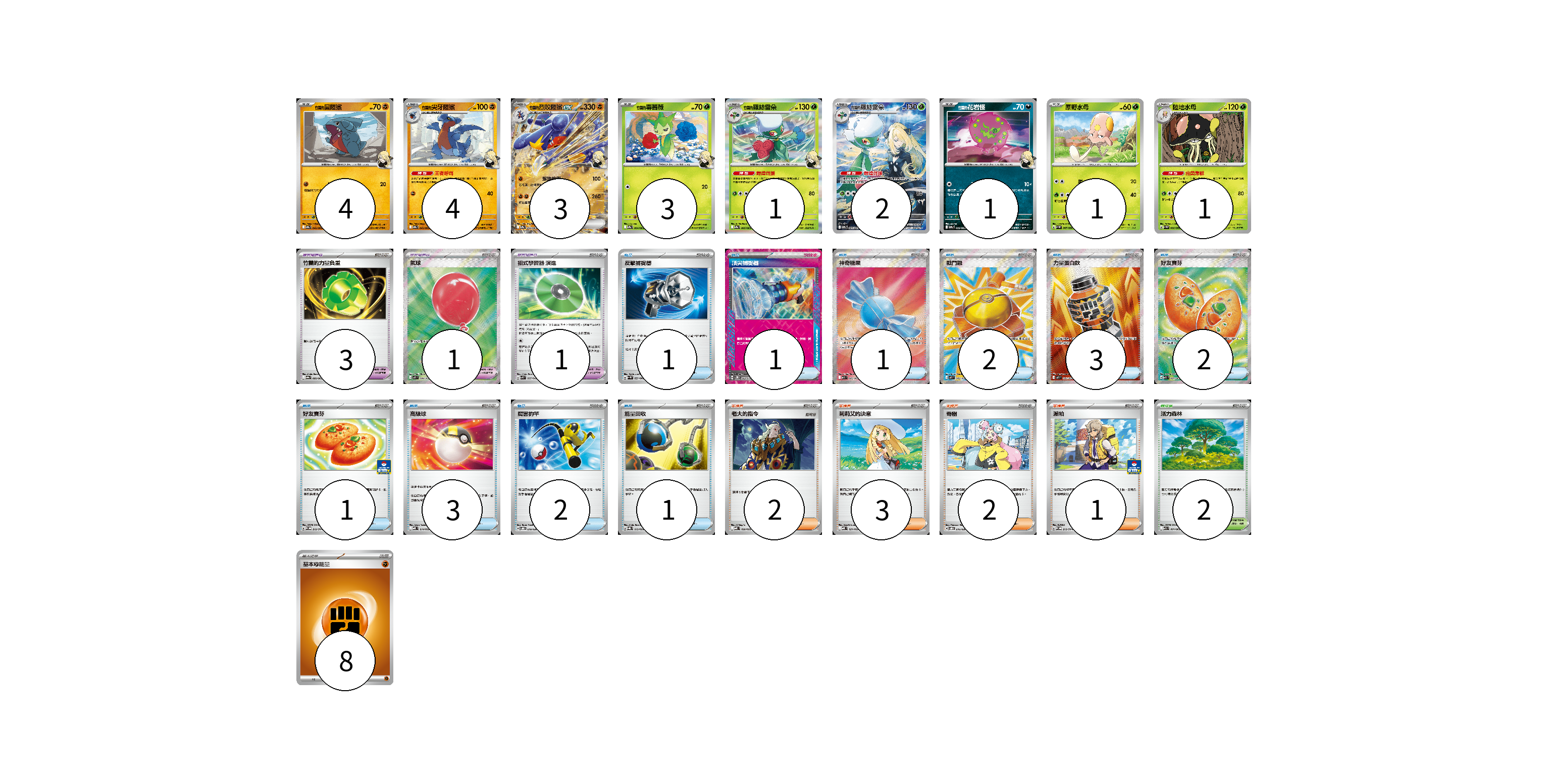 牌組構築方案 以此牌組為基礎新構築牌組 顯示卡面 顯示列表 寶可夢卡(20) 4 4 3 3 1 2 1 1 1 寶可夢道具(5) 3 1 1 物品卡(17) 1 1 1 2 3 2 1 3 2 1 支援者卡(8) 2 3 2 1 競技場卡(2) 2 能量卡(8) 8 寶可夢卡(20) 卡牌名稱 張數 卡牌名稱 張數 <竹蘭的>圓陸鯊 SV9a 042/063 04 <竹蘭的>尖牙陸鯊 SV9a 043/063 04 <竹蘭的>烈咬陸鯊ex SV9a 044/063 03 <竹蘭的>毒薔薇 SV9a 004/063 03 <竹蘭的>羅絲雷朵 SV9a 005/063 01 <竹蘭的>羅絲雷朵 SV9a 065/063 02 <竹蘭的>花岩怪 SV9a 050/063 01 原野水母 SV4M 007/066 01 陸地水母 SV4M 008/066 01 寶可夢道具(5) 卡牌名稱 張數 卡牌名稱 張數 竹蘭的力量負重 SV9a 060/063 03 氣球 M1L 084/063 01 招式學習器 演進 SVK 025/042 01 物品卡(17) 卡牌名稱 張數 卡牌名稱 張數 反擊捕捉器 SV4M 059/066 01 頂尖捕捉器 SV5M 062/071 01 神奇糖果 M1S 082/063 01 戰鬥鑼 M1L 082/063 02 力量蛋白飲 M1L 081/063 03 好友寶芬 M1S 081/063 02 好友寶芬 SV-P 212/SV-P 01 高級球 MBD 014/022 03 厲害釣竿 SVOD 010/020 02 能量回收 SVQL 012/022 01 支援者卡(8) 卡牌名稱 張數 卡牌名稱 張數 老大的指令 MBD 020/022 02 莉莉艾的決意 MBD 021/022 03 奇樹 SVOD 016/020 02 派帕 SV-P 213/SV-P 01 競技場卡(2) 卡牌名稱 張數 卡牌名稱 張數 活力森林 M1S 061/063 02 能量卡(8) 卡牌名稱 張數 卡牌名稱 張數 基本鬥能量 sv-p FIG 08 以此牌組為基礎新構築牌組 牌組編碼 IucIXs-fsAFsE-lTVBNP copy 列印牌組單 牌組編碼已複製 分享至SNS