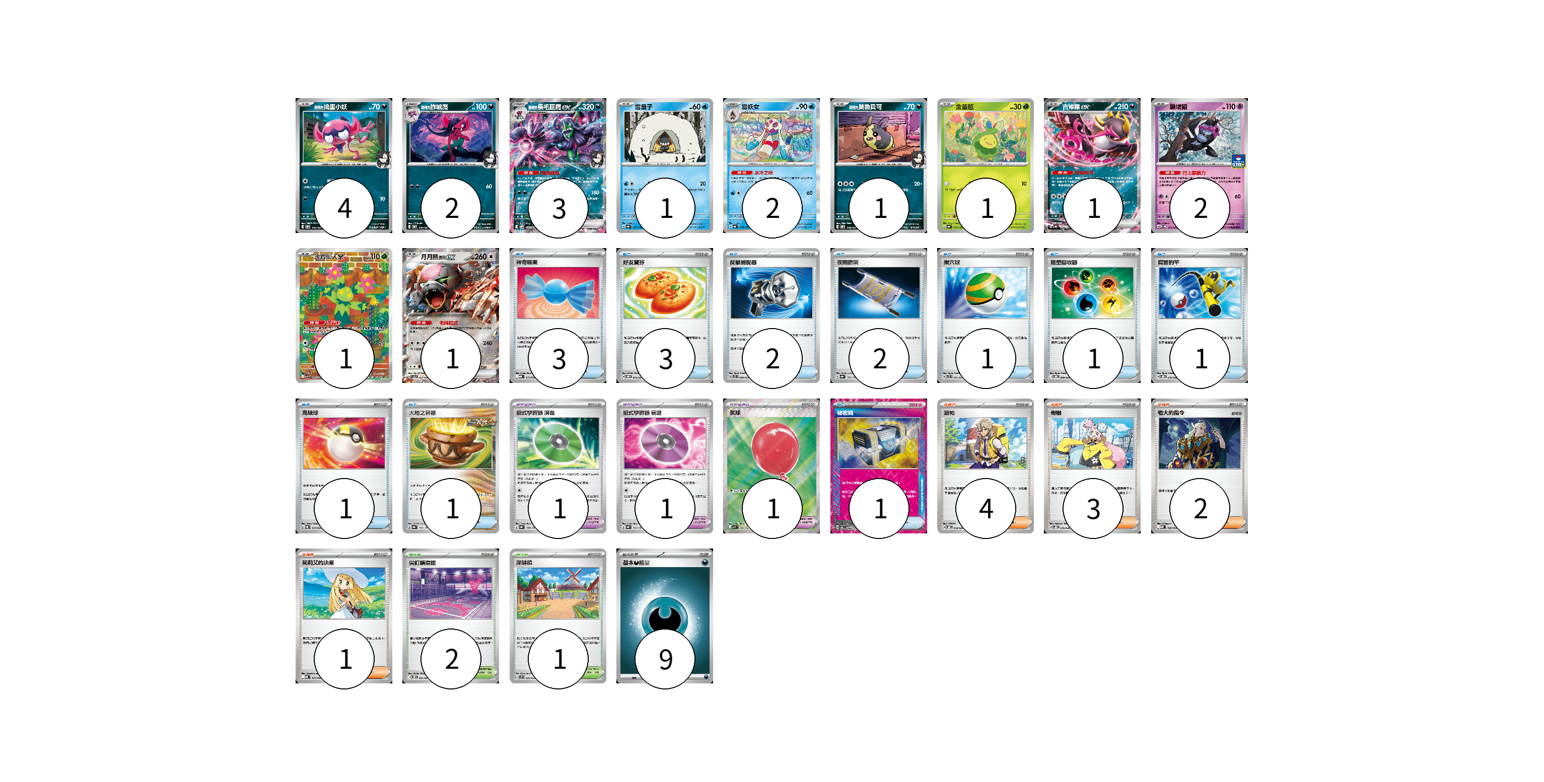 牌組構築方案 以此牌組為基礎新構築牌組 顯示卡面 顯示列表 寶可夢卡(19) 4 2 3 1 2 1 1 1 2 1 1 寶可夢道具(3) 1 1 1 物品卡(16) 3 3 2 2 1 1 1 1 1 1 支援者卡(10) 4 3 2 1 競技場卡(3) 2 1 能量卡(9) 9 寶可夢卡(19) 卡牌名稱 張數 卡牌名稱 張數 <瑪俐的>搗蛋小妖 SVOM 005/021 04 <瑪俐的>詐唬魔 SVOM 006/021 02 <瑪俐的>長毛巨魔ex SVOM 007/021 03 雪童子 SV8a 037/187 01 雪妖女 SV8a 038/187 02 <瑪俐的>莫魯貝可 SVOM 008/021 01 含羞苞 SV8a 001/187 01 吉雉雞ex SV8a 104/187 01 願增猿 M-P 014/M-P 02 沙鈴仙人掌 SV9 101/100 01 月月熊 赫月 ex SV5a 052/066 01 寶可夢道具(3) 卡牌名稱 張數 卡牌名稱 張數 招式學習器 演進 SV8a 160/187 01 招式學習器 衰退 SV8a 161/187 01 氣球 M1L 084/063 01 物品卡(16) 卡牌名稱 張數 卡牌名稱 張數 神奇糖果 MBG 013/022 03 好友寶芬 SVOM 012/021 03 反擊捕捉器 SVTS 009/022 02 夜間擔架 SV8a 151/187 02 巢穴球 SVTL 011/021 01 能量回收器 SVOD 009/020 01 厲害釣竿 SVOD 010/020 01 高級球 SVQL 015/022 01 大地之容器 SV8a 143/187 01 秘密箱 SV6 092/101 01 支援者卡(10) 卡牌名稱 張數 卡牌名稱 張數 派帕 SVOD 018/020 04 奇樹 SVOD 016/020 03 老大的指令 MBD 020/022 02 莉莉艾的決意 MBD 021/022 01 競技場卡(3) 卡牌名稱 張數 卡牌名稱 張數 尖釘鎮道館 SVOM 021/021 02 深缽鎮 SVF 036/038 01 能量卡(9) 卡牌名稱 張數 卡牌名稱 張數 基本【惡】能量 MBG DAR 09 以此牌組為基礎新構築牌組 牌組編碼 IueQUs-nBpvcG-LuesME copy 列印牌組單 牌組編碼已複製 分享至SNS