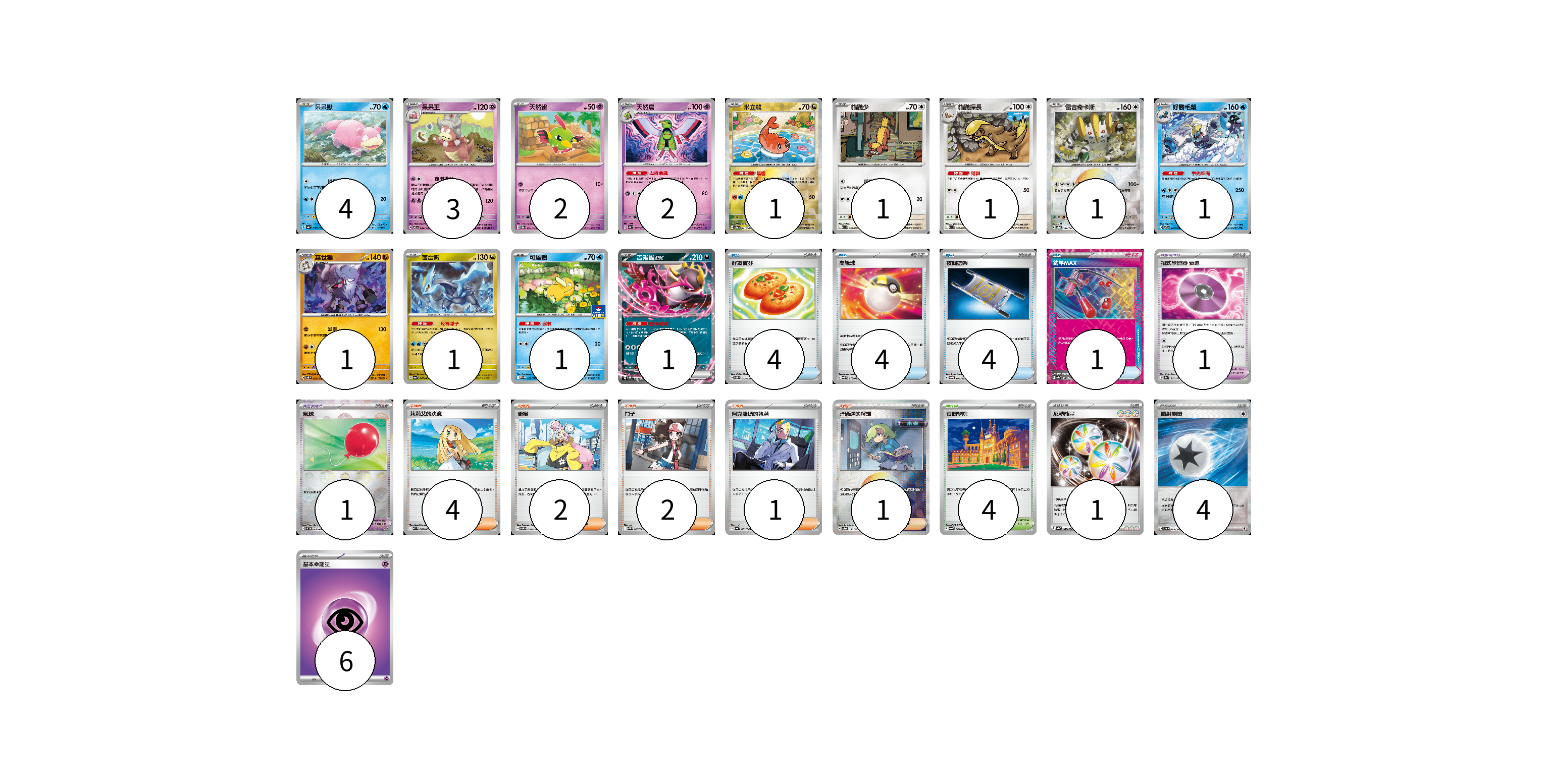 牌組構築方案 以此牌組為基礎新構築牌組 顯示卡面 顯示列表 寶可夢卡(20) 4 3 2 2 1 1 1 1 1 1 1 1 1 寶可夢道具(2) 1 1 物品卡(13) 4 4 4 1 支援者卡(10) 4 2 2 1 1 競技場卡(4) 4 能量卡(11) 1 4 6 寶可夢卡(20) 卡牌名稱 張數 卡牌名稱 張數 呆呆獸 SV4a 036/190 04 呆呆王 SV7 039/102 03 天然雀 SVEM 004/020 02 天然鳥 SV4a 079/190 02 米立龍 SV8a 121/187 01 貓鼬少 M1L 055/063 01 貓鼬探長 M1L 056/063 01 雷吉奇卡斯 SV8a 132/187 01 好勝毛蟹 SV7 024/102 01 棄世猴 SV8 062/106 01 酋雷姆 SV6a 047/064 01 可達鴨 SV-P 220/SV-P 01 吉雉雞ex SVOM 009/021 01 寶可夢道具(2) 卡牌名稱 張數 卡牌名稱 張數 招式學習器 衰退 SV8a 161/187 01 氣球 SV11B 082/086 01 物品卡(13) 卡牌名稱 張數 卡牌名稱 張數 好友寶芬 SVOM 012/021 04 高級球 SVQP 015/023 04 夜間擔架 SVOM 016/021 04 釣竿MAX SV8a 142/187 01 支援者卡(10) 卡牌名稱 張數 卡牌名稱 張數 莉莉艾的決意 M1L 062/063 04 奇樹 SVOM 018/021 02 鬥子 SV11W 085/086 02 阿克羅瑪的執著 SV6a 059/064 01 暗碼迷的解讀 SV8a 165/187 01 競技場卡(4) 卡牌名稱 張數 卡牌名稱 張數 夜間學院 SV6a 064/064 04 能量卡(11) 卡牌名稱 張數 卡牌名稱 張數 反轉能量 SV4a 189/190 01 噴射能量 SV8a 185/187 04 基本超能量 sv-p PSY 06 以此牌組為基礎新構築牌組 牌組編碼 IvibRA-FRLgMm-ZMJscq copy 列印牌組單 牌組編碼已複製 分享至SNS