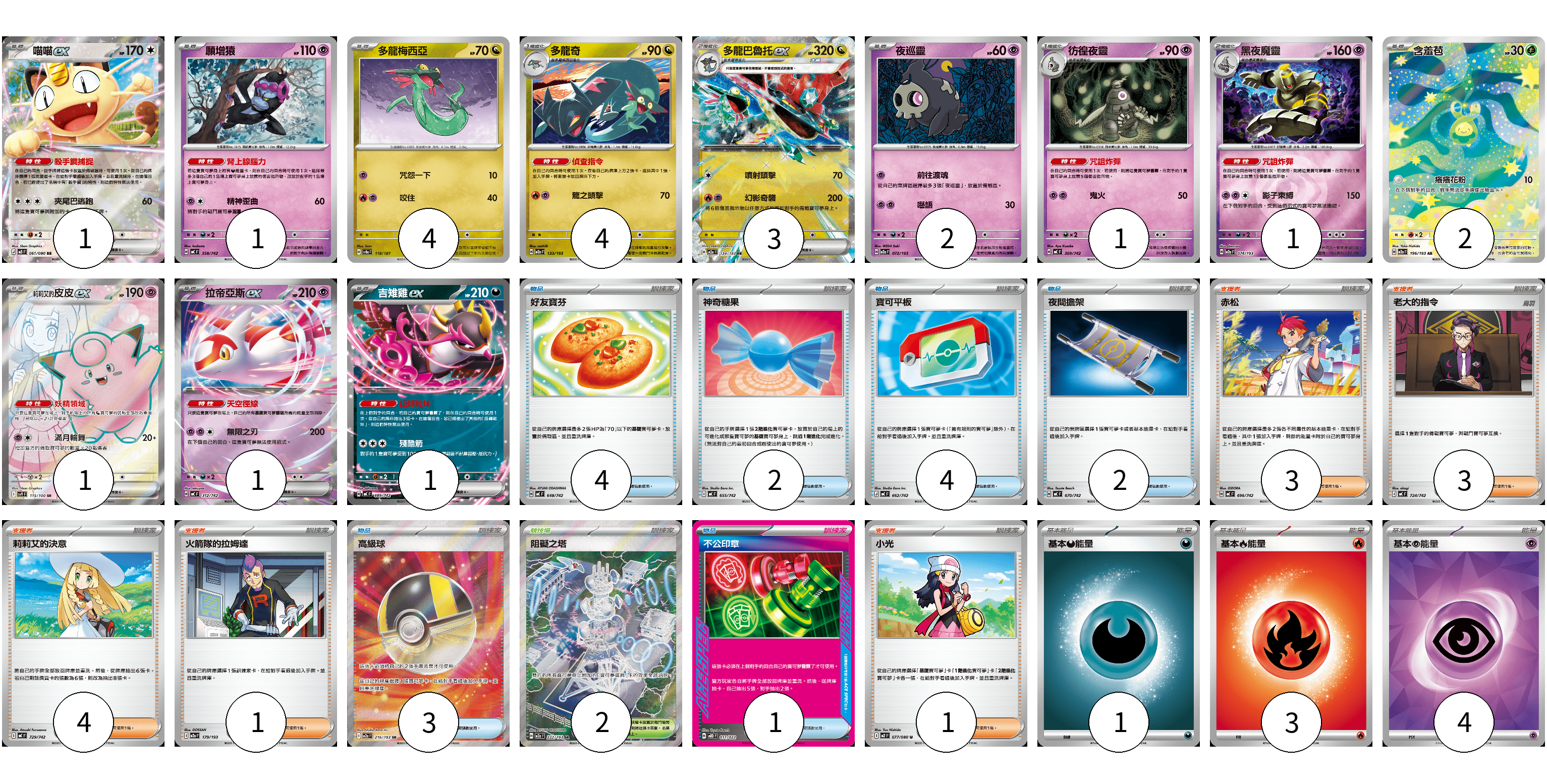 牌組構築方案 以此牌組為基礎新構築牌組 顯示卡面 顯示列表 寶可夢卡(22) 1 1 4 4 3 2 1 1 2 1 1 1 物品卡(16) 4 2 4 2 3 1 支援者卡(12) 3 3 4 1 1 競技場卡(2) 2 能量卡(8) 1 3 4 寶可夢卡(22) 卡牌名稱 張數 卡牌名稱 張數 喵喵ex M3 061/080 01 願增猿 MC 358/742 01 多龍梅西亞 SV8a 118/187 04 多龍奇 M2a 133/193 04 多龍巴魯托ex M2a 134/193 03 夜巡靈 M2a 072/193 02 彷徨夜靈 MC 309/742 01 黑夜魔靈 M2a 074/193 01 含羞苞 M2a 196/193 02 莉莉艾的皮皮ex SV9 115/100 01 拉帝亞斯ex MC 312/742 01 吉雉雞ex MC 489/742 01 物品卡(16) 卡牌名稱 張數 卡牌名稱 張數 好友寶芬 MC 648/742 04 神奇糖果 MC 655/742 02 寶可平板 MC 662/742 04 夜間擔架 MC 670/742 02 高級球 M2a 216/193 03 不公印章 MBD 011/022 01 支援者卡(12) 卡牌名稱 張數 卡牌名稱 張數 赤松 MC 696/742 03 老大的指令 MC 724/742 03 莉莉艾的決意 MC 729/742 04 火箭隊的拉姆達 M2a 179/193 01 小光 M2 077/080 01 競技場卡(2) 卡牌名稱 張數 卡牌名稱 張數 阻礙之塔 M2a 222/193 02 能量卡(8) 卡牌名稱 張數 卡牌名稱 張數 基本【惡】能量 MC DAR 01 基本【火】能量 MC FIR 03 基本【超】能量 SVOD PSY 04 以此牌組為基礎新構築牌組 牌組編碼 IvmmgJ-OTUZji-EeKMiV copy 列印牌組單 牌組編碼已複製 分享至SNS