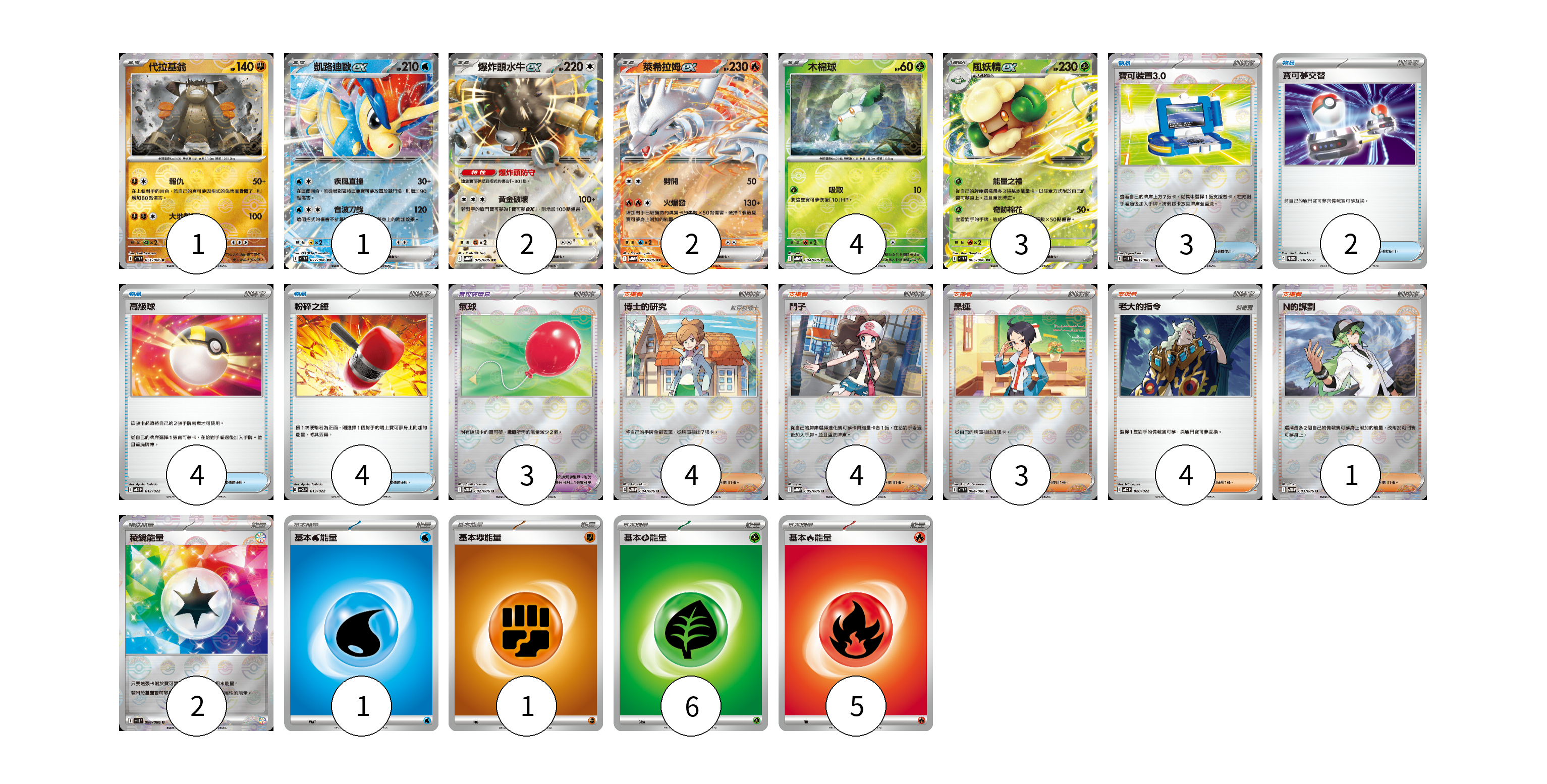 牌組構築方案 以此牌組為基礎新構築牌組 顯示卡面 顯示列表 寶可夢卡(13) 1 1 2 2 4 3 寶可夢道具(3) 3 物品卡(13) 3 2 4 4 支援者卡(16) 4 4 3 4 1 能量卡(15) 2 1 1 6 5 寶可夢卡(13) 卡牌名稱 張數 卡牌名稱 張數 代拉基翁 SV11W 051/086 01 凱路迪歐ex SV11W 027/086 01 爆炸頭水牛ex SV11W 075/086 02 萊希拉姆ex SV11W 017/086 02 木棉球 SV11W 004/086 04 風妖精ex SV11W 005/086 03 寶可夢道具(3) 卡牌名稱 張數 卡牌名稱 張數 氣球 SV11B 082/086 03 物品卡(13) 卡牌名稱 張數 卡牌名稱 張數 寶可裝置3.0 SV11B 081/086 03 寶可夢交替 SV-P 014/SV-P 02 高級球 MBG 012/022 04 粉碎之錘 SVQL 013/022 04 支援者卡(16) 卡牌名稱 張數 卡牌名稱 張數 博士的研究 SV11B 084/086 04 鬥子 SV11W 085/086 04 黑連 SV11W 084/086 03 老大的指令 MBD 020/022 04 N的謀劃 SV11B 083/086 01 能量卡(15) 卡牌名稱 張數 卡牌名稱 張數 稜鏡能量 SV11B 086/086 02 基本水能量 sv-p WAT 01 基本【鬥】能量 SVAM FIG 01 基本草能量 sv-p GRA 06 基本火能量 sv-p FIR 05 以此牌組為基礎新構築牌組 牌組編碼 IxCRFB-medwNz-gFDGYP copy 列印牌組單 牌組編碼已複製 分享至SNS