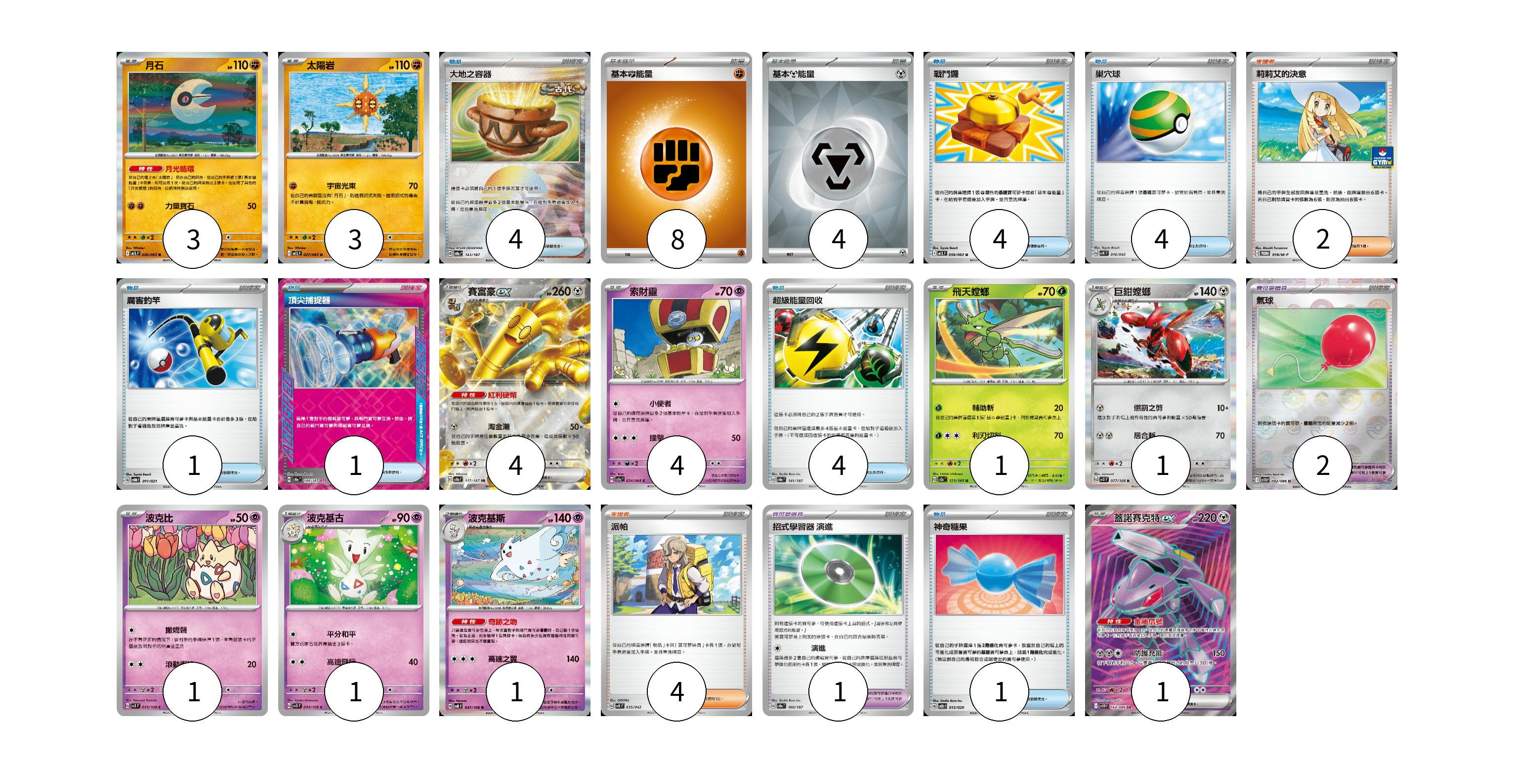 牌組構築方案 以此牌組為基礎新構築牌組 顯示卡面 顯示列表 寶可夢卡(20) 3 3 4 4 1 1 1 1 1 1 寶可夢道具(3) 2 1 物品卡(19) 4 4 4 1 1 4 1 支援者卡(6) 2 4 能量卡(12) 8 4 寶可夢卡(20) 卡牌名稱 張數 卡牌名稱 張數 月石 M1L 026/063 03 太陽岩 M1L 027/063 03 賽富豪ex SV8a 117/187 04 索財靈 SV7a 024/064 04 飛天螳螂 SV2a 123/165 01 巨鉗螳螂 SV3 077/108 01 波克比 SV3 043/108 01 波克基古 SV3 044/108 01 波克基斯 SV8 047/106 01 蓋諾賽克特ex SV11B 164/086 01 寶可夢道具(3) 卡牌名稱 張數 卡牌名稱 張數 氣球 SV11B 082/086 02 招式學習器 演進 SV8a 160/187 01 物品卡(19) 卡牌名稱 張數 卡牌名稱 張數 大地之容器 SV8a 143/187 04 戰鬥鑼 M1L 059/063 04 巢穴球 SVK 016/042 04 厲害釣竿 SVOM 011/021 01 頂尖捕捉器 SV8a 148/187 01 超級能量回收 SV8a 141/187 04 神奇糖果 SVOD 013/020 01 支援者卡(6) 卡牌名稱 張數 卡牌名稱 張數 莉莉艾的決意 M-P 018/M-P 02 派帕 SVK 035/042 04 能量卡(12) 卡牌名稱 張數 卡牌名稱 張數 基本【鬥】能量 M-P FIG 08 基本【鋼】能量 SVOD MET 04 以此牌組為基礎新構築牌組 牌組編碼 IyNhIY-WYfeVy-hAndwb copy 列印牌組單 牌組編碼已複製 分享至SNS