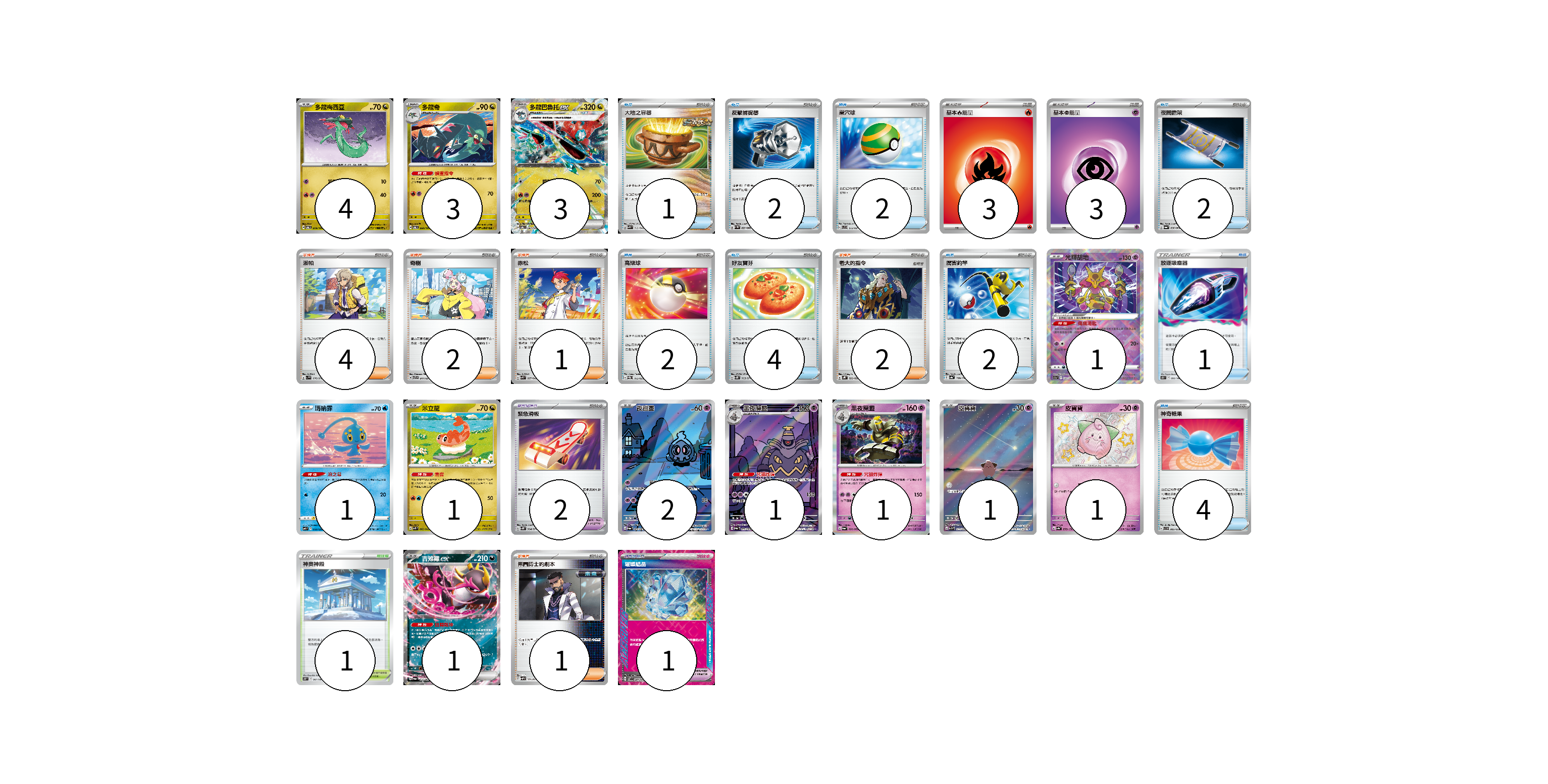牌組構築方案 以此牌組為基礎新構築牌組 顯示卡面 顯示列表 寶可夢卡(20) 4 3 3 1 1 1 2 1 1 1 1 1 寶可夢道具(3) 2 1 物品卡(20) 1 2 2 2 2 4 2 1 4 支援者卡(10) 4 2 1 2 1 競技場卡(1) 1 能量卡(6) 3 3 寶可夢卡(20) 卡牌名稱 張數 卡牌名稱 張數 多龍梅西亞 SV6 079/101 04 多龍奇 SV6 080/101 03 多龍巴魯托ex SV6 081/101 03 光輝胡地 S11a 031/068 01 瑪納霏 SVF 003/038 01 米立龍 SVK 002/042 01 夜巡靈 SV6a 068/064 02 黑夜魔靈 SV6a 070/064 01 黑夜魔靈 SV6a 020/064 01 皮寶寶 SV3 113/108 01 皮寶寶 SV4a 255/190 01 吉雉雞ex SV6a 038/064 01 寶可夢道具(3) 卡牌名稱 張數 卡牌名稱 張數 緊急滑板 SV5K 064/071 02 璀璨結晶 SV7 094/102 01 物品卡(20) 卡牌名稱 張數 卡牌名稱 張數 大地之容器 SVK 012/042 01 反擊捕捉器 SV4M 059/066 02 巢穴球 SVC 013/021 02 夜間擔架 SV6a 056/064 02 高級球 SVEM 013/020 02 好友寶芬 SV5K 063/071 04 厲害釣竿 SV4a 158/190 02 放逐吸塵器 S11 093/100 01 神奇糖果 SVB 003/028 04 支援者卡(10) 卡牌名稱 張數 卡牌名稱 張數 派帕 SV1V 076/078 04 奇樹 SVTR 017/021 02 赤松 SVK 027/042 01 老大的指令 SVHK 022/022 02 弗圖博士的劇本 SVHM 021/022 01 競技場卡(1) 卡牌名稱 張數 卡牌名稱 張數 神奧神殿 S10P 067/067 01 能量卡(6) 卡牌名稱 張數 卡牌名稱 張數 基本火能量 sv-p FIR 03 基本超能量 sv-p PSY 03 以此牌組為基礎新構築牌組 牌組編碼 IyvirN-YBTUVe-vmAfHm copy 列印牌組單 牌組編碼已複製 分享至SNS