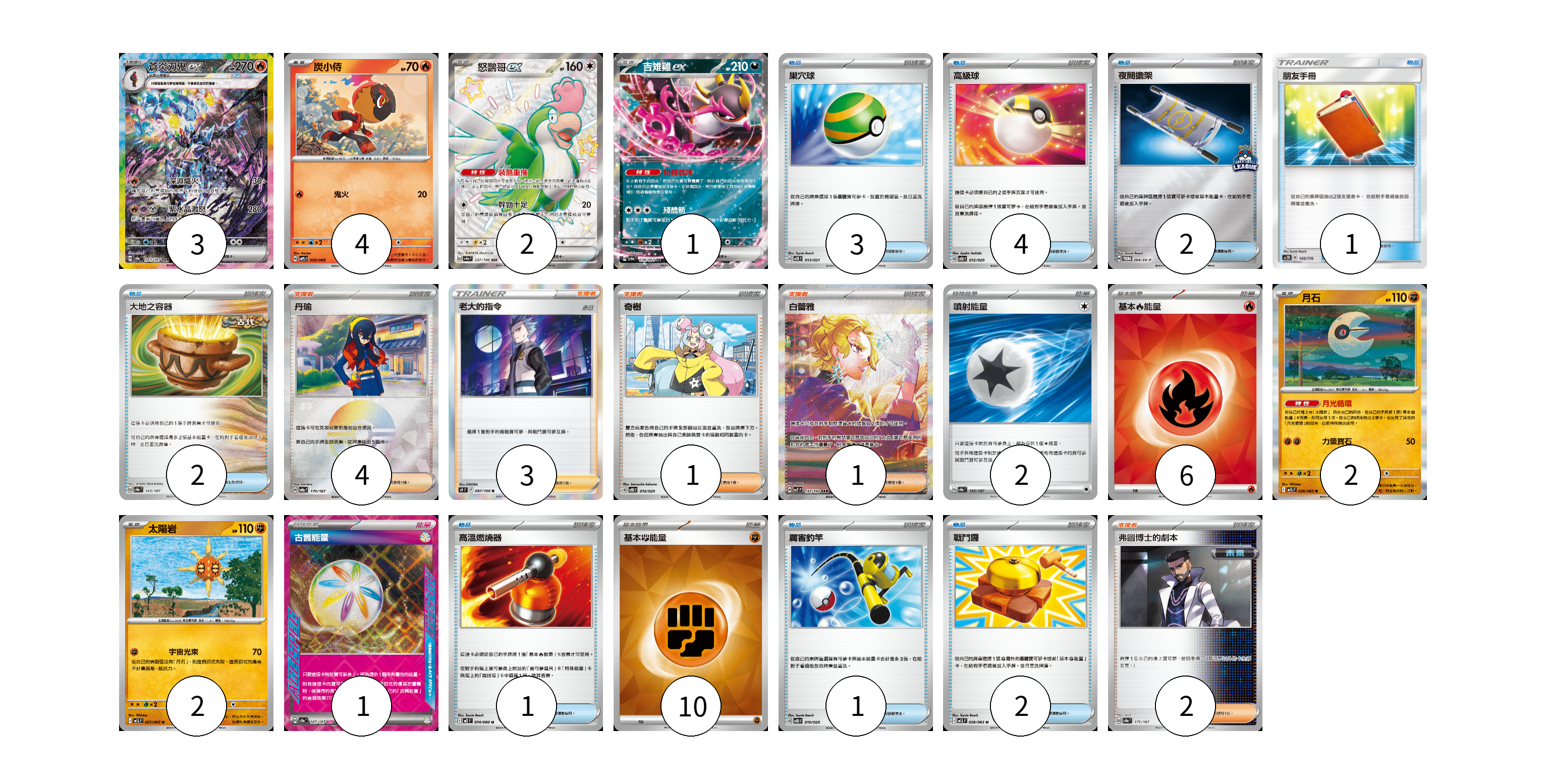 牌組構築方案 以此牌組為基礎新構築牌組 顯示卡面 顯示列表 寶可夢卡(14) 3 4 2 1 2 2 物品卡(16) 3 4 2 1 2 1 1 2 支援者卡(11) 4 3 1 1 2 能量卡(19) 2 6 1 10 寶可夢卡(14) 卡牌名稱 張數 卡牌名稱 張數 蒼炎刃鬼ex SV8a 203/187 03 炭小侍 SVPS 005/008 04 怒鸚哥ex SV4a 337/190 02 吉雉雞ex SV6a 038/064 01 月石 M1L 026/063 02 太陽岩 M1L 027/063 02 物品卡(16) 卡牌名稱 張數 卡牌名稱 張數 巢穴球 SVTR 013/021 03 高級球 SVOD 012/020 04 夜間擔架 SV-P 204/SV-P 02 朋友手冊 AC2D 145/176 01 大地之容器 SV8a 143/187 02 高溫燃燒器 M2 074/080 01 厲害釣竿 SVOD 010/020 01 戰鬥鑼 M1L 059/063 02 支援者卡(11) 卡牌名稱 張數 卡牌名稱 張數 丹瑜 SV8a 170/187 04 老大的指令(赤日) S9 097/100 03 奇樹 SVOD 016/020 01 白蕾雅 SV7 132/102 01 弗圖博士的劇本 SV8a 175/187 02 能量卡(19) 卡牌名稱 張數 卡牌名稱 張數 噴射能量 SV8a 185/187 02 基本【火】能量 SVM FIR 06 古舊能量 SV8a 187/187 01 基本【鬥】能量 SVM FIG 10 以此牌組為基礎新構築牌組 牌組編碼 JCkZtN-owcvtz-dsqJGi copy 列印牌組單 牌組編碼已複製 分享至SNS