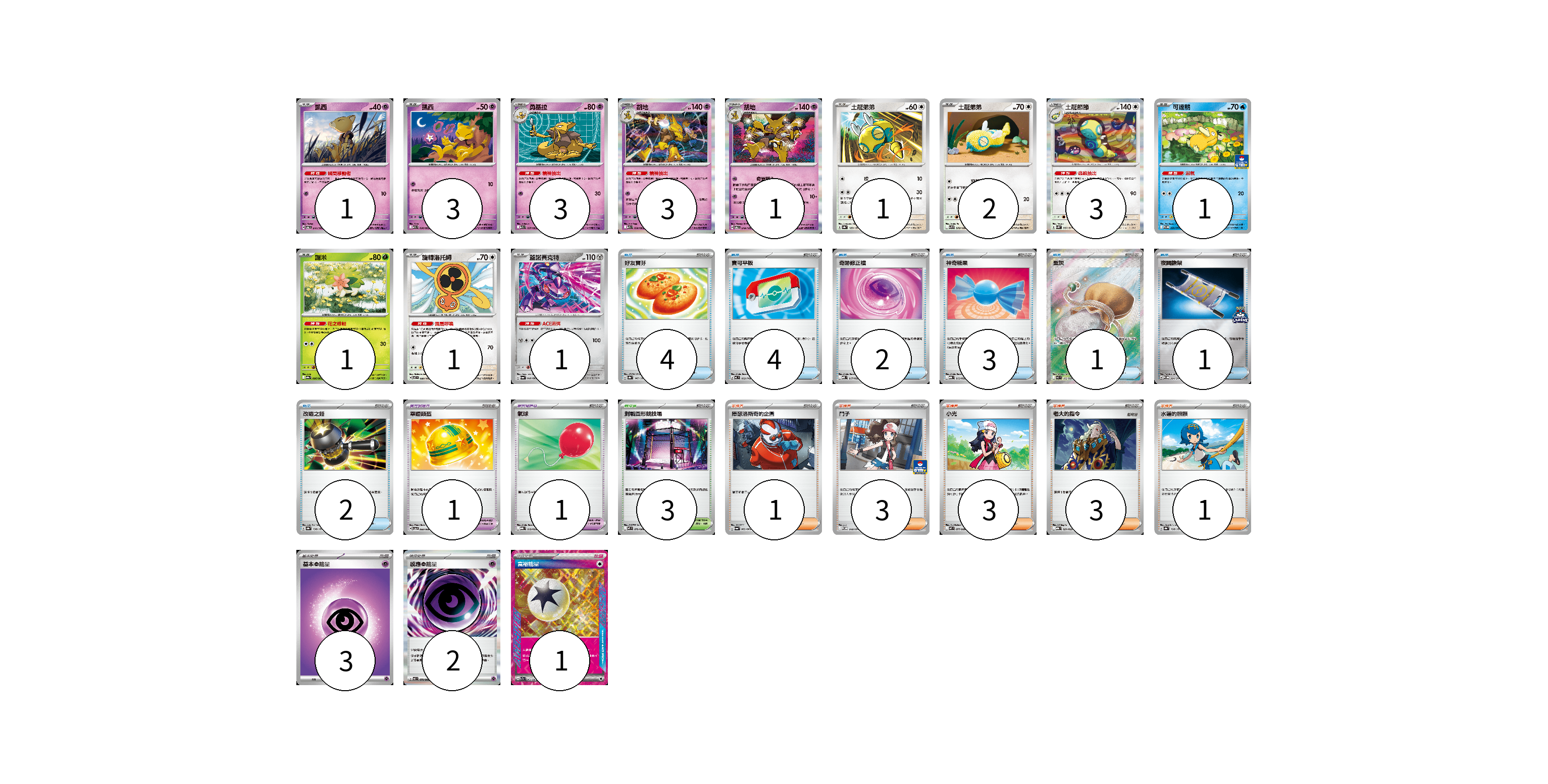牌組構築方案 以此牌組為基礎新構築牌組 顯示卡面 顯示列表 寶可夢卡(21) 1 3 3 3 1 1 2 3 1 1 1 1 寶可夢道具(2) 1 1 物品卡(17) 4 4 2 3 1 1 2 支援者卡(11) 1 3 3 3 1 競技場卡(3) 3 能量卡(6) 3 2 1 寶可夢卡(21) 卡牌名稱 張數 卡牌名稱 張數 凱西 SV6 047/101 01 凱西 M1S 036/063 03 勇基拉 M1S 037/063 03 胡地 M1S 038/063 03 胡地 SV6 049/101 01 土龍弟弟 SV8a 129/187 01 土龍弟弟 SV9 078/100 02 土龍節節 SV5K 057/071 03 可達鴨 SV-P 220/SV-P 01 謝米 SV9a 006/063 01 旋轉洛托姆 SV7 080/102 01 蓋諾賽克特 SV6a 040/064 01 寶可夢道具(2) 卡牌名稱 張數 卡牌名稱 張數 幸運頭盔 SV5a 060/066 01 氣球 MBG 019/022 01 物品卡(17) 卡牌名稱 張數 卡牌名稱 張數 好友寶芬 SV8a 147/187 04 寶可平板 MC 662/742 04 奇跡修正檔 MBD 017/022 02 神奇糖果 MBG 013/022 03 聖灰 M3 102/080 01 夜間擔架 SV-P 204/SV-P 01 改造之錘 SV8a 138/187 02 支援者卡(11) 卡牌名稱 張數 卡牌名稱 張數 庫瑟洛斯奇的企圖 SV6a 062/064 01 鬥子 M-P 048/M-P 03 小光 M2 077/080 03 老大的指令 MBG 021/022 03 水蓮的照顧 SV8a 168/187 01 競技場卡(3) 卡牌名稱 張數 卡牌名稱 張數 對戰圓形競技場 M2 079/080 03 能量卡(6) 卡牌名稱 張數 卡牌名稱 張數 基本【超】能量 MC PSY 03 感應【超】能量 M3 079/080 02 富裕能量 SV7a 064/064 01 以此牌組為基礎新構築牌組 牌組編碼 JCrUtq-EDQgHI-RFeVrk copy 列印牌組單 牌組編碼已複製 分享至SNS