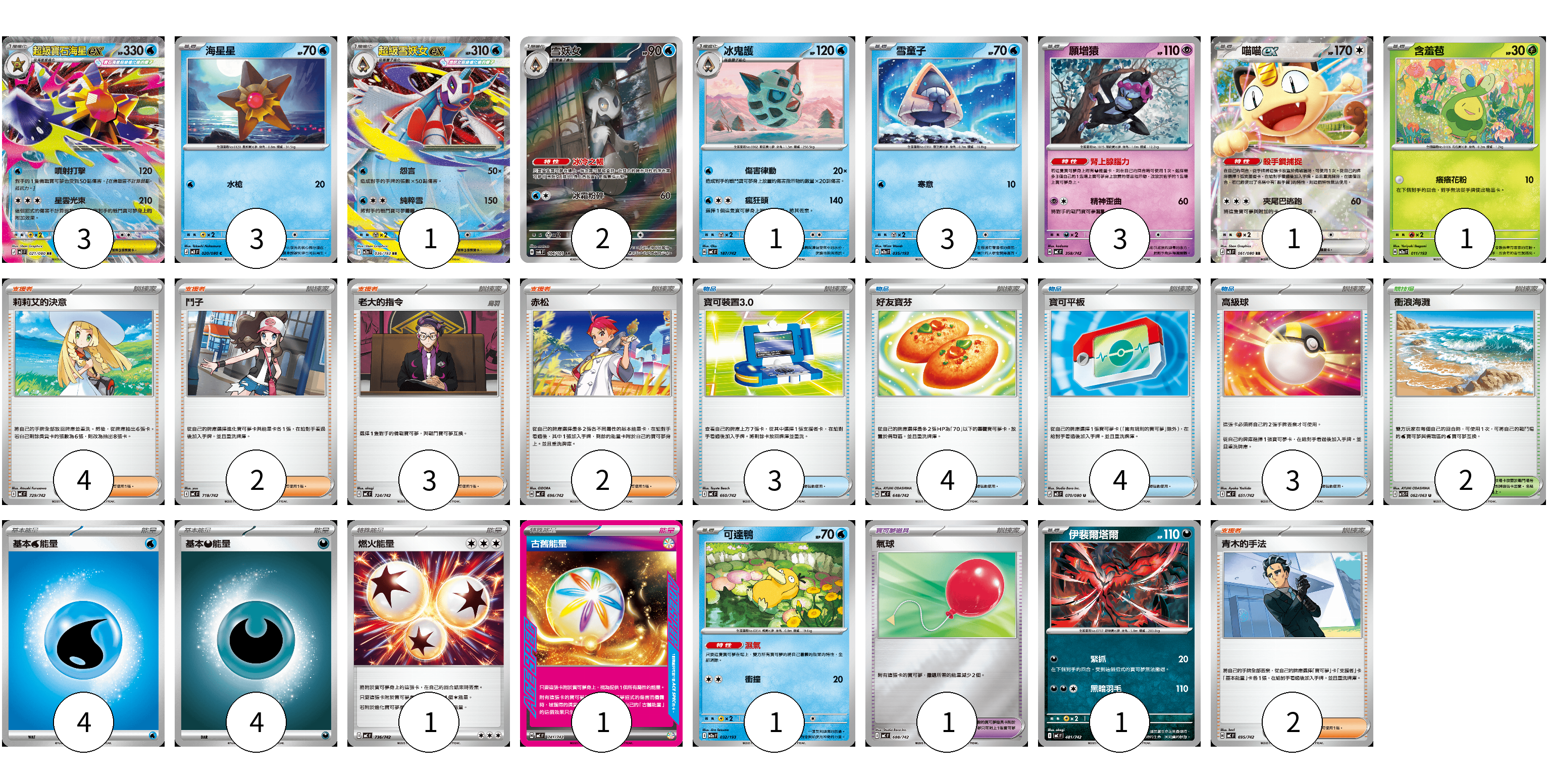 牌組構築方案 以此牌組為基礎新構築牌組 顯示卡面 顯示列表 寶可夢卡(20) 3 3 1 2 1 3 3 1 1 1 1 寶可夢道具(1) 1 物品卡(14) 3 4 4 3 支援者卡(13) 4 2 3 2 2 競技場卡(2) 2 能量卡(10) 4 4 1 1 寶可夢卡(20) 卡牌名稱 張數 卡牌名稱 張數 超級寶石海星ex M3 021/080 03 海星星 M3 020/080 03 超級雪妖女ex M2a 036/193 01 雪妖女 SV6 104/101 02 冰鬼護 MC 187/742 01 雪童子 M2a 035/193 03 願增猿 MC 358/742 03 喵喵ex M3 061/080 01 含羞苞 M2a 011/193 01 可達鴨 M2a 032/193 01 伊裴爾塔爾 MC 481/742 01 寶可夢道具(1) 卡牌名稱 張數 卡牌名稱 張數 氣球 MC 688/742 01 物品卡(14) 卡牌名稱 張數 卡牌名稱 張數 寶可裝置3.0 MC 660/742 03 好友寶芬 MC 648/742 04 寶可平板 M3 070/080 04 高級球 MC 651/742 03 支援者卡(13) 卡牌名稱 張數 卡牌名稱 張數 莉莉艾的決意 MC 729/742 04 鬥子 MC 718/742 02 老大的指令 MC 724/742 03 赤松 MC 696/742 02 青木的手法 MC 695/742 02 競技場卡(2) 卡牌名稱 張數 卡牌名稱 張數 衝浪海灘 M1S 062/063 02 能量卡(10) 卡牌名稱 張數 卡牌名稱 張數 基本【水】能量 MC WAT 04 基本【惡】能量 MC DAR 04 燃火能量 MC 736/742 01 古舊能量 MC 741/742 01 以此牌組為基礎新構築牌組 牌組編碼 JDIxgD-uVkUrw-XCxMTi copy 列印牌組單 牌組編碼已複製 分享至SNS