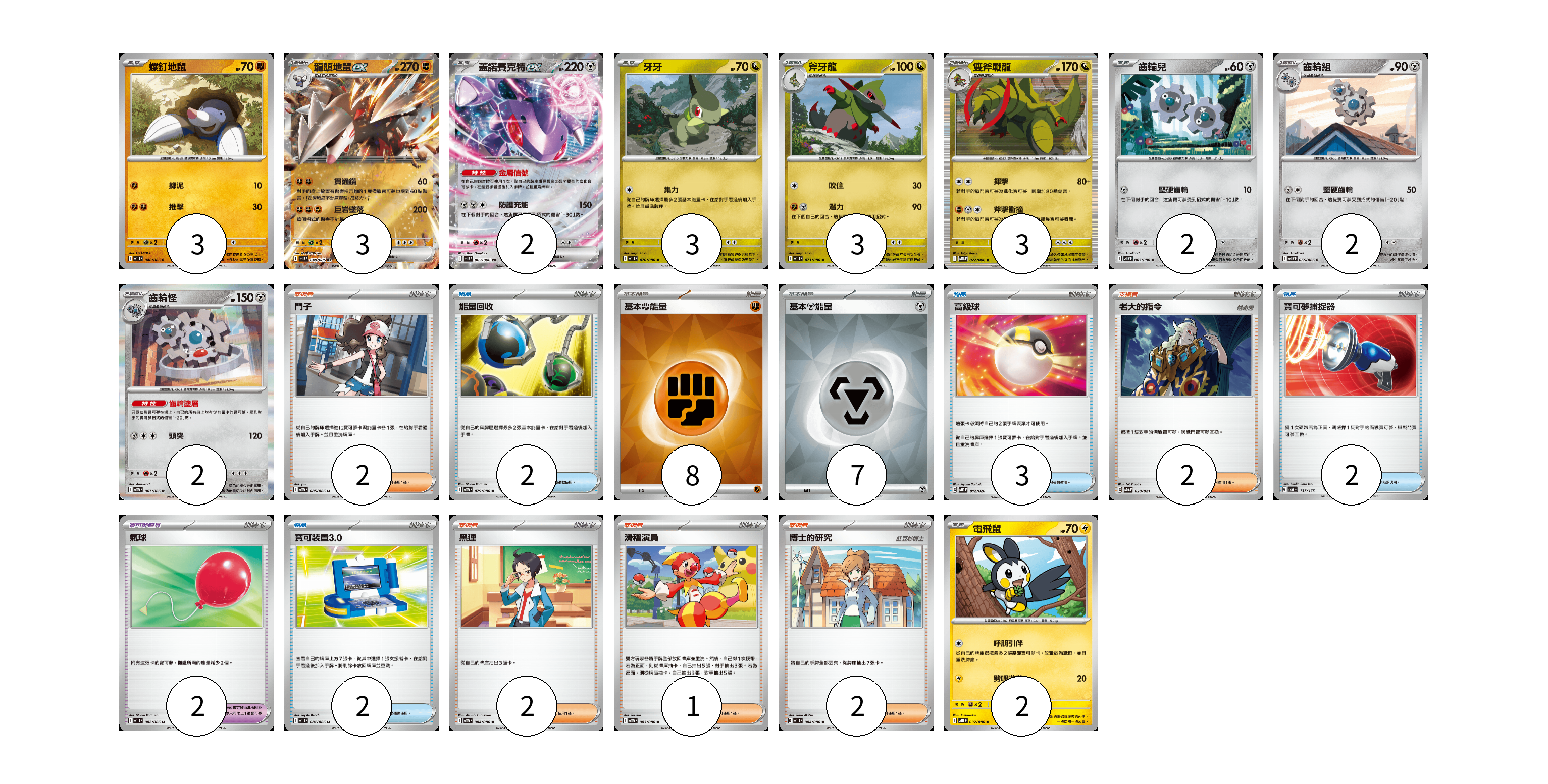 牌組構築方案 以此牌組為基礎新構築牌組 顯示卡面 顯示列表 寶可夢卡(25) 3 3 2 3 3 3 2 2 2 2 寶可夢道具(2) 2 物品卡(9) 2 3 2 2 支援者卡(9) 2 2 2 1 2 能量卡(15) 8 7 寶可夢卡(25) 卡牌名稱 張數 卡牌名稱 張數 螺釘地鼠 SV11B 048/086 03 龍頭地鼠ex SV11B 049/086 03 蓋諾賽克特ex SV11B 069/086 02 牙牙 SV11B 070/086 03 斧牙龍 SV11B 071/086 03 雙斧戰龍 SV11B 072/086 03 齒輪兒 SV11W 065/086 02 齒輪組 SV11W 066/086 02 齒輪怪 SV11W 067/086 02 電飛鼠 SV11B 032/086 02 寶可夢道具(2) 卡牌名稱 張數 卡牌名稱 張數 氣球 SV11B 082/086 02 物品卡(9) 卡牌名稱 張數 卡牌名稱 張數 能量回收 SV11W 079/086 02 高級球 SVOD 012/020 03 寶可夢捕捉器 SVM 137/175 02 寶可裝置3.0 SV11B 081/086 02 支援者卡(9) 卡牌名稱 張數 卡牌名稱 張數 鬥子 SV11W 085/086 02 老大的指令 SVOM 020/021 02 黑連 SV11W 084/086 02 滑稽演員 SV11W 083/086 01 博士的研究 SV11B 084/086 02 能量卡(15) 卡牌名稱 張數 卡牌名稱 張數 基本【鬥】能量 SVM FIG 08 基本【鋼】能量 SVM MET 07 以此牌組為基礎新構築牌組 牌組編碼 JDOBkQ-XUFyjH-dKwwwM copy 列印牌組單 牌組編碼已複製 分享至SNS