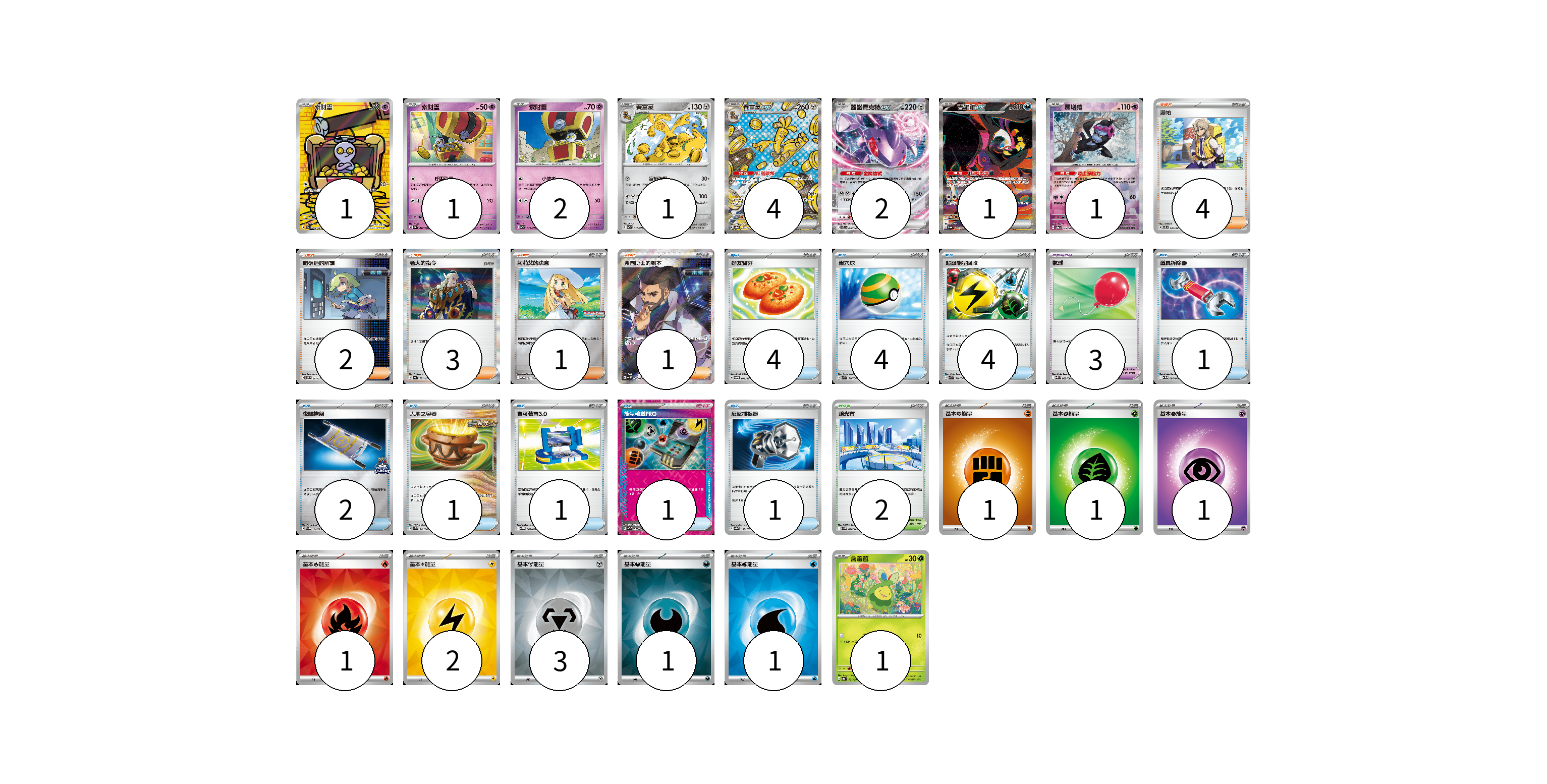 牌組構築方案 以此牌組為基礎新構築牌組 顯示卡面 顯示列表 寶可夢卡(14) 1 1 2 1 4 2 1 1 1 寶可夢道具(3) 3 物品卡(19) 4 4 4 1 2 1 1 1 1 支援者卡(11) 4 2 3 1 1 競技場卡(2) 2 能量卡(11) 1 1 1 1 2 3 1 1 寶可夢卡(14) 卡牌名稱 張數 卡牌名稱 張數 索財靈 SV3a 068/062 01 索財靈 SV3a 020/062 01 索財靈 SV7a 024/064 02 賽富豪 SV7a 038/064 01 賽富豪ex SV8a 220/187 04 蓋諾賽克特ex SV11B 069/086 02 吉雉雞ex SV6a 089/064 01 願增猿 SV8a 075/187 01 含羞苞 SV8a 001/187 01 寶可夢道具(3) 卡牌名稱 張數 卡牌名稱 張數 氣球 SV11B 082/086 03 物品卡(19) 卡牌名稱 張數 卡牌名稱 張數 好友寶芬 SVOM 012/021 04 巢穴球 SVK 016/042 04 超級能量回收 SVK 010/042 04 道具拆除器 SV11W 080/086 01 夜間擔架 SV-P 204/SV-P 02 大地之容器 SVK 012/042 01 寶可裝置3.0 SV11B 081/086 01 能量輸送PRO SV7a 052/064 01 反擊捕捉器 SV8a 139/187 01 支援者卡(11) 卡牌名稱 張數 卡牌名稱 張數 派帕 SVTL 020/021 04 暗碼迷的解讀 SV5M 067/071 02 老大的指令 SV4a 181/190 03 莉莉艾的決意 M-P 011/M-P 01 弗圖博士的劇本 SV4M 086/066 01 競技場卡(2) 卡牌名稱 張數 卡牌名稱 張數 釀光市 SV9 098/100 02 能量卡(11) 卡牌名稱 張數 卡牌名稱 張數 基本【鬥】能量 M-P FIG 01 基本【草】能量 M-P GRA 01 基本【超】能量 M-P PSY 01 基本【火】能量 SVQL FIR 01 基本【雷】能量 SVQP LIG 02 基本【鋼】能量 SVOD MET 03 基本【惡】能量 SVOM DAR 01 基本【水】能量 SVM WAT 01 以此牌組為基礎新構築牌組 牌組編碼 JDoevs-dxxcOJ-nOnuvd copy 列印牌組單 牌組編碼已複製 分享至SNS