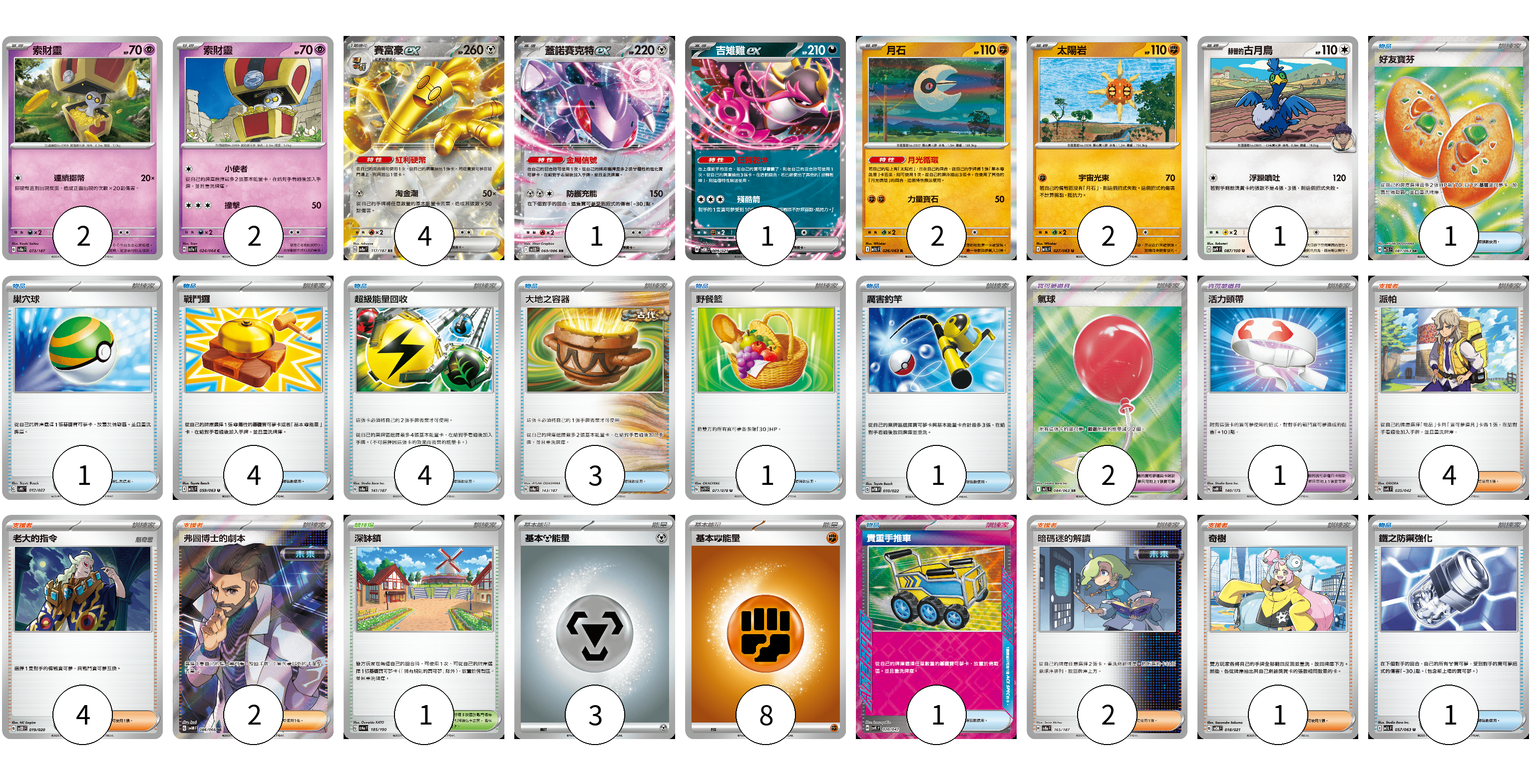 牌組構築方案 以此牌組為基礎新構築牌組 顯示卡面 顯示列表 寶可夢卡(15) 2 2 4 1 1 2 2 1 寶可夢道具(3) 2 1 物品卡(17) 1 1 4 4 3 1 1 1 1 支援者卡(13) 4 4 2 2 1 競技場卡(1) 1 能量卡(11) 3 8 寶可夢卡(15) 卡牌名稱 張數 卡牌名稱 張數 索財靈 SV8a 073/187 02 索財靈 SV7a 024/064 02 賽富豪ex SV8a 117/187 04 蓋諾賽克特ex SV11B 069/086 01 吉雉雞ex SVOM 009/021 01 月石 M1L 026/063 02 太陽岩 M1L 027/063 02 赫普的古月鳥 SV9 087/100 01 寶可夢道具(3) 卡牌名稱 張數 卡牌名稱 張數 氣球 M1L 084/063 02 活力頭帶 SVM 140/175 01 物品卡(17) 卡牌名稱 張數 卡牌名稱 張數 好友寶芬 M1S 081/063 01 巢穴球 SVHK 012/022 01 戰鬥鑼 M1L 059/063 04 超級能量回收 SV8a 141/187 04 大地之容器 SV8a 143/187 03 野餐籃 SV1V 071/078 01 厲害釣竿 SVTM 010/022 01 貴重手推車 SVK 020/042 01 鐵之防禦強化 M1L 057/063 01 支援者卡(13) 卡牌名稱 張數 卡牌名稱 張數 派帕 SVK 035/042 04 老大的指令 SVOD 019/020 04 弗圖博士的劇本 SV4M 086/066 02 暗碼迷的解讀 SV8a 165/187 02 奇樹 SVOM 018/021 01 競技場卡(1) 卡牌名稱 張數 卡牌名稱 張數 深缽鎮 SV4a 185/190 01 能量卡(11) 卡牌名稱 張數 卡牌名稱 張數 基本【鋼】能量 M-P MET 03 基本【鬥】能量 M-P FIG 08 以此牌組為基礎新構築牌組 牌組編碼 JEEbha-KIFMaD-ffGVRa copy 列印牌組單 牌組編碼已複製 分享至SNS