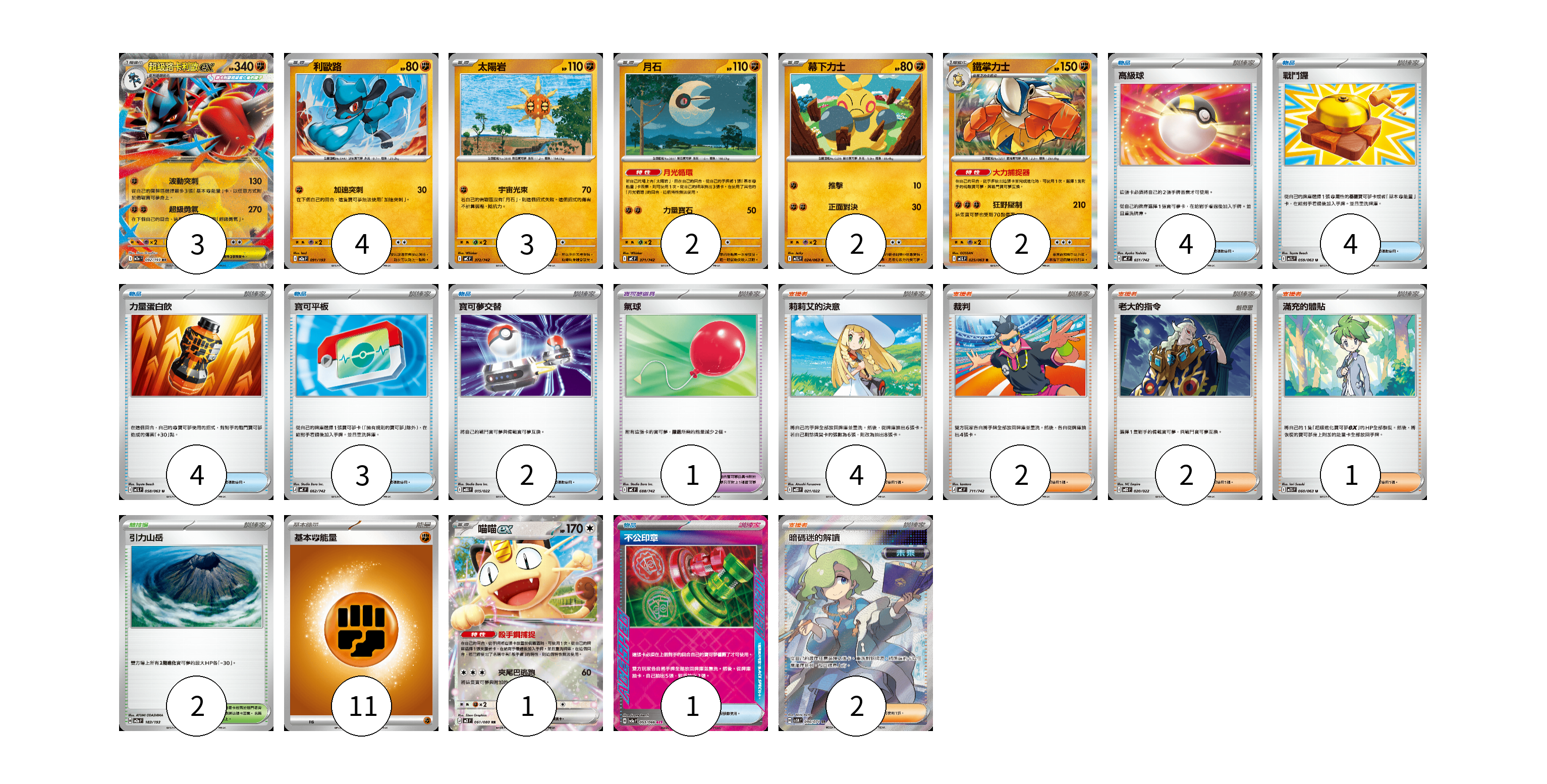 牌組構築方案 以此牌組為基礎新構築牌組 顯示卡面 顯示列表 寶可夢卡(17) 3 4 3 2 2 2 1 寶可夢道具(1) 1 物品卡(18) 4 4 4 3 2 1 支援者卡(11) 4 2 2 1 2 競技場卡(2) 2 能量卡(11) 11 寶可夢卡(17) 卡牌名稱 張數 卡牌名稱 張數 超級路卡利歐ex M2a 092/193 03 利歐路 M2a 091/193 04 太陽岩 MC 372/742 03 月石 MC 371/742 02 幕下力士 M1L 024/063 02 鐵掌力士 M1L 025/063 02 喵喵ex M3 061/080 01 寶可夢道具(1) 卡牌名稱 張數 卡牌名稱 張數 氣球 MC 688/742 01 物品卡(18) 卡牌名稱 張數 卡牌名稱 張數 高級球 MC 651/742 04 戰鬥鑼 M1L 059/063 04 力量蛋白飲 M1L 058/063 04 寶可平板 MC 662/742 03 寶可夢交替 MBG 015/022 02 不公印章 SV5a 053/066 01 支援者卡(11) 卡牌名稱 張數 卡牌名稱 張數 莉莉艾的決意 MBD 021/022 04 裁判 MC 711/742 02 老大的指令 MBD 020/022 02 滿充的體貼 M1S 060/063 01 暗碼迷的解讀 SV5M 090/071 02 競技場卡(2) 卡牌名稱 張數 卡牌名稱 張數 引力山岳 M2a 183/193 02 能量卡(11) 卡牌名稱 張數 卡牌名稱 張數 基本【鬥】能量 MC FIG 11 以此牌組為基礎新構築牌組 牌組編碼 JEbrrE-BjgdKk-CsPxHO copy 列印牌組單 牌組編碼已複製 分享至SNS