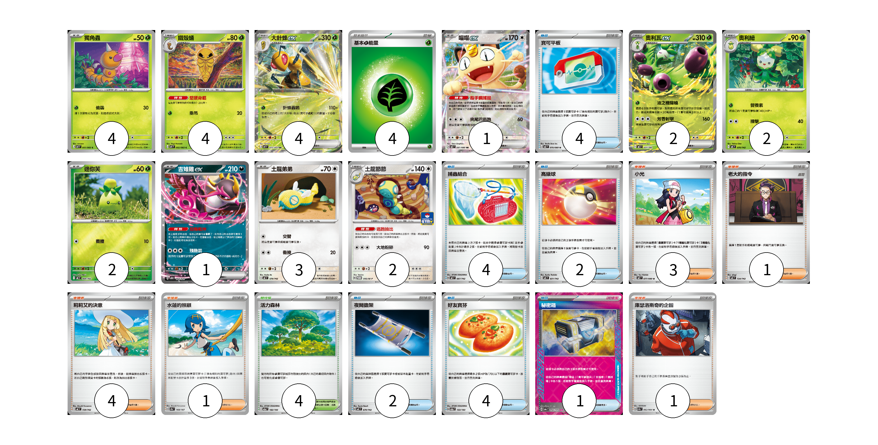 牌組構築方案 以此牌組為基礎新構築牌組 顯示卡面 顯示列表 寶可夢卡(25) 4 4 4 1 2 2 2 1 3 2 物品卡(17) 4 4 2 2 4 1 支援者卡(10) 3 1 4 1 1 競技場卡(4) 4 能量卡(4) 4 寶可夢卡(25) 卡牌名稱 張數 卡牌名稱 張數 獨角蟲 M4 001/083 04 鐵殼蛹 M4 002/083 04 大針蜂ex M4 003/083 04 喵喵ex M3 061/080 01 奧利瓦ex MC 071/742 02 奧利紐 MC 070/742 02 迷你芙 MC 069/742 02 吉雉雞ex SVOD 004/020 01 土龍弟弟 MC 574/742 03 土龍節節 M-P 045/M-P 02 物品卡(17) 卡牌名稱 張數 卡牌名稱 張數 寶可平板 M3 070/080 04 捕蟲組合 MC 667/742 04 高級球 MC 651/742 02 夜間擔架 MC 670/742 02 好友寶芬 M2a 153/193 04 秘密箱 SV6 092/101 01 支援者卡(10) 卡牌名稱 張數 卡牌名稱 張數 小光 M2 077/080 03 老大的指令 MC 724/742 01 莉莉艾的決意 MC 729/742 04 水蓮的照顧 SV8a 168/187 01 庫瑟洛斯奇的企圖 SV6a 062/064 01 競技場卡(4) 卡牌名稱 張數 卡牌名稱 張數 活力森林 M2a 182/193 04 能量卡(4) 卡牌名稱 張數 卡牌名稱 張數 基本【草】能量 MJ GRA 04 以此牌組為基礎新構築牌組 牌組編碼 JFriyB-cBBPXn-YtgjqA copy 列印牌組單 牌組編碼已複製 分享至SNS