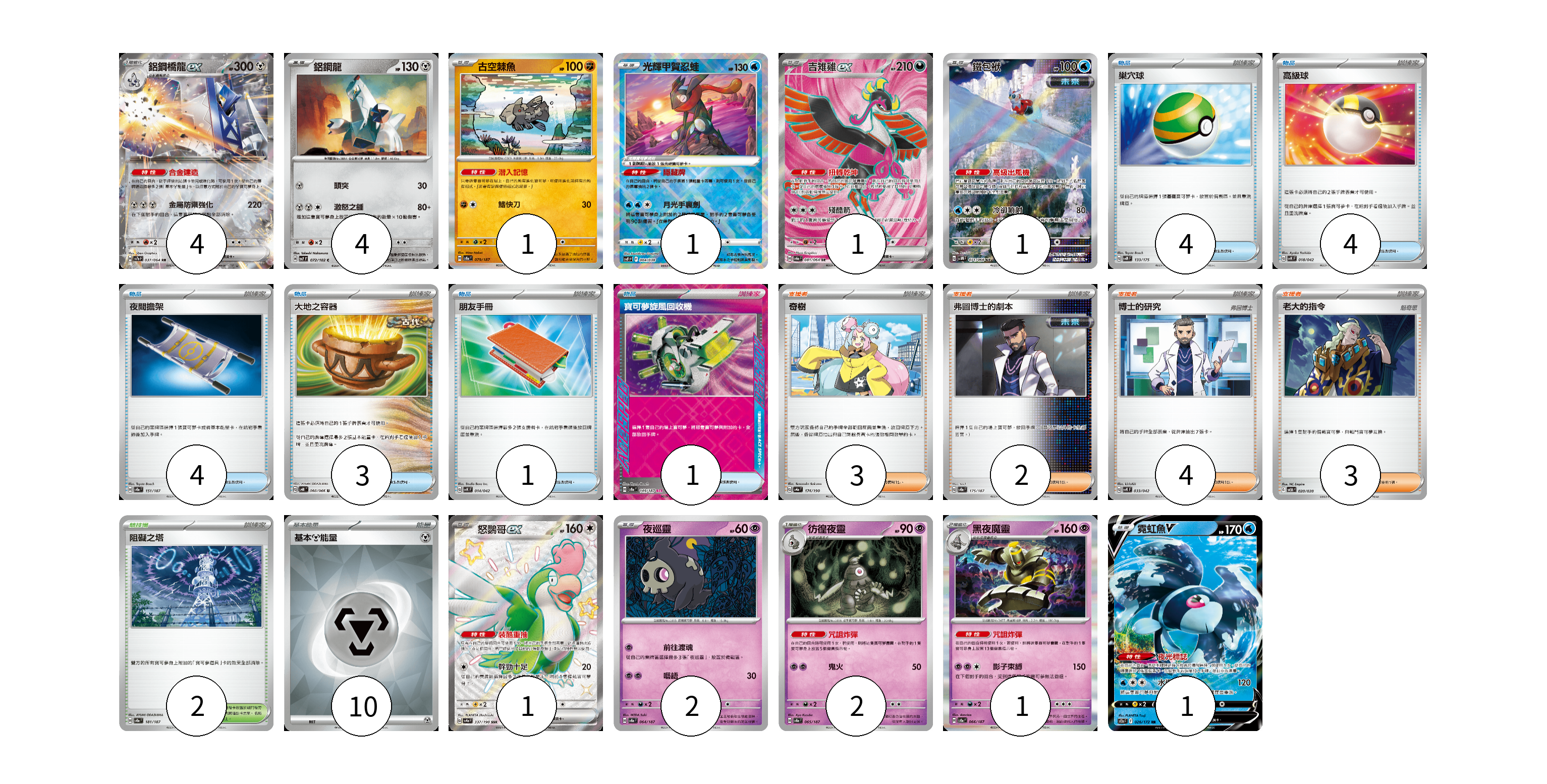 牌組構築方案 以此牌組為基礎新構築牌組 顯示卡面 顯示列表 寶可夢卡(19) 4 4 1 1 1 1 1 2 2 1 1 物品卡(17) 4 4 4 3 1 1 支援者卡(12) 3 2 4 3 競技場卡(2) 2 能量卡(10) 10 寶可夢卡(19) 卡牌名稱 張數 卡牌名稱 張數 鋁鋼橋龍ex SV7a 037/064 04 鋁鋼龍 SV7 072/102 04 古空棘魚 SV8a 079/187 01 光輝甲賀忍蛙 SVF 004/038 01 吉雉雞ex SV6a 081/064 01 鐵包袱 SV4M 071/066 01 怒鸚哥ex SV4a 337/190 01 夜巡靈 SV8a 064/187 02 彷徨夜靈 SV8a 065/187 02 黑夜魔靈 SV8a 066/187 01 霓虹魚V S12a 026/172 01 物品卡(17) 卡牌名稱 張數 卡牌名稱 張數 巢穴球 SVM 133/175 04 高級球 SVK 018/042 04 夜間擔架 SV8a 151/187 04 大地之容器 SV4K 060/066 03 朋友手冊 SVK 014/042 01 寶可夢旋風回收機 SV8a 149/187 01 支援者卡(12) 卡牌名稱 張數 卡牌名稱 張數 奇樹 SV4a 174/190 03 弗圖博士的劇本 SV8a 175/187 02 博士的研究 SVK 033/042 04 老大的指令 SVEM 020/020 03 競技場卡(2) 卡牌名稱 張數 卡牌名稱 張數 阻礙之塔 SV8a 181/187 02 能量卡(10) 卡牌名稱 張數 卡牌名稱 張數 基本【鋼】能量 SVK MET 10 以此牌組為基礎新構築牌組 牌組編碼 JGjJJz-Teujlo-PXBUJI copy 列印牌組單 牌組編碼已複製 分享至SNS