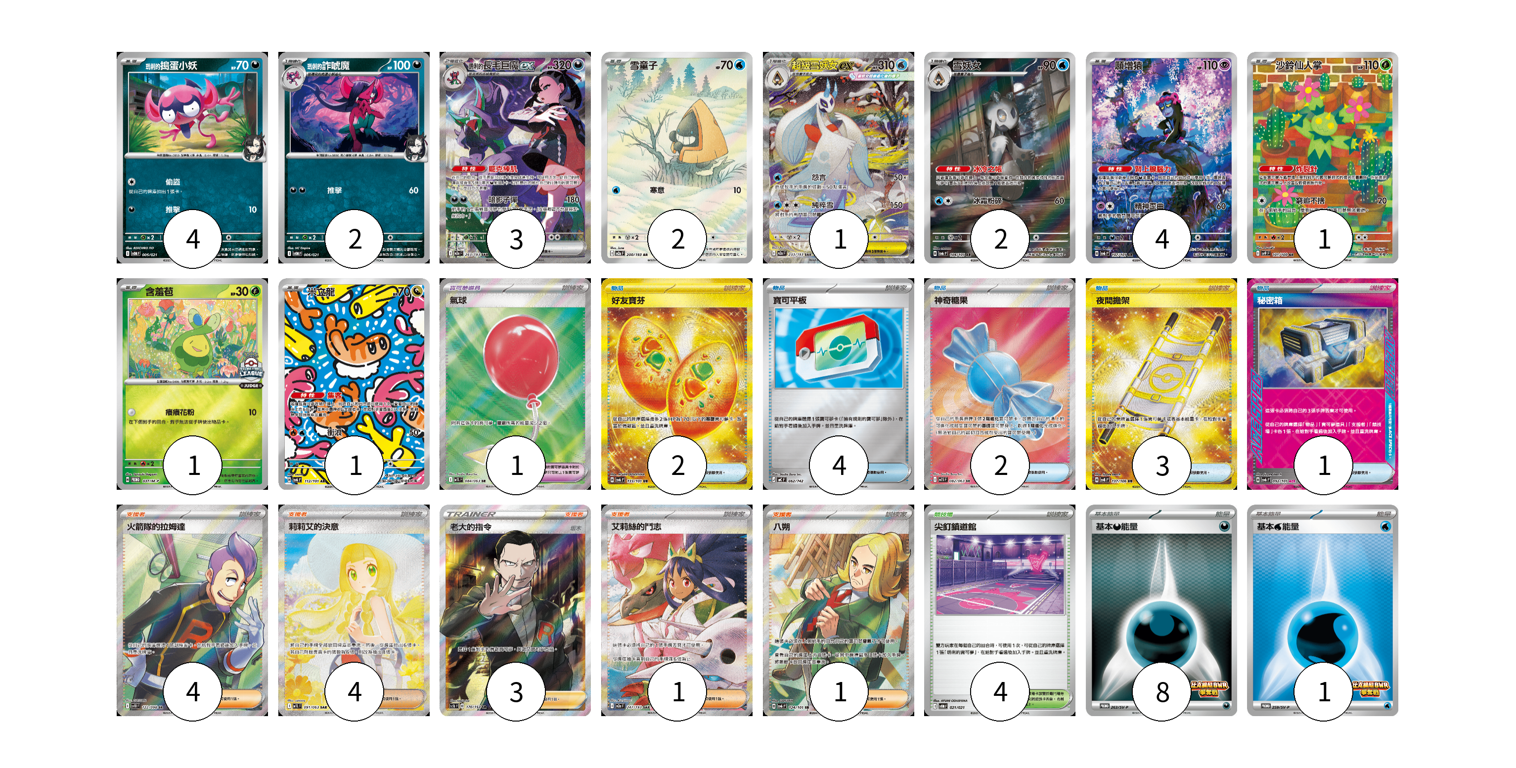 牌組構築方案 以此牌組為基礎新構築牌組 顯示卡面 顯示列表 寶可夢卡(21) 4 2 3 2 1 2 4 1 1 1 寶可夢道具(1) 1 物品卡(12) 2 4 2 3 1 支援者卡(13) 4 4 3 1 1 競技場卡(4) 4 能量卡(9) 8 1 寶可夢卡(21) 卡牌名稱 張數 卡牌名稱 張數 <瑪俐的>搗蛋小妖 SVOM 005/021 04 <瑪俐的>詐唬魔 SVOM 006/021 02 <瑪俐的>長毛巨魔ex M2a 243/193 03 雪童子 M2a 200/193 02 超級雪妖女ex M2a 233/193 01 雪妖女 SV6 104/101 02 願增猿 SV6 107/101 04 沙鈴仙人掌 SV9 101/100 01 含羞苞 M-P 037/M-P 01 米立龍 SV6 112/101 01 寶可夢道具(1) 卡牌名稱 張數 卡牌名稱 張數 氣球 M1L 084/063 01 物品卡(12) 卡牌名稱 張數 卡牌名稱 張數 好友寶芬 SV6 133/101 02 寶可平板 MC 662/742 04 神奇糖果 M1S 082/063 02 夜間擔架 SV8 137/106 03 秘密箱 SV6 092/101 01 支援者卡(13) 卡牌名稱 張數 卡牌名稱 張數 火箭隊的拉姆達 SV10 122/098 04 莉莉艾的決意 M1L 091/063 04 老大的指令(坂木) SC1b 170/153 03 艾莉絲的鬥志 M2a 247/193 01 八朔 SV6 124/101 01 競技場卡(4) 卡牌名稱 張數 卡牌名稱 張數 尖釘鎮道館 SVOM 021/021 04 能量卡(9) 卡牌名稱 張數 卡牌名稱 張數 基本【惡】能量 SV-P 263/SV-P 08 基本【水】能量 SV-P 259/SV-P 01 以此牌組為基礎新構築牌組 牌組編碼 JMiuib-OkYIGA-IhoQbh copy 列印牌組單 牌組編碼已複製 分享至SNS