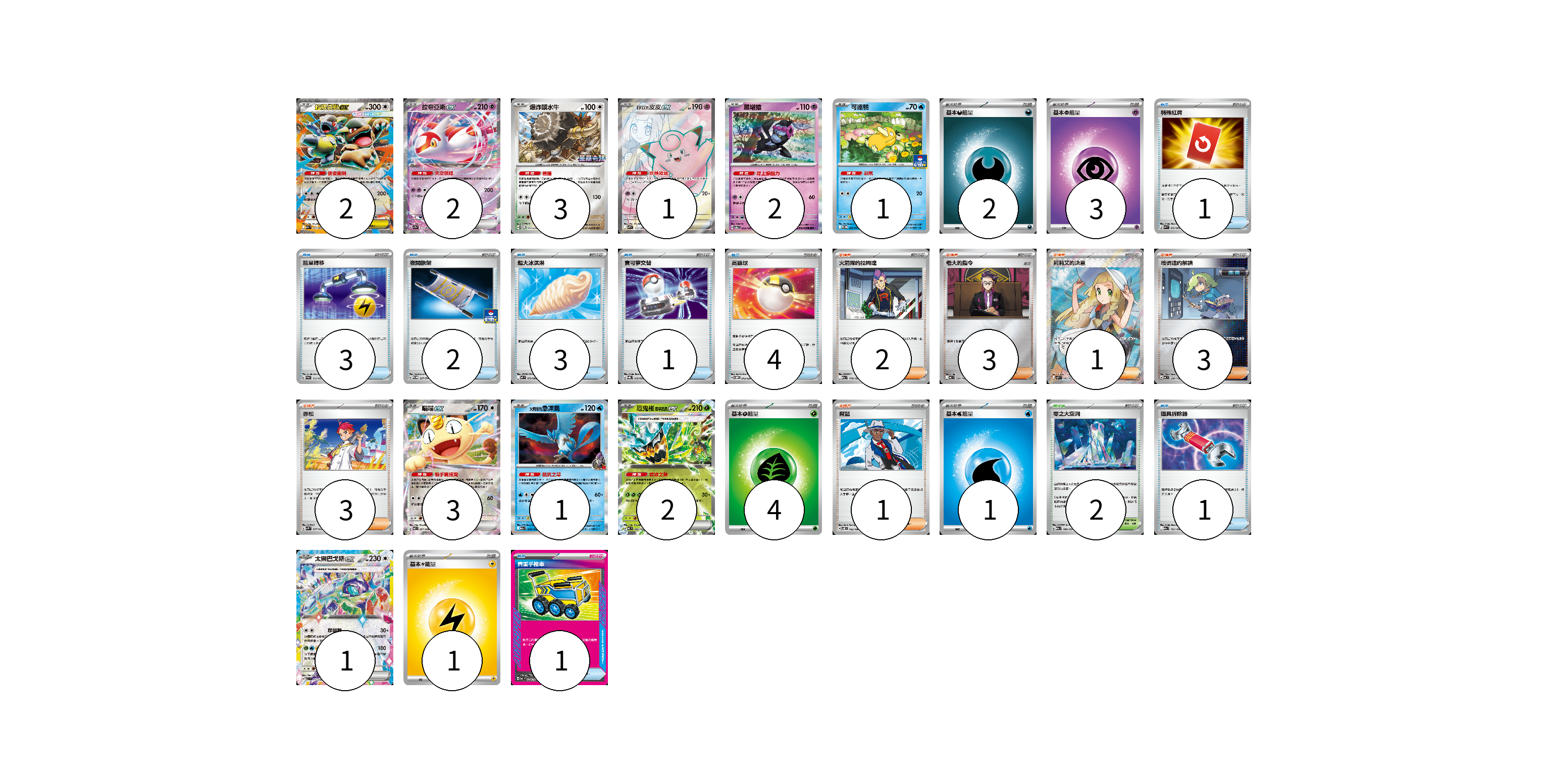 牌組構築方案 以此牌組為基礎新構築牌組 顯示卡面 顯示列表 寶可夢卡(18) 2 2 3 1 2 1 3 1 2 1 物品卡(16) 1 3 2 3 1 4 1 1 支援者卡(13) 2 3 1 3 3 1 競技場卡(2) 2 能量卡(11) 2 3 4 1 1 寶可夢卡(18) 卡牌名稱 張數 卡牌名稱 張數 超級袋獸ex M1S 051/063 02 拉帝亞斯ex SV7a 019/064 02 爆炸頭水牛 SV-P 147/SV-P 03 莉莉艾的皮皮ex SV9 115/100 01 願增猿 SV6 055/101 02 可達鴨 SV-P 220/SV-P 01 喵喵ex M3 061/080 03 <火箭隊的>急凍鳥 M2a 034/193 01 厄鬼椪 碧草面具ex MC 082/742 02 太樂巴戈斯ex M2a 145/193 01 物品卡(16) 卡牌名稱 張數 卡牌名稱 張數 特殊紅牌 M4 072/083 01 能量轉移 SVAM 012/023 03 夜間擔架 SV-P 227/SV-P 02 超大冰淇淋 M2 073/080 03 寶可夢交替 SVQL 016/022 01 高級球 SVOM 013/021 04 道具拆除器 M2a 151/193 01 貴重手推車 MC 658/742 01 支援者卡(13) 卡牌名稱 張數 卡牌名稱 張數 火箭隊的拉姆達 M2a 179/193 02 老大的指令 MC 724/742 03 莉莉艾的決意 M1L 086/063 01 暗碼迷的解讀 MC 698/742 03 赤松 SVK 027/042 03 席藍 SV8 102/106 01 競技場卡(2) 卡牌名稱 張數 卡牌名稱 張數 零之大空洞 M2a 184/193 02 能量卡(11) 卡牌名稱 張數 卡牌名稱 張數 基本【惡】能量 MC DAR 02 基本【超】能量 MBD PSY 03 基本【草】能量 MJ GRA 04 基本【水】能量 MC WAT 01 基本【雷】能量 MJ LIG 01 以此牌組為基礎新構築牌組 牌組編碼 JQQuer-fCUVun-zQEiwL copy 列印牌組單 牌組編碼已複製 分享至SNS