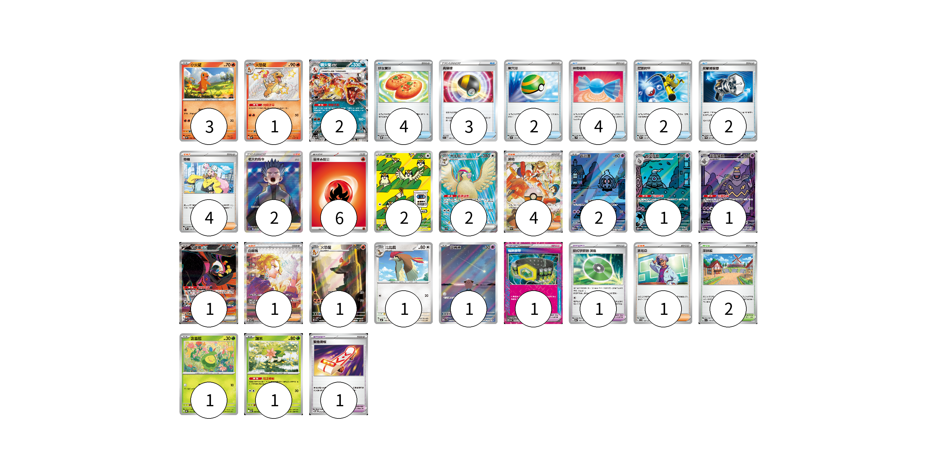 牌組構築方案 以此牌組為基礎新構築牌組 顯示卡面 顯示列表 寶可夢卡(20) 3 1 2 2 2 2 1 1 1 1 1 1 1 1 寶可夢道具(3) 1 1 1 物品卡(17) 4 3 2 4 2 2 支援者卡(12) 4 2 4 1 1 競技場卡(2) 2 能量卡(6) 6 寶可夢卡(20) 卡牌名稱 張數 卡牌名稱 張數 小火龍 SV2a 004/165 03 火恐龍 SV4a 211/190 01 噴火龍ex SV4a 115/190 02 波波 SV3 118/108 02 大比鳥ex SV3 128/108 02 夜巡靈 SV6a 068/064 02 彷徨夜靈 SV6a 069/064 01 黑夜魔靈 SV6a 070/064 01 吉雉雞ex SV6a 089/064 01 火恐龍 SV2a 169/165 01 比比鳥 SV4a 138/190 01 皮寶寶 SV3 113/108 01 含羞苞 SV8a 001/187 01 謝米 SV9a 006/063 01 寶可夢道具(3) 卡牌名稱 張數 卡牌名稱 張數 極限腰帶 SV8a 159/187 01 招式學習器 演進 SV8a 160/187 01 緊急滑板 SVOD 015/020 01 物品卡(17) 卡牌名稱 張數 卡牌名稱 張數 好友寶芬 SV5K 063/071 04 高級球 S9 089/100 03 巢穴球 SV1S 070/078 02 神奇糖果 SV1V 072/078 04 厲害釣竿 SV2P 066/071 02 反擊捕捉器 SV4M 059/066 02 支援者卡(12) 卡牌名稱 張數 卡牌名稱 張數 奇樹 SV2D 069/071 04 老大的指令(赤日) S12a 250/172 02 派帕 SV4a 353/190 04 白蕾雅 SV7 132/102 01 吉尼亞 SVD 129/139 01 競技場卡(2) 卡牌名稱 張數 卡牌名稱 張數 深缽鎮 SV1a 070/073 02 能量卡(6) 卡牌名稱 張數 卡牌名稱 張數 基本火能量 sv-p FIR 06 以此牌組為基礎新構築牌組 牌組編碼 JQsQHc-rfpLBN-feUeAu copy 列印牌組單 牌組編碼已複製 分享至SNS